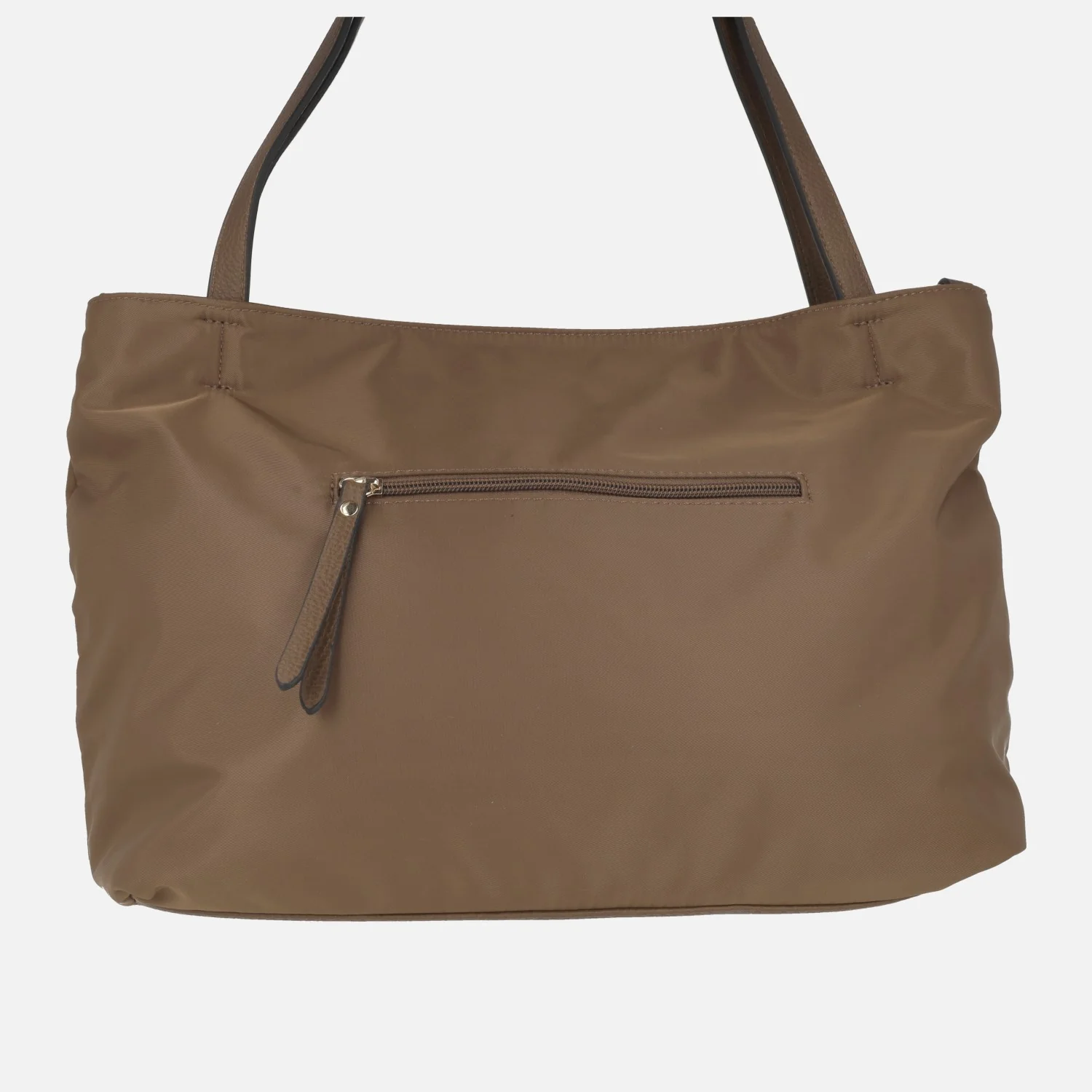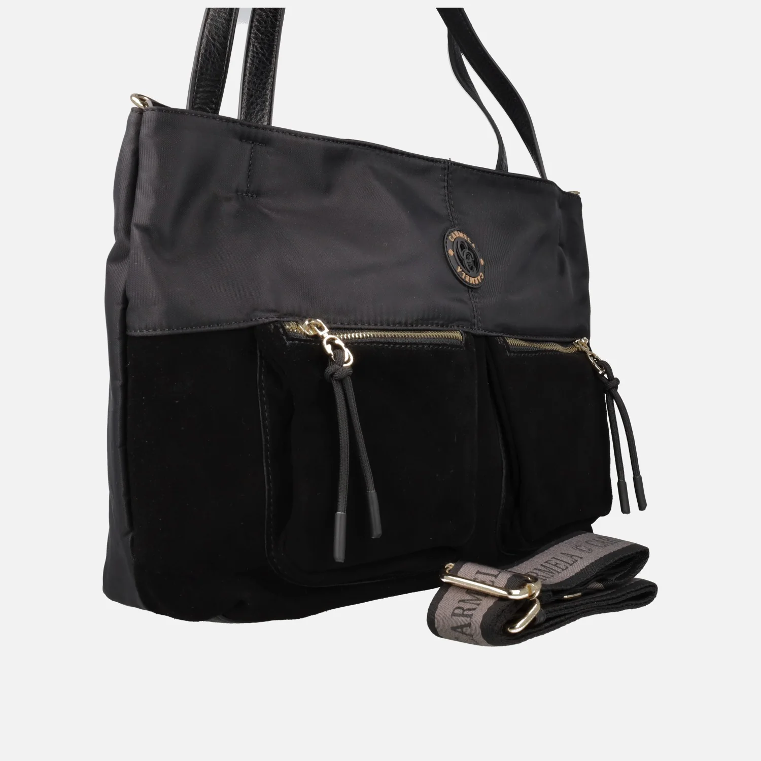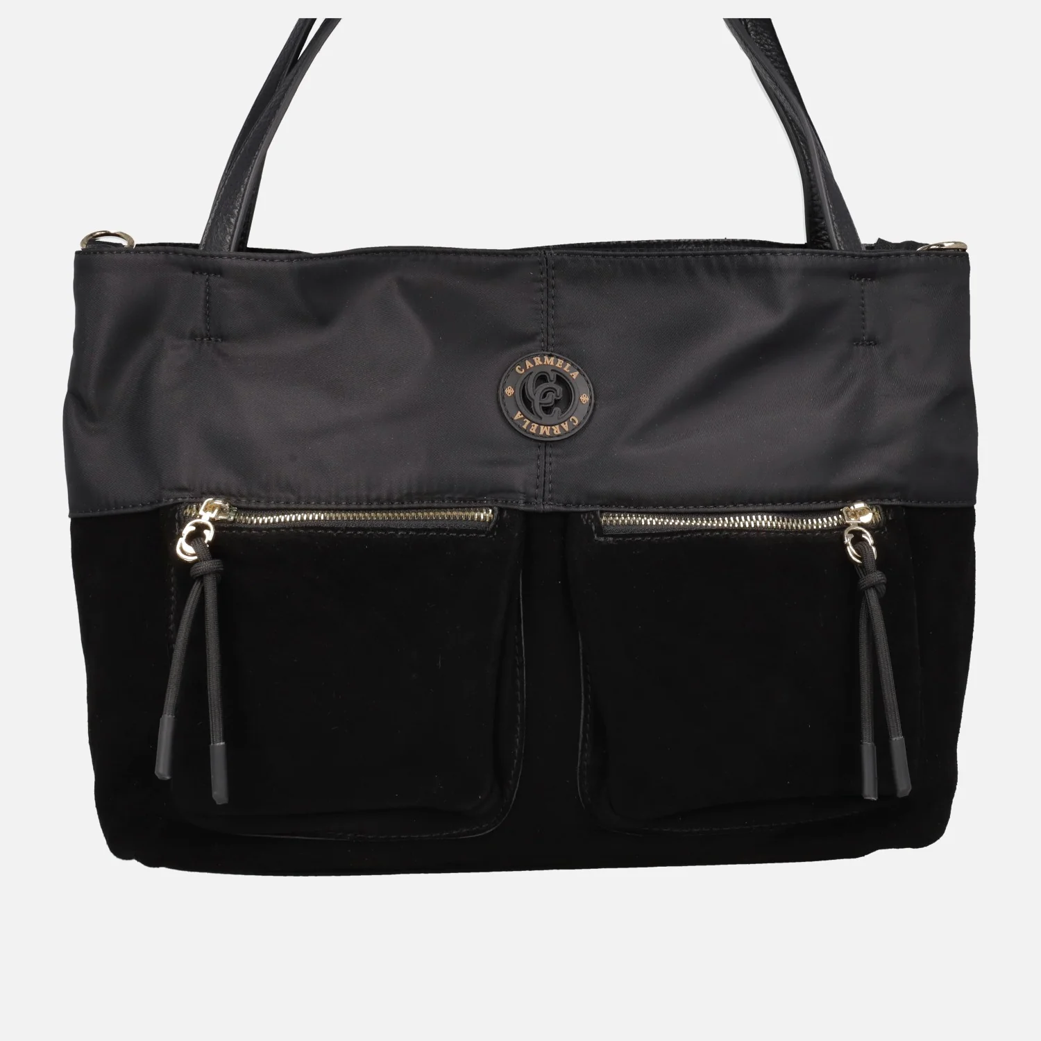 Bolsos nueva colección Carmela shoes, modelo 186116, disponibles en camel y en negro. Bolsos multi posición, gracias a sus dos asas fijas en la parte superior para llevar al hombro, así como un asa bandolera regulable para cruzar. Bolsos de gran capacidad, elaborados en combinado de piel serraje, tejido y sintéticos. Cierre principal de cremallera. Dos bolsillos pequeños delanteros con cremallera. Bolsillo trasero con cremallera. Interior textil, también con bolsillos. Asa bandolera ajustable entre 46 cms y 80 cms (altura al hombro). Medidas: 25 cms de alto x 37 cms de ancho x 10 cms de fondo.