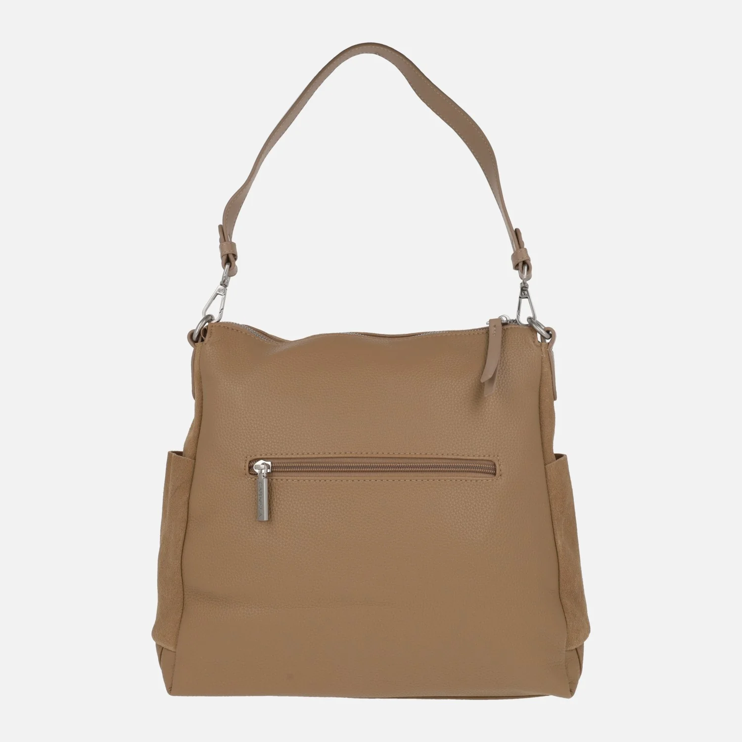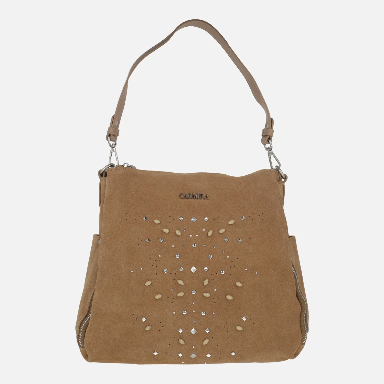 Preciosos bolsos multi posición de la marca Carmela shoes modelo 186204 camel. Bolsos elaborados en piel serraje combinado con sintéticos. La parte frontal está fabricada en piel serraje con detalle de tachas metálicas y pedrería. Bolsillo trasero con cremallera. Cierre principal con cremallera. Interior textil con dos bolsillos, uno con cremallera. Dos asas disponibles: una más corta para llevar al hombro y otra más larga para bandolera, ajustable con hebilla. Bolsillos laterales con cremallera en la parte delantera. Medidas: 31 cm de alto x 31 cm de ancho inferior x 27 cm de ancho superior x 9 cm de fondo.