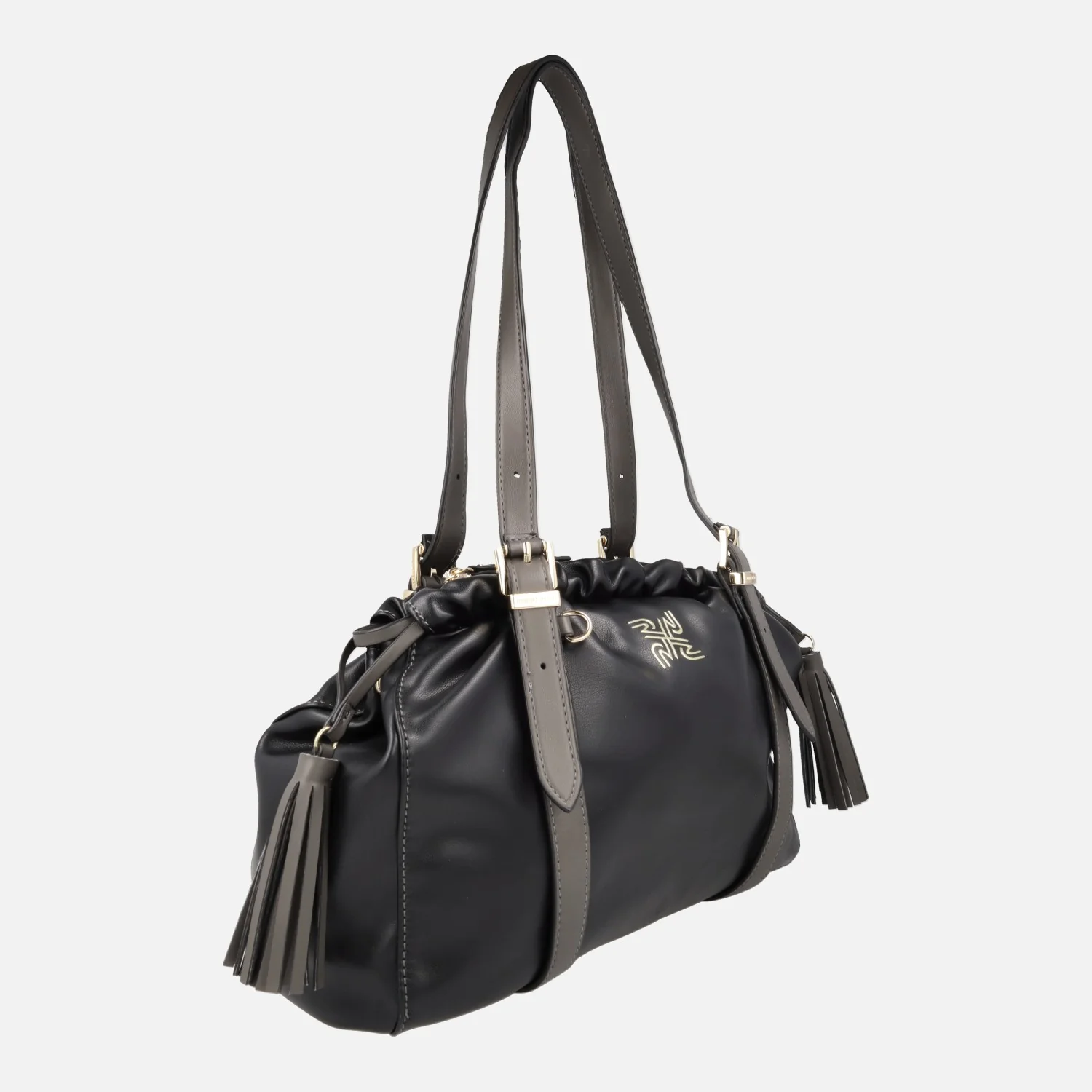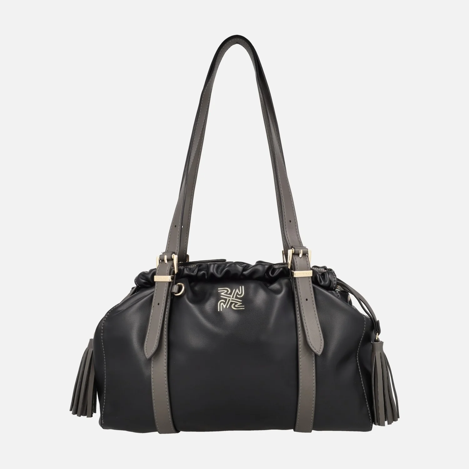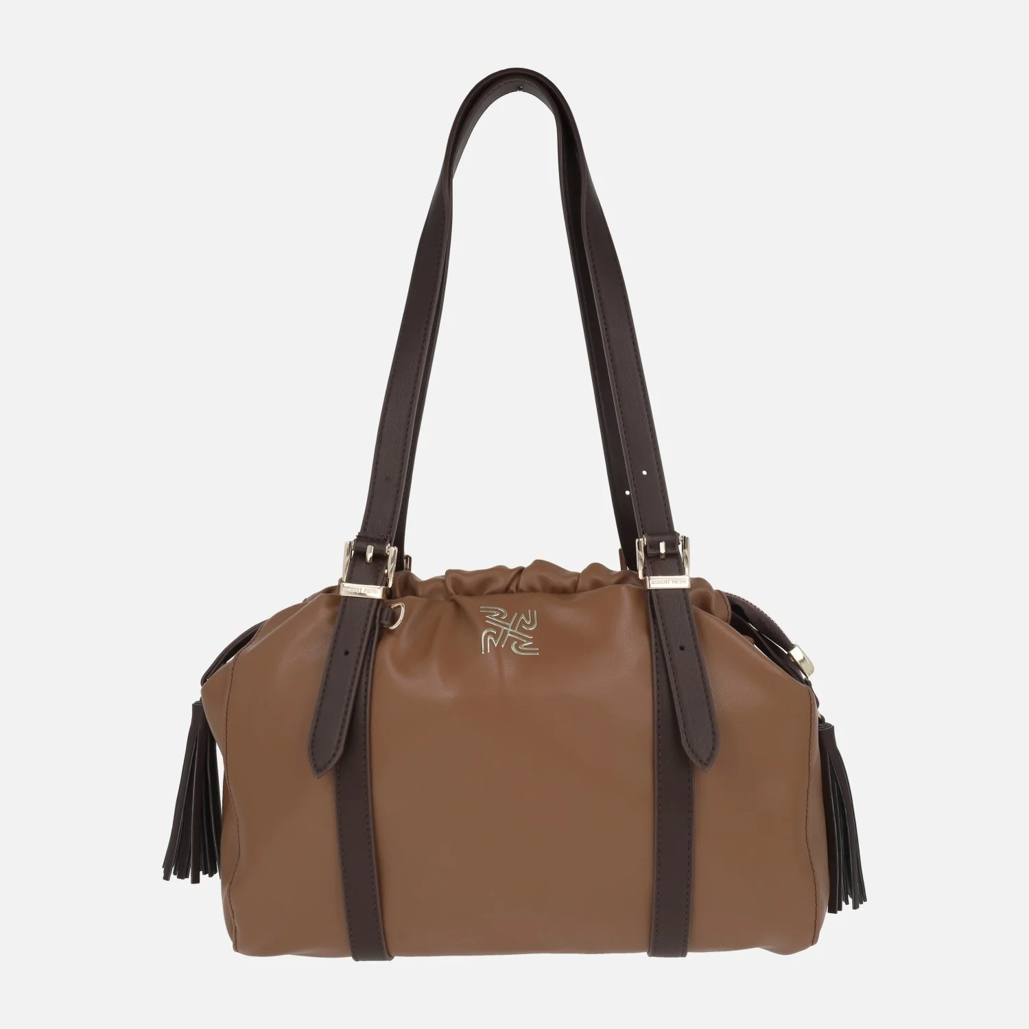 Preciosos y elegantes bolsos de la marca Robert Pietri modelo Bali 05616, en negro y en cuero. Bolsos elaborados en materiales sintéticos efecto piel. Cierre de cremallera. Cintas para fruncir. Borlas a los lados. Interior textil con bolsillos interiores. Dos asas ajustables para llevar al hombro. Medidas: 24 cm de alto x 32,5 cm de ancho x 11 cm de fondo.