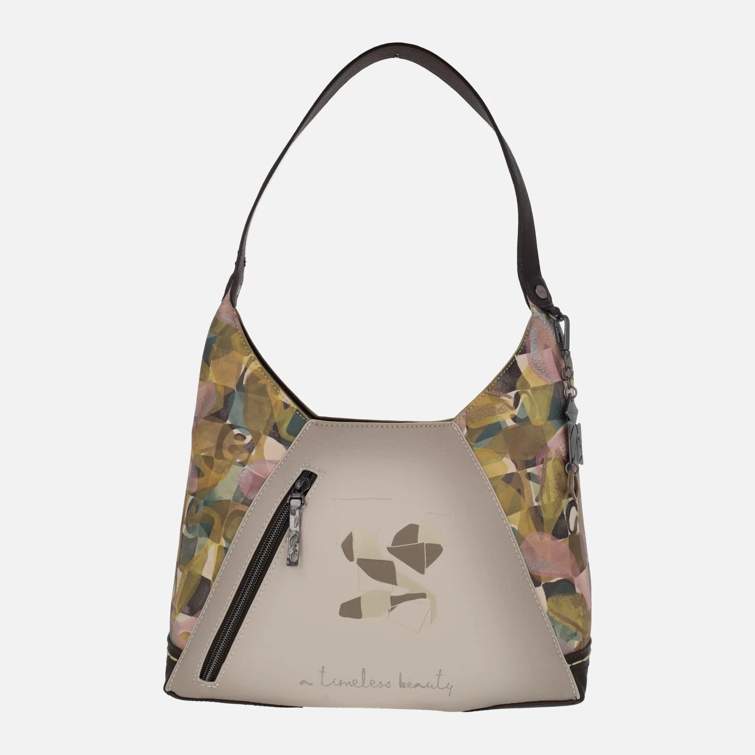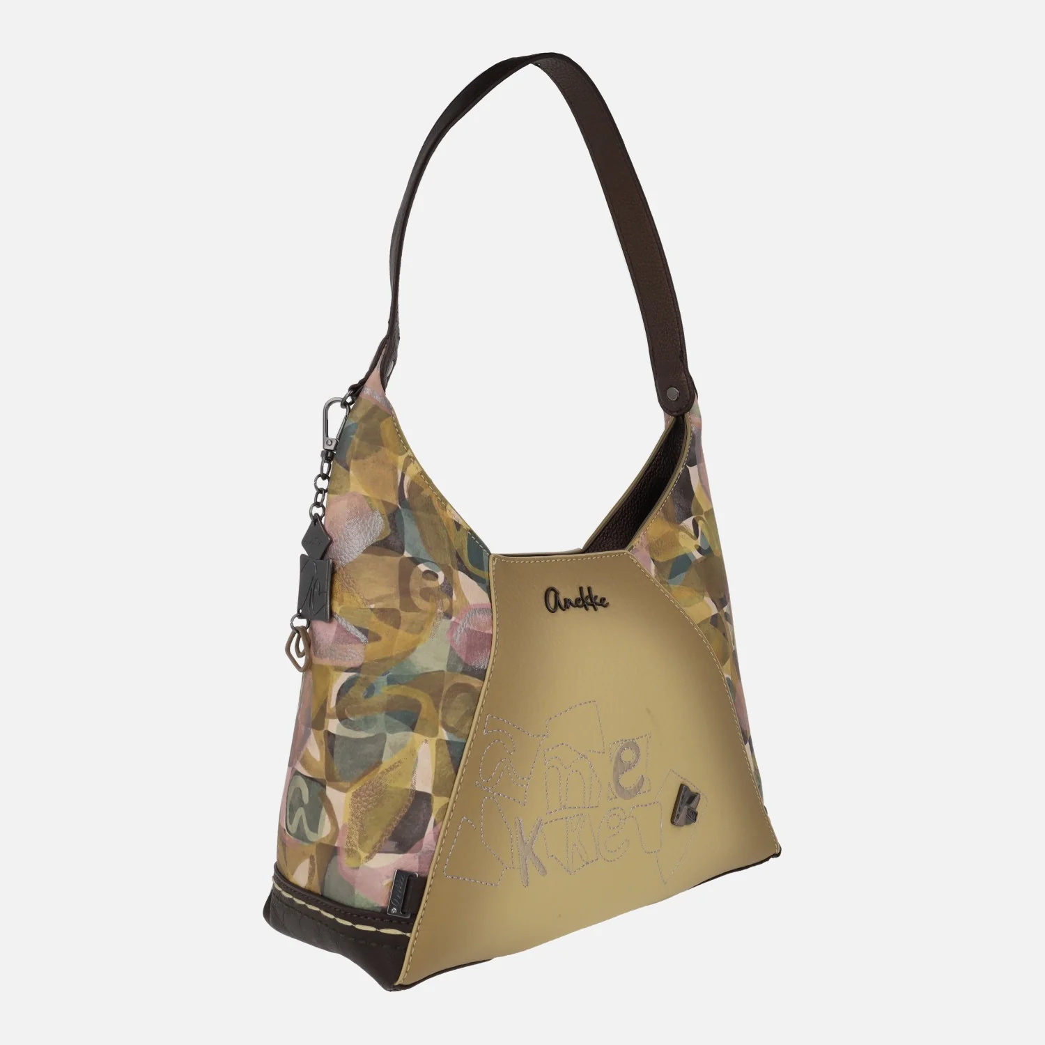Bolsos para hombro de la marca Anekke modelo 42722-391. Bolsos con exterior en materiales sintéticos (100% poliuretano), en tonos mostaza, beige y estampados. Bolsillo trasero con cremallera. Cierre central de cremallera. Interior textil con dos bolsillos, uno con cremallera. Asa al hombro. Medidas aproximadas: 26 cm de alto lateral x 20 cm de alto central x 28 cm de ancho x 11 cm de fondo.