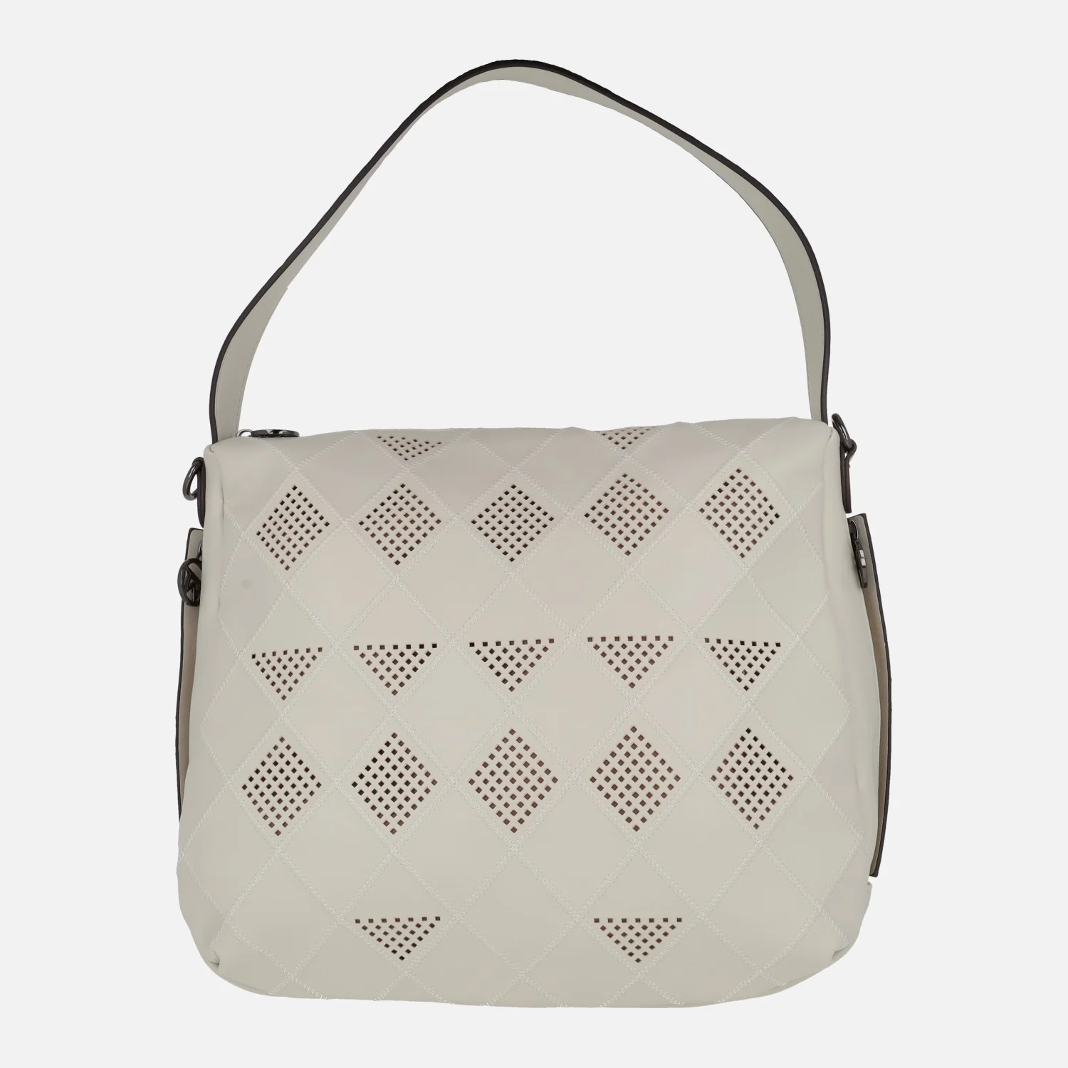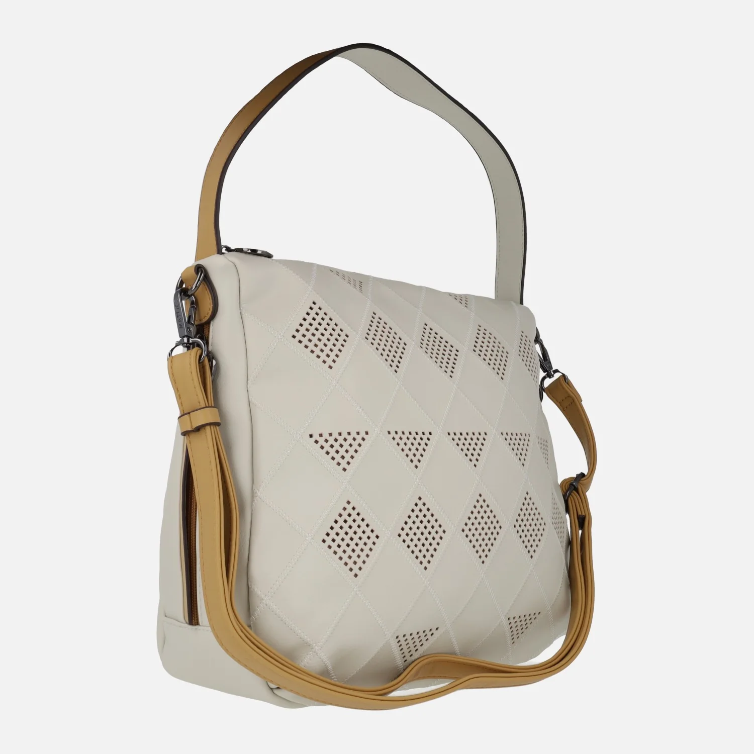 Bolsos Alhama 20847 beige de la marca Matties bags. Bolsos con frontal haciendo dibujos troquelados, elaborados en materiales sintéticos (polipiel) con acabado piel. Asa para hombro y asa bandolera ajustable. Cierre principal con cremallera. Varios bolsillos con cremallera para llevar todo organizado. Interior textil. Medidas: 28 cm de alto x 32 cm de ancho x 10 cm de fondo.