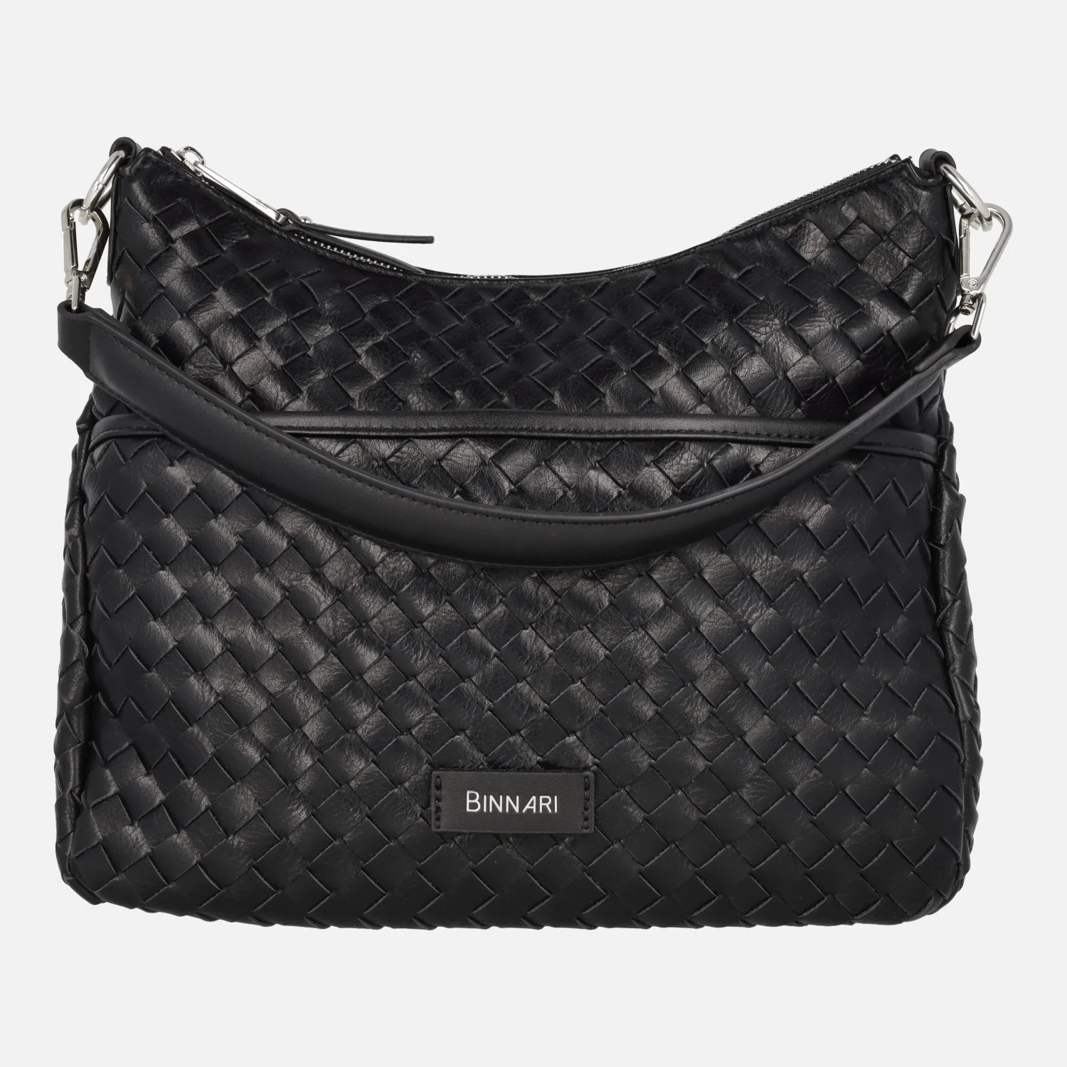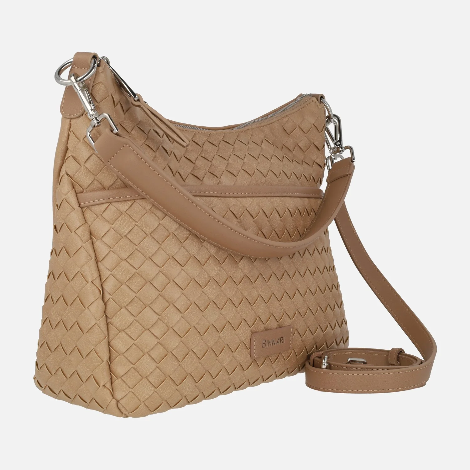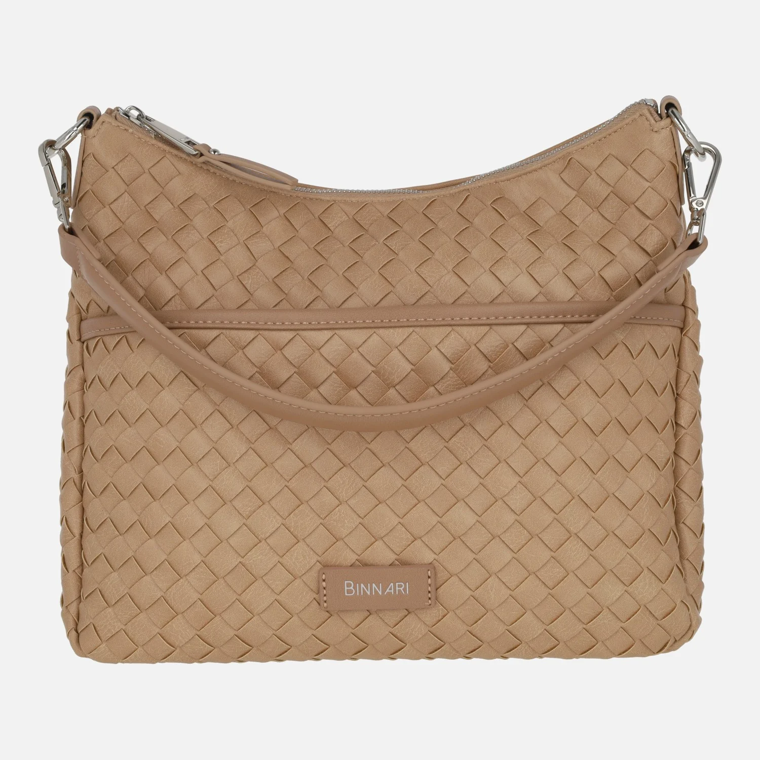 Bolsos trenzados de la marca Binnari modelo 20662, disponibles en camel y en negro. Bolsos elaborados en materiales sintéticos con cierre de cremallera central. Bolsillos delantero y trasero con cremallera. Interior textil con bolsillos, uno de ellos con cremallera. Asa para hombro de 25 cm de altura y además un asa bandolera ajustable entre 42 y 52 cm al hombro. Medidas: 23 cm de alto central x 26 cm de alto en los laterales x 30 cm de ancho x 11 cm de fondo.