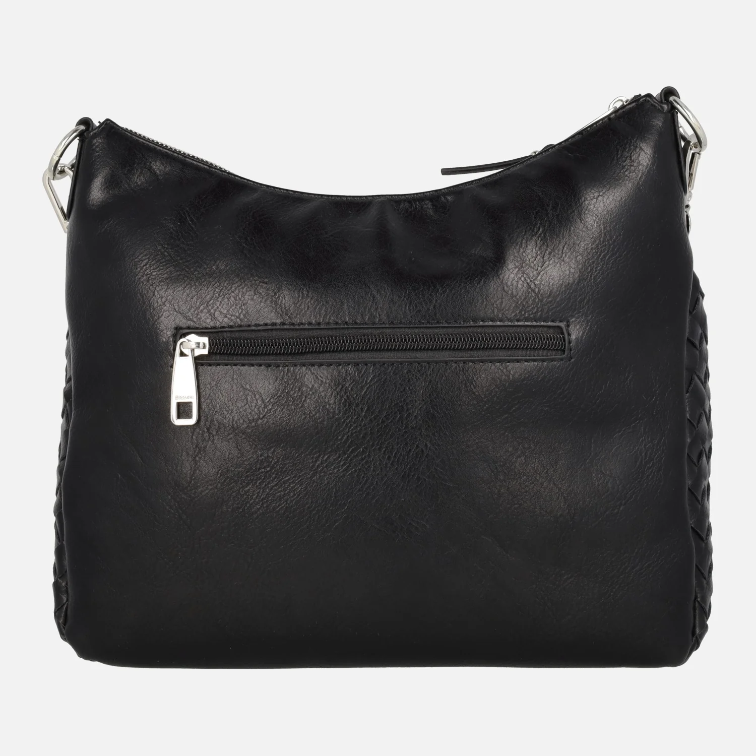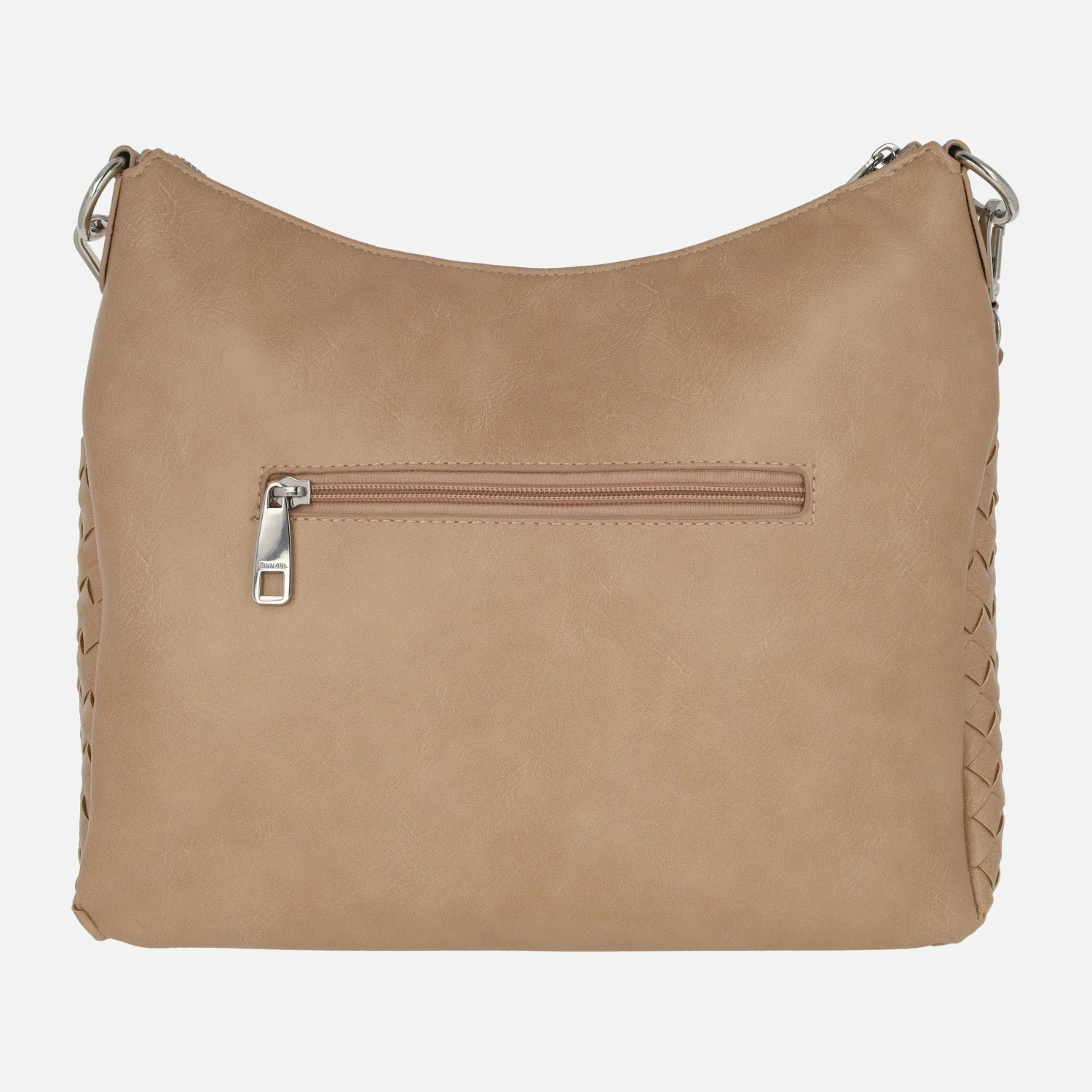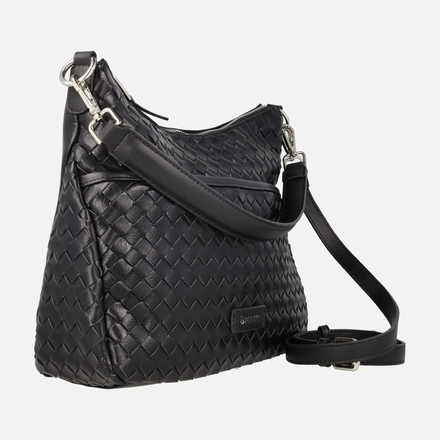 Bolsos trenzados de la marca Binnari modelo 20662, disponibles en camel y en negro. Bolsos elaborados en materiales sintéticos con cierre de cremallera central. Bolsillos delantero y trasero con cremallera. Interior textil con bolsillos, uno de ellos con cremallera. Asa para hombro de 25 cm de altura y además un asa bandolera ajustable entre 42 y 52 cm al hombro. Medidas: 23 cm de alto central x 26 cm de alto en los laterales x 30 cm de ancho x 11 cm de fondo.