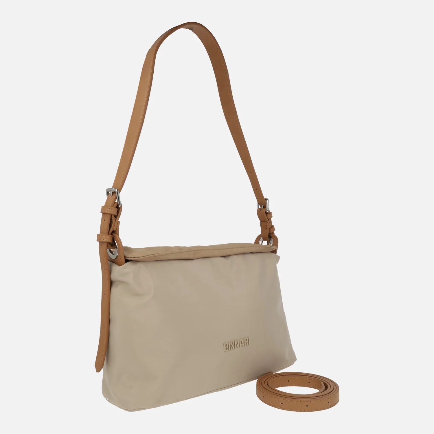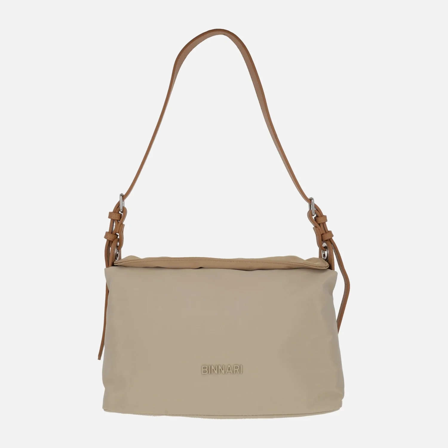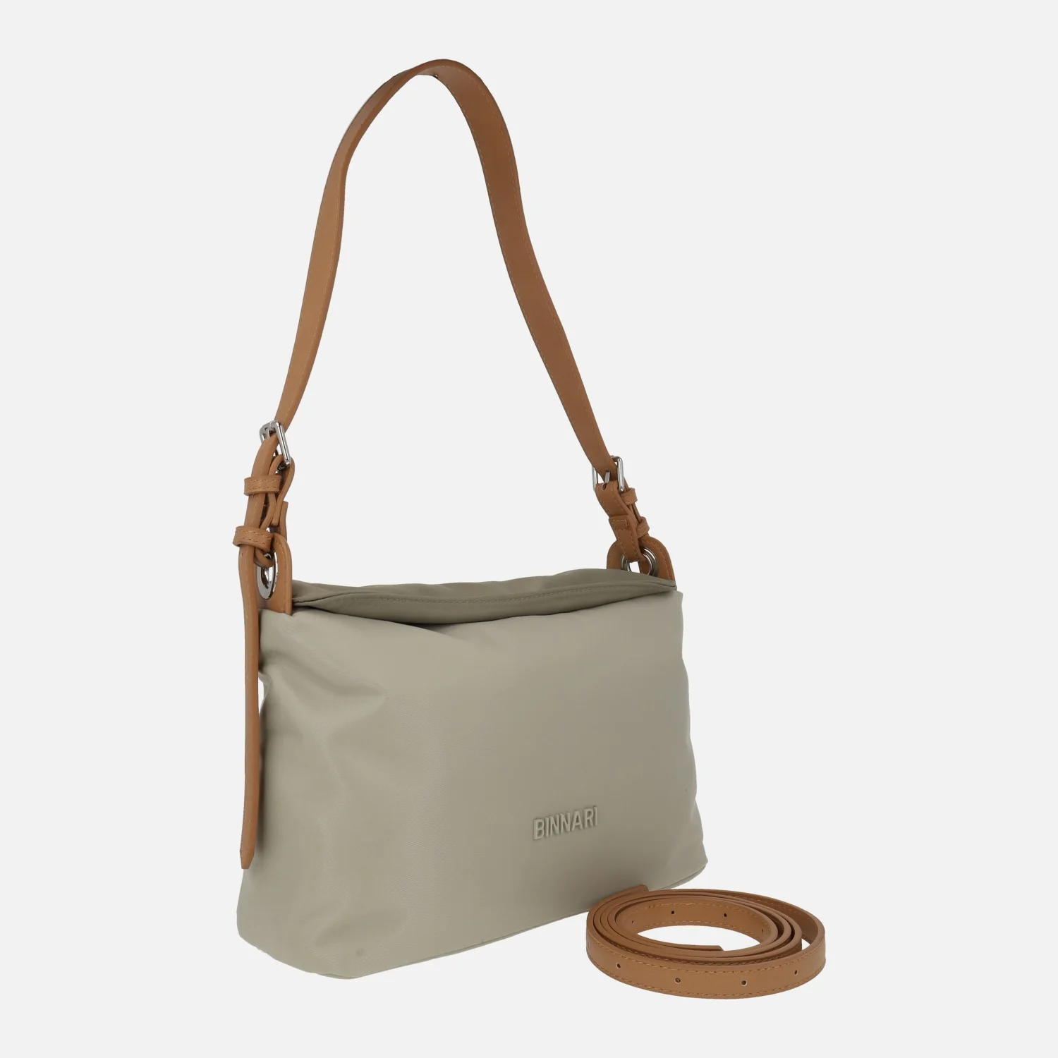Bolsos para hombro de la marca Binnari modelo 20984 disponibles en piedra/arena y salvia/kaki. Bolsos elaborados en tejido nylon, con cierre de tapa imantada y cremallera. Bolsillo trasero con cremallera. Interior textil con dos bolsillos, uno con cremallera. Asa para hombro y además un asa más larga ajustable con hebilla para llevar de bandolera. Medidas aproximadas: 18 cm de alto x 29 cm de ancho x 9 cm de fondo.