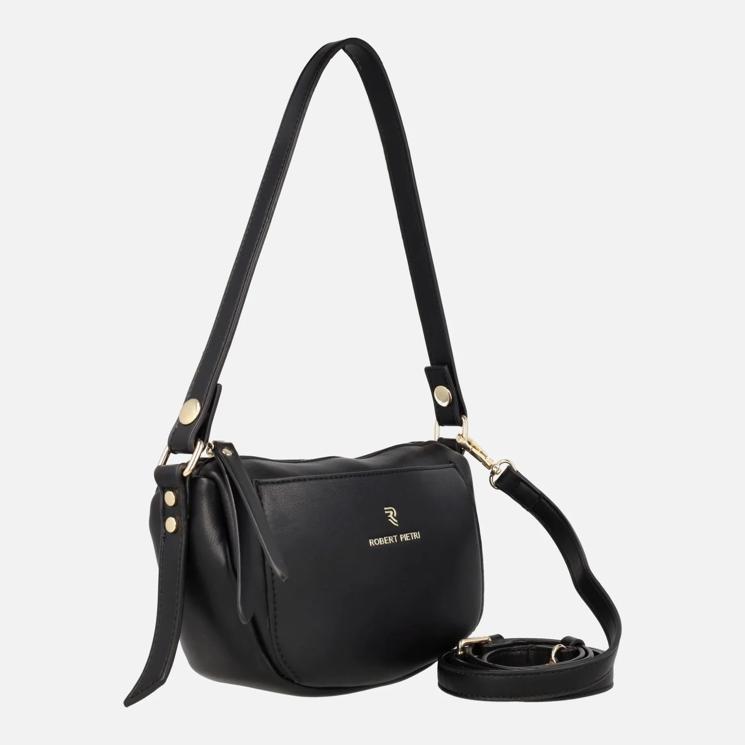 Bolsos Robert Pietri 05317 Negro. Bolsos elaborados en materiales sintéticos con apariencia de piel. Cierre principal con cremallera. Bolsillo trasero con cierre de cremallera y bolsillo delantero abierto. Interior textil con bolsillos. Dos asas extraíbles para llevar a su gusto: Una más larga, ajustable hasta 63 cm al hombro (para llevar cruzado) y otra más corta para llevar colgado al hombro. Medidas: 15 cm de alto x 17,5 cm ancho inferior x 22 cm ancho superior x 9 cm de fondo.