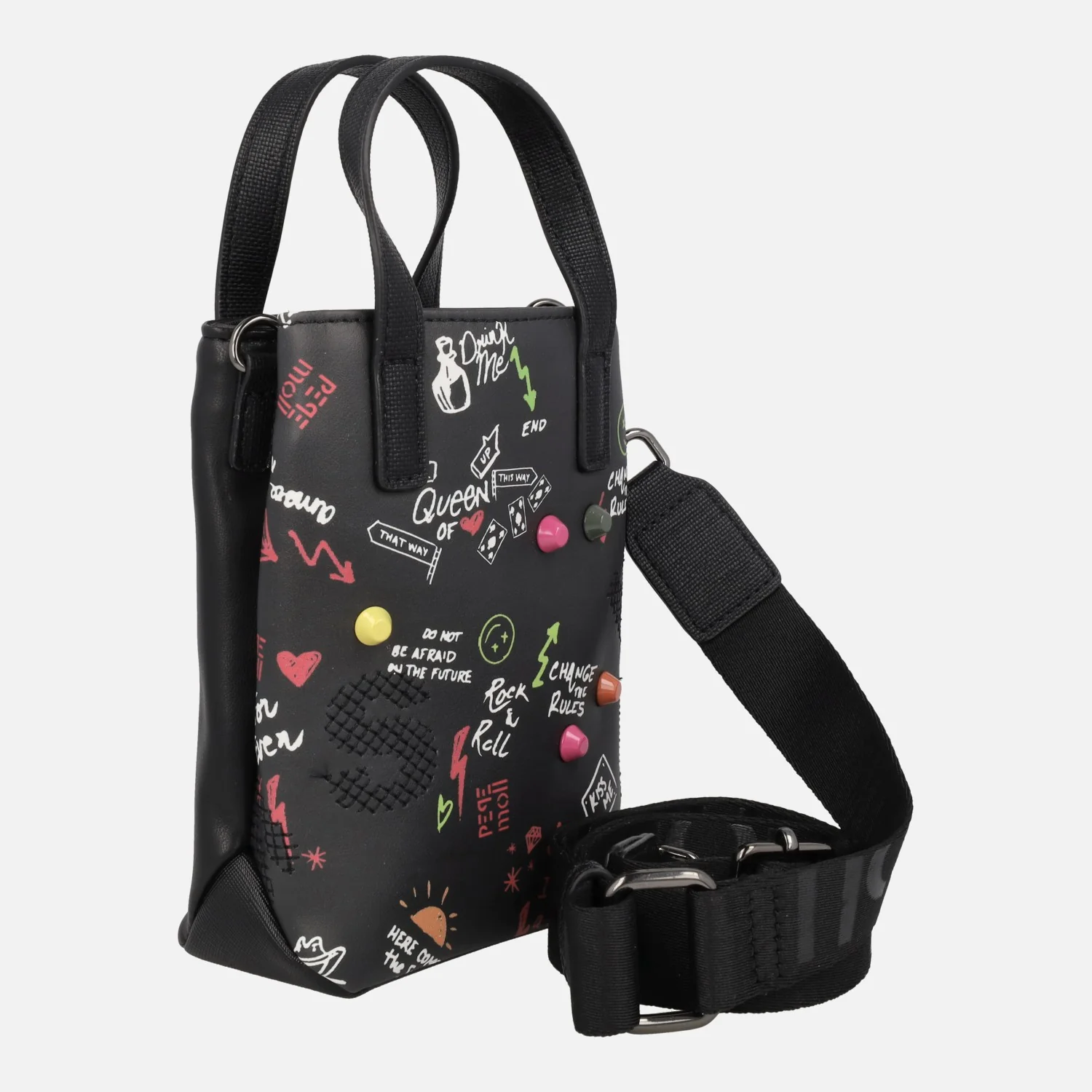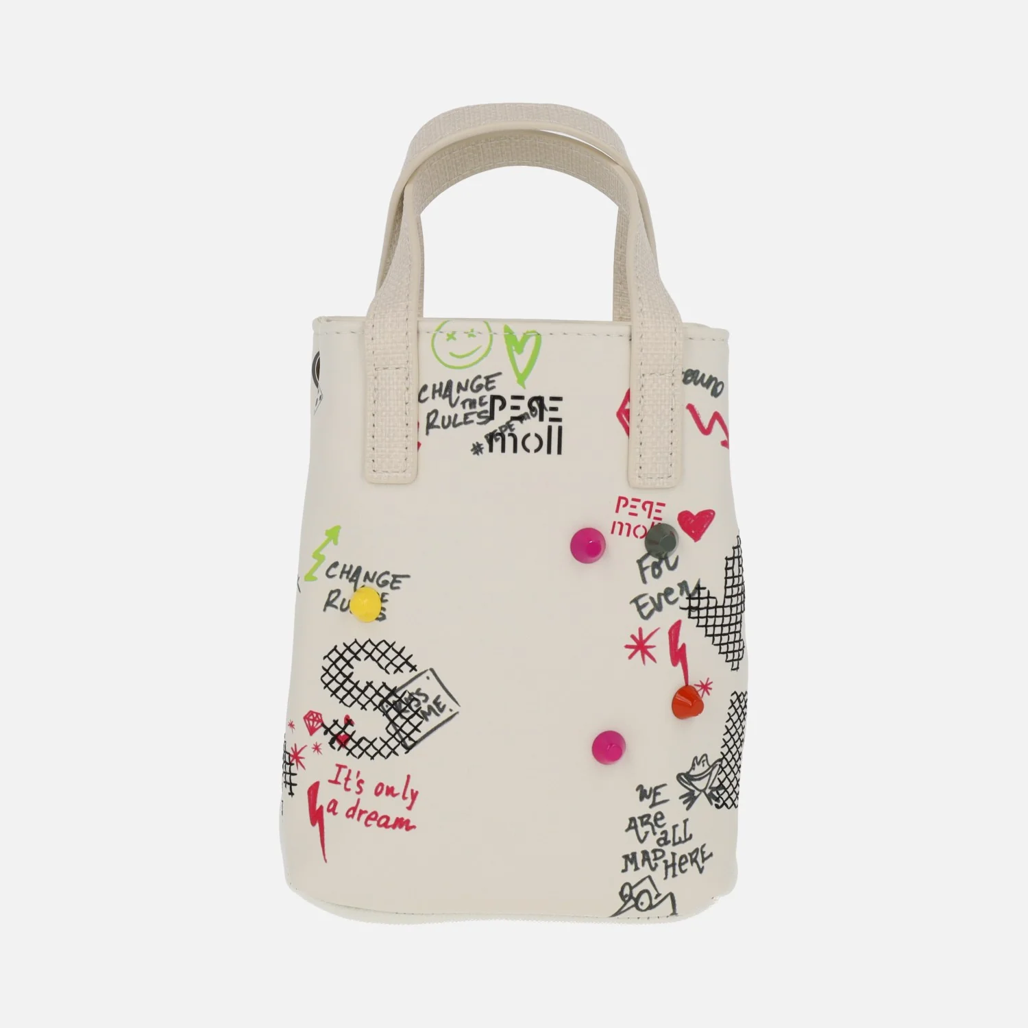 Mini bolsos de la marca Pepe moll modelo 261231 en shirley black y shirley off. Bolsos pequeños elaborados en materiales sintéticos (poliuretano) con detalle de tachas de colores y graffity. Dos compartimentos, uno con cierre de broche imantado y otro con cremallera. Interior textil. Dos asas fijas de mano y un asa bandolera ajustable. Medidas: 17,5 cm de alto x 12 cm de ancho x 6 cm de fondo.