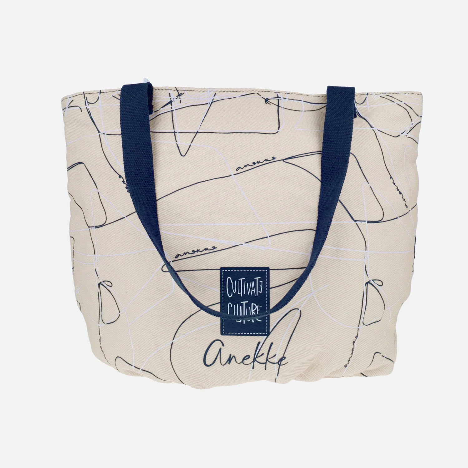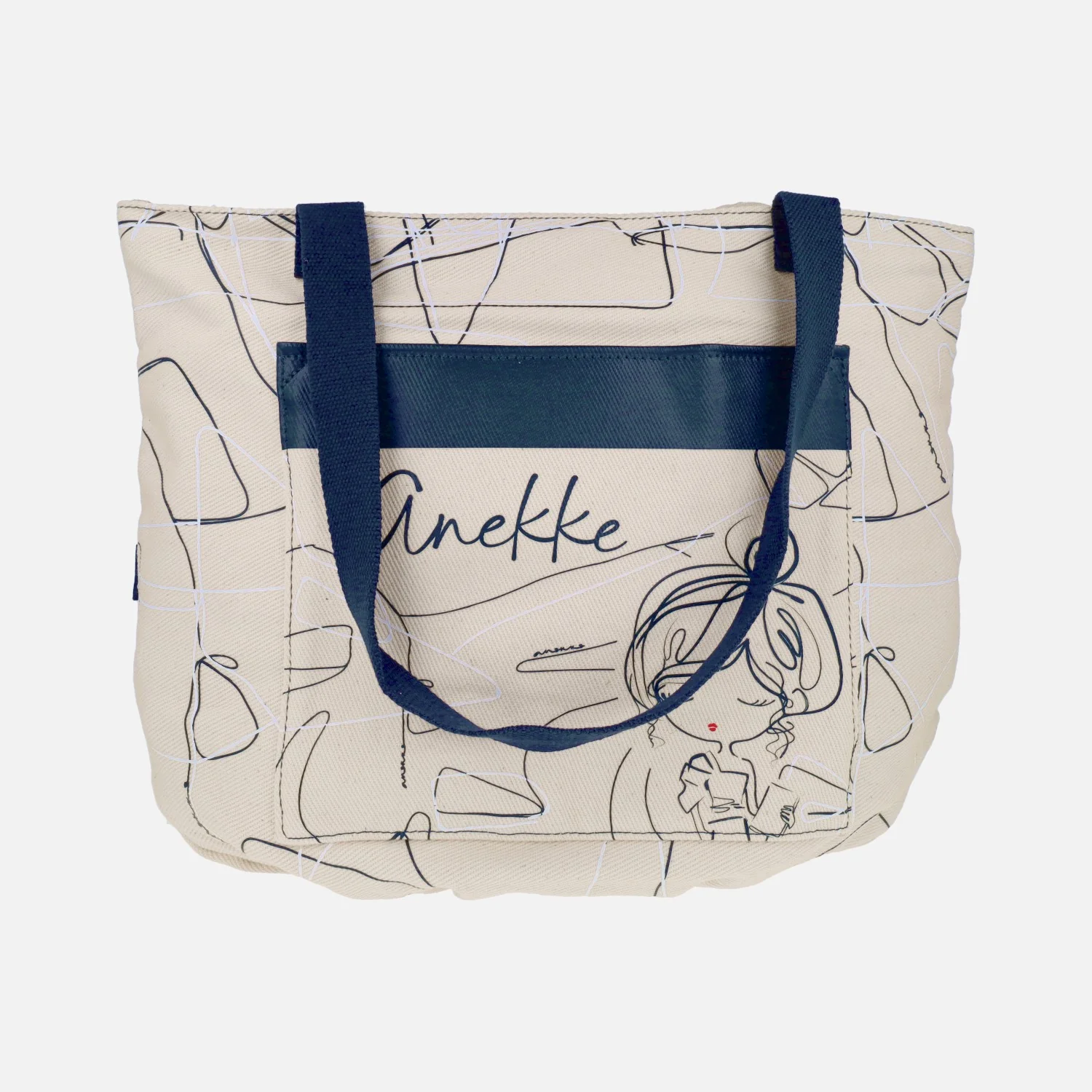 Bolsos de playa/viaje de la marca Anekke modelo 42494-232 Sophia. Bolsas elaboradas en tejido beige 100% algodón. Detalles en azul marino. Cierre principal con cremallera. Bolsillo trasero. Interior en tejido algodón. Dos asas fijas al hombro. Medidas: 33 cm de alto x 44 cm de ancho x 14,5 cm de fondo.