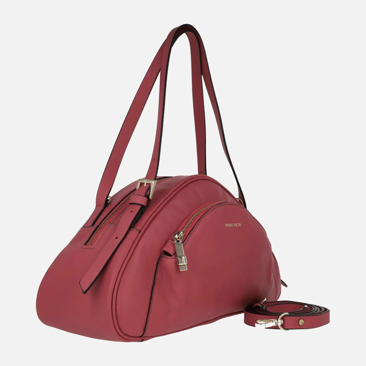 Bolsos de piel de la marca Robert Pietri modelo 01151 Banana. Bolsos de piel con forma triangular y cierre de cremallera. Color rojo. Bolsillo en la parte delantera con cierre de cremallera. Dos asas ajustables con hebilla, de una altura de 22 cms al hombro. Asa para llevar de bandolera, extraíbles y ajustable con hebilla, a un máximo de 62 cms. Interior textil con dos bolsillos, uno de ellos con cremallera. Medidas: Alto en la parte más alta 20 cms x 33,5 cms de ancho inferior x 13 cms de fondo. Made in Spain.