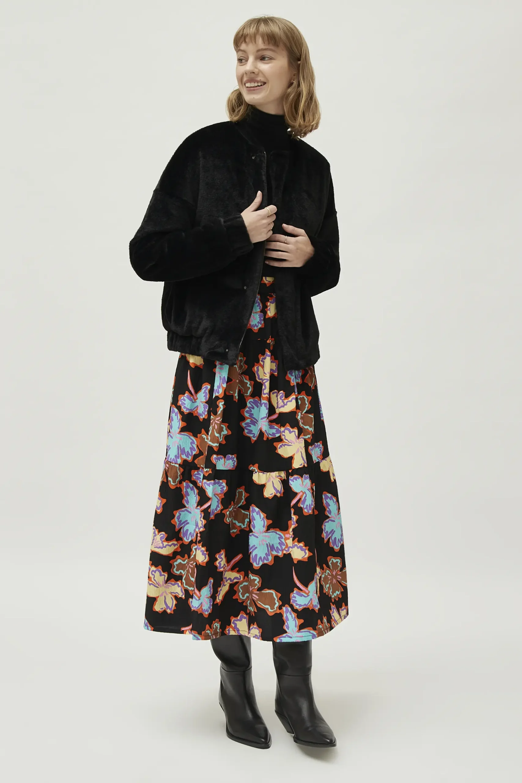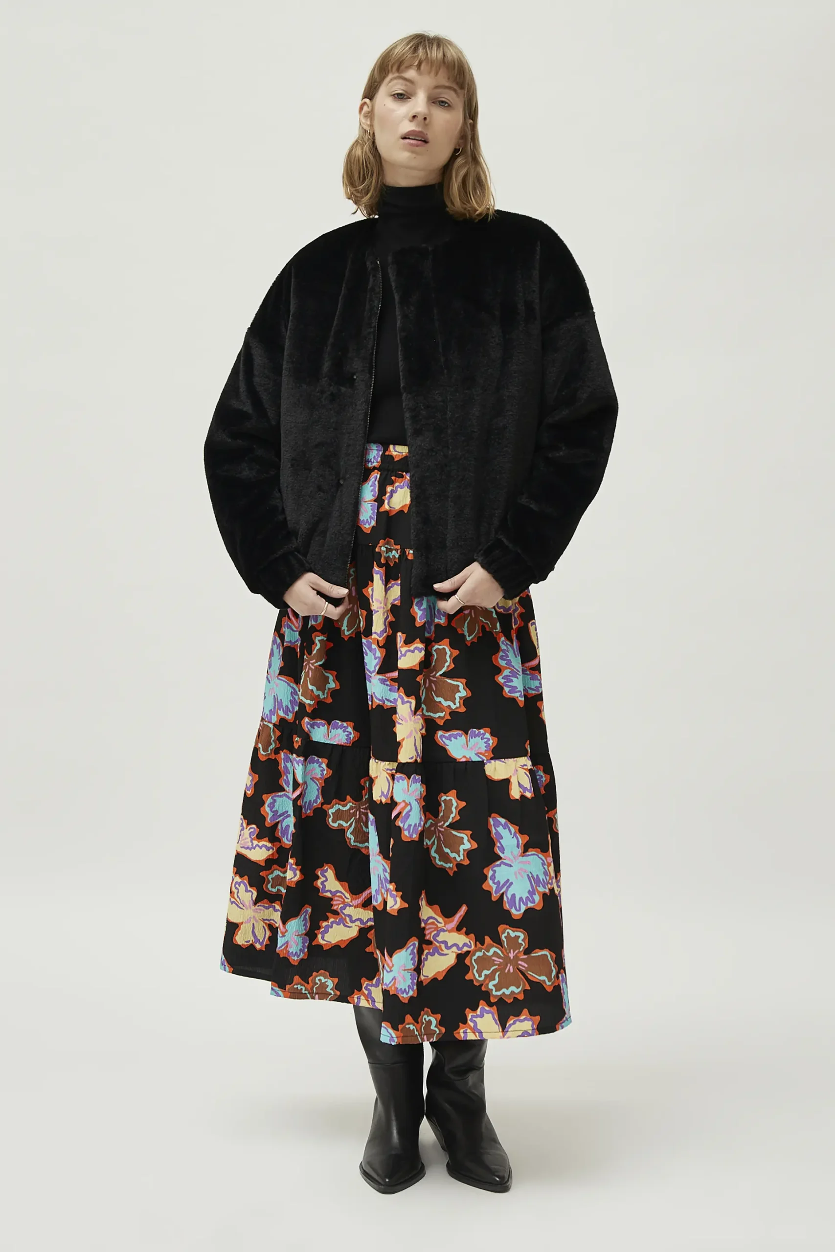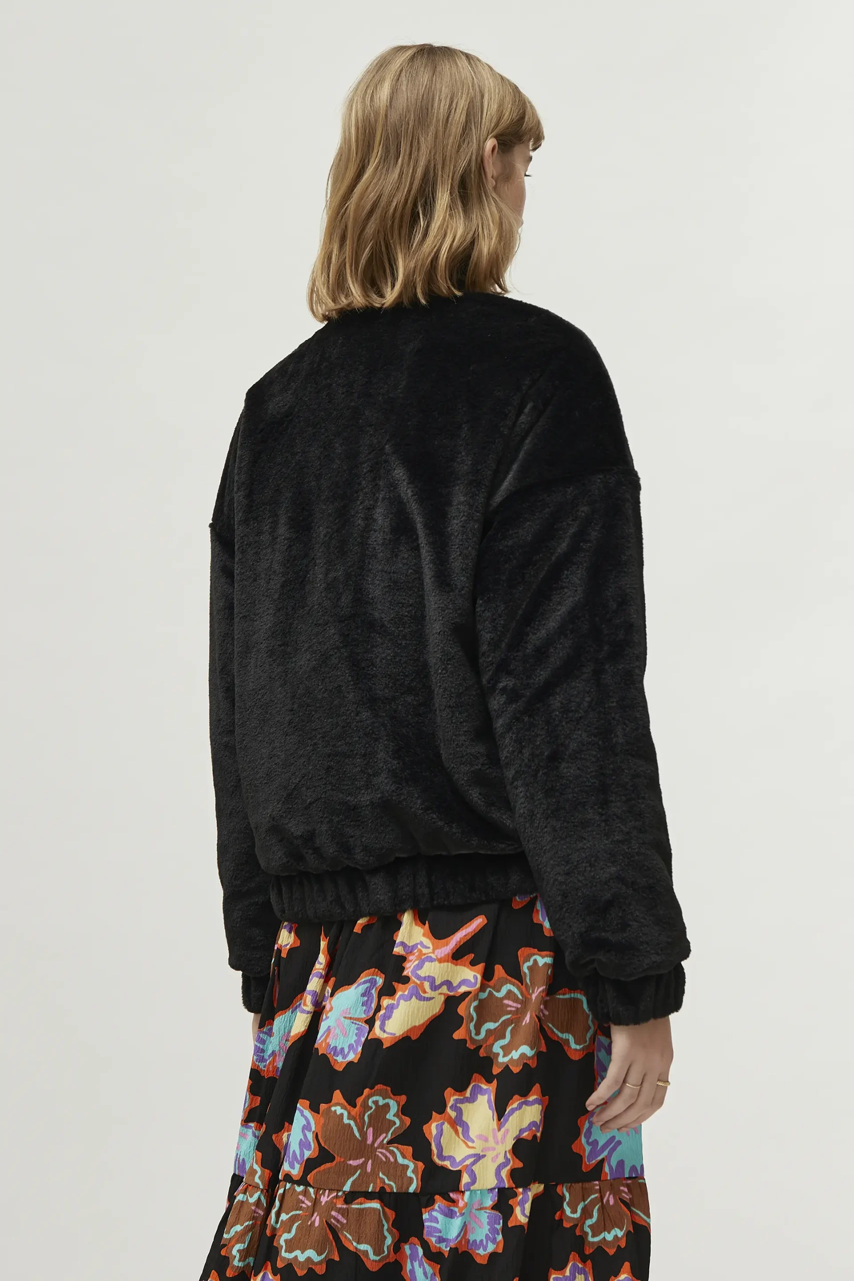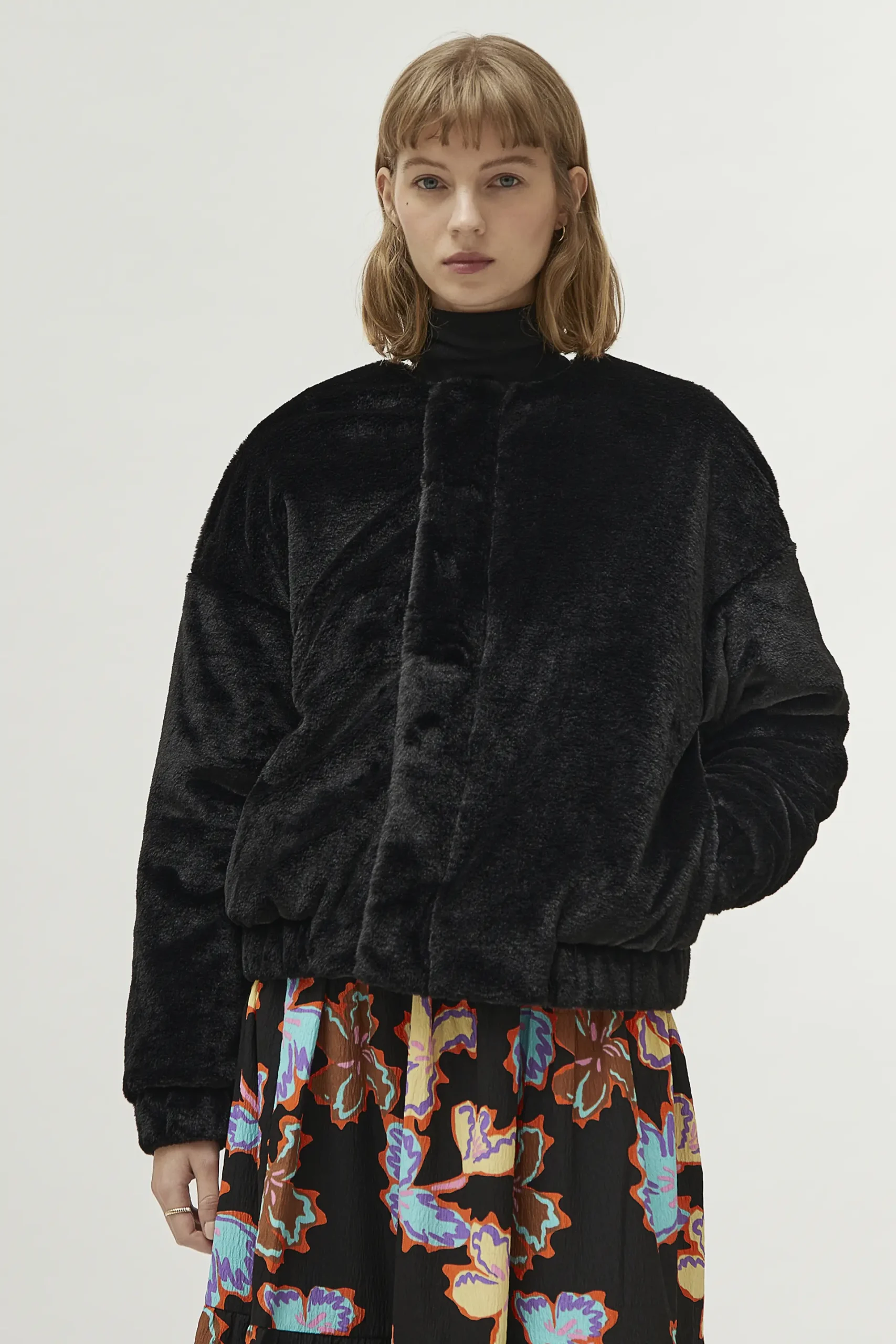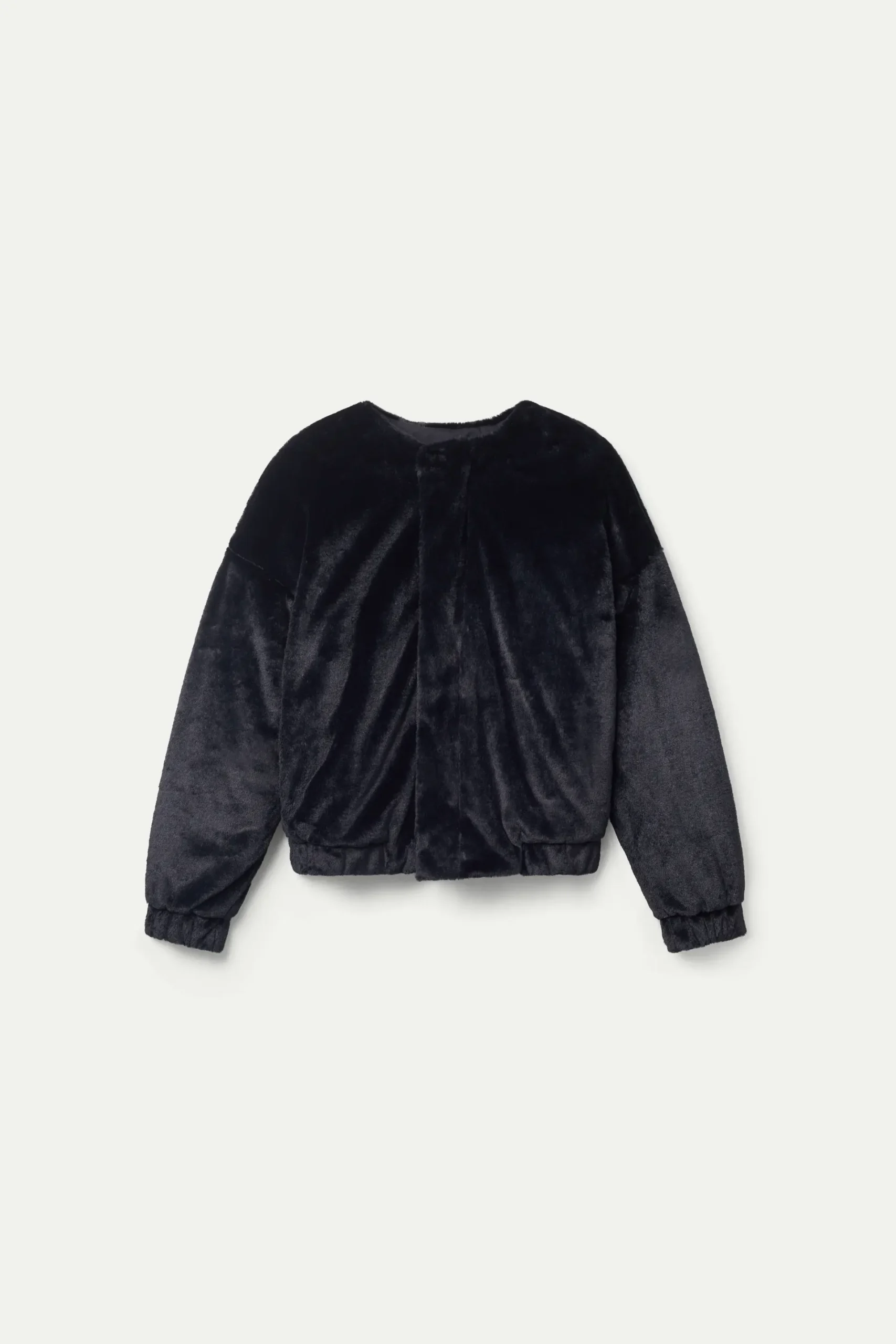 Bomber de pelo sintético de color negro. Con cuello redondo y manga larga terminada en puño elástico. Cierre frontal con cremallera y bolsillos laterales. Forro interior. La modelo mide 177 cm y lleva la talla S.
