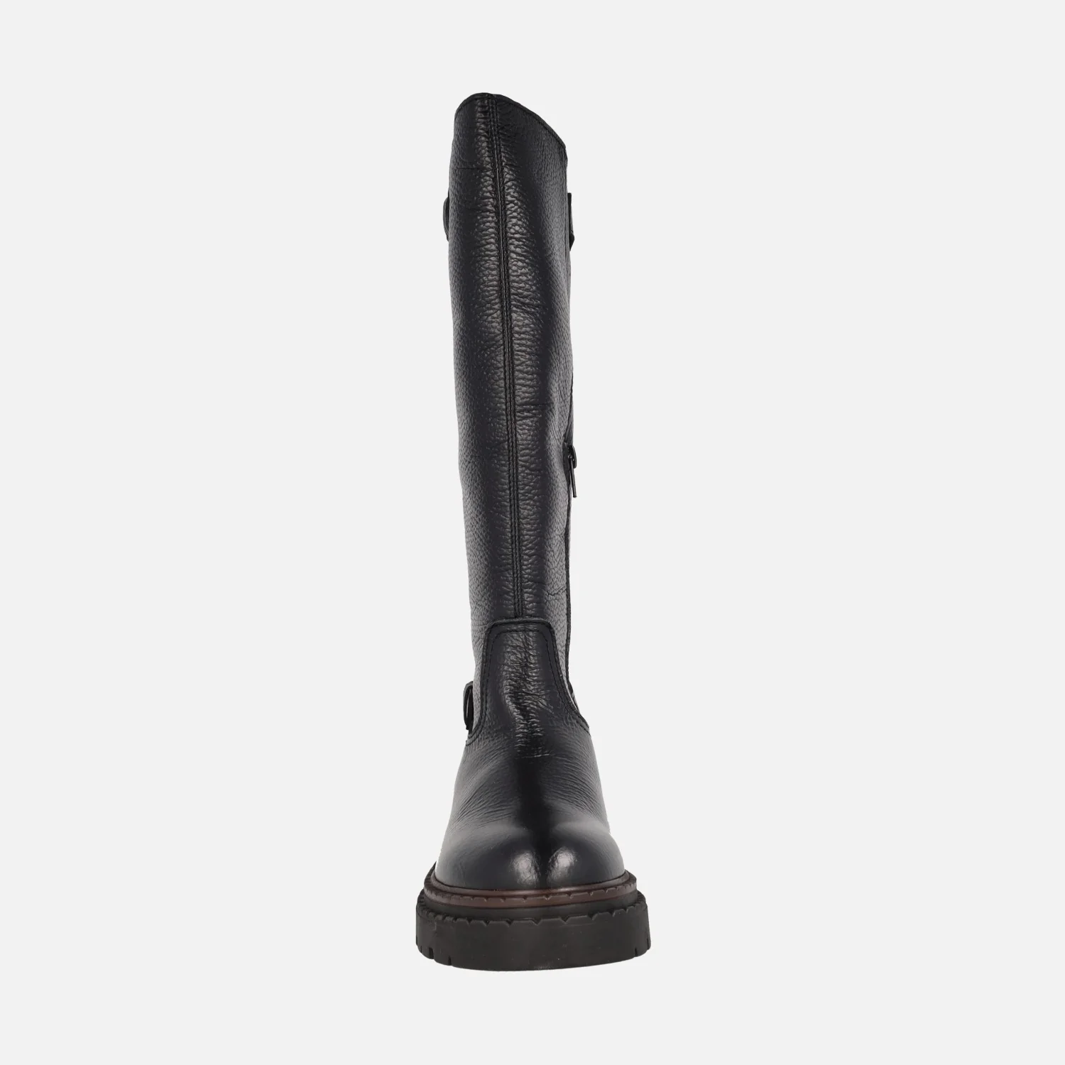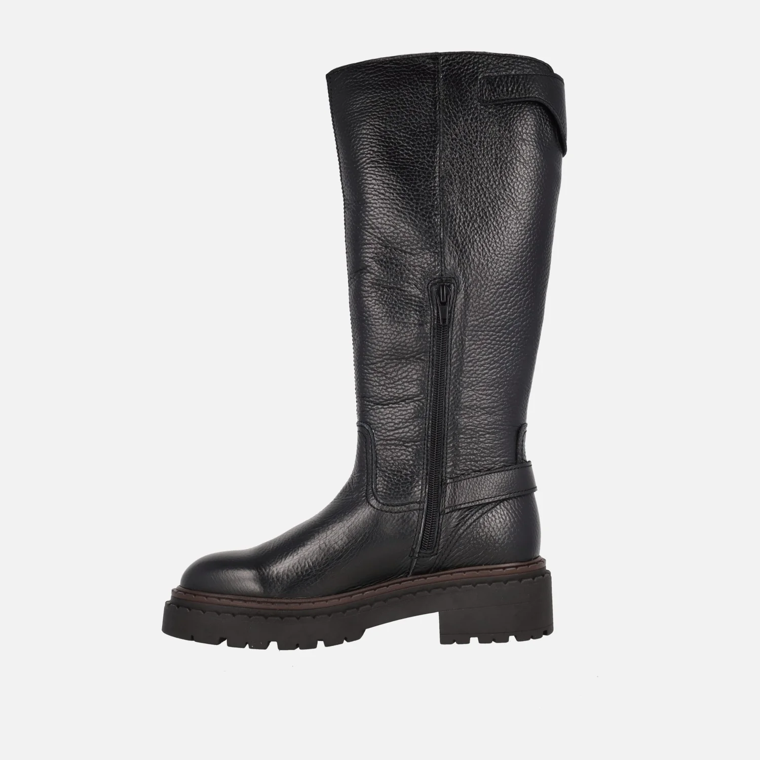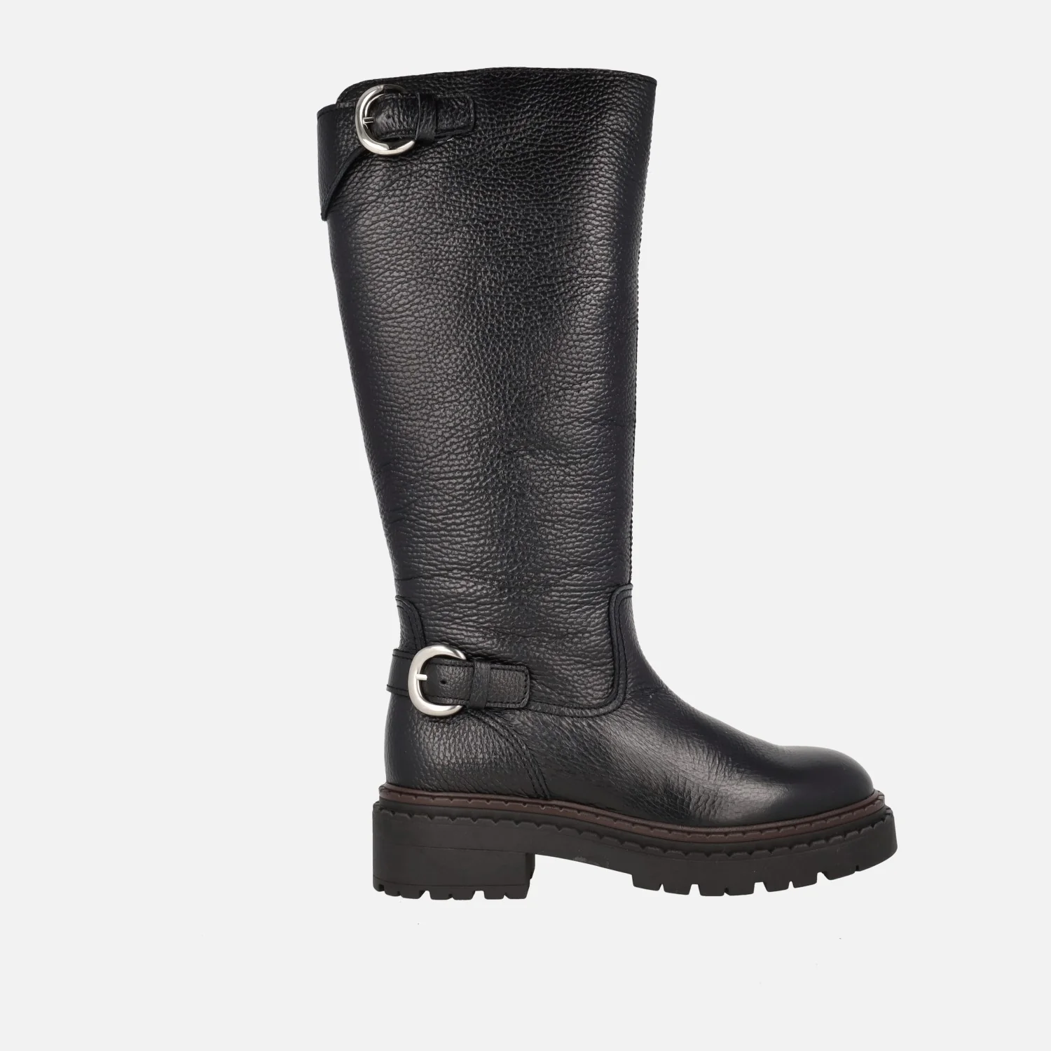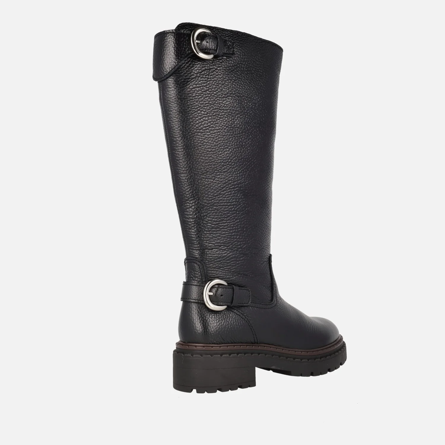 Botas altas modelo Cecilia de la marca Lol shoes. Botas altas negras de piel, con cierre de cremallera a media caña en el lado interior. Detalle de dos hebillas metálicas plaeteadas. Interior mixto en piel y tejido. Caña de 34 cm de altura. Piso sintético con 4,5 cm de altura trasera (2,5 cm parte delantera).