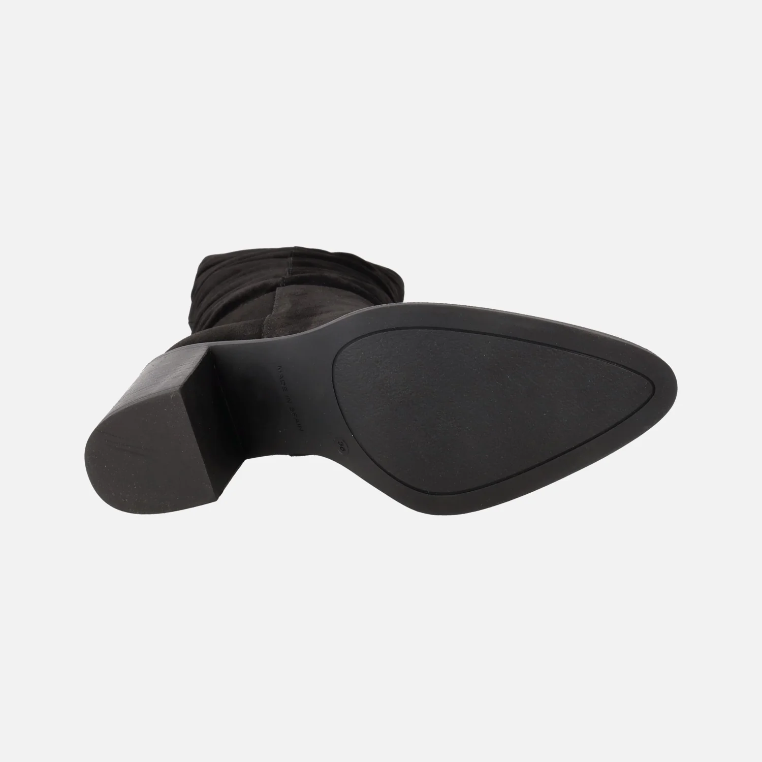 Botas altas Alpe Camden 5219, disponibles en baby silk negro o baby silk mustang (marrón). Botas altas elaboradas en piel serraje con caña arrugada. Interior textil. Piso sintético, con tacones altos de 8,5 cm de altura. Caña de aproximadamente 33 cm. Made in Spain.