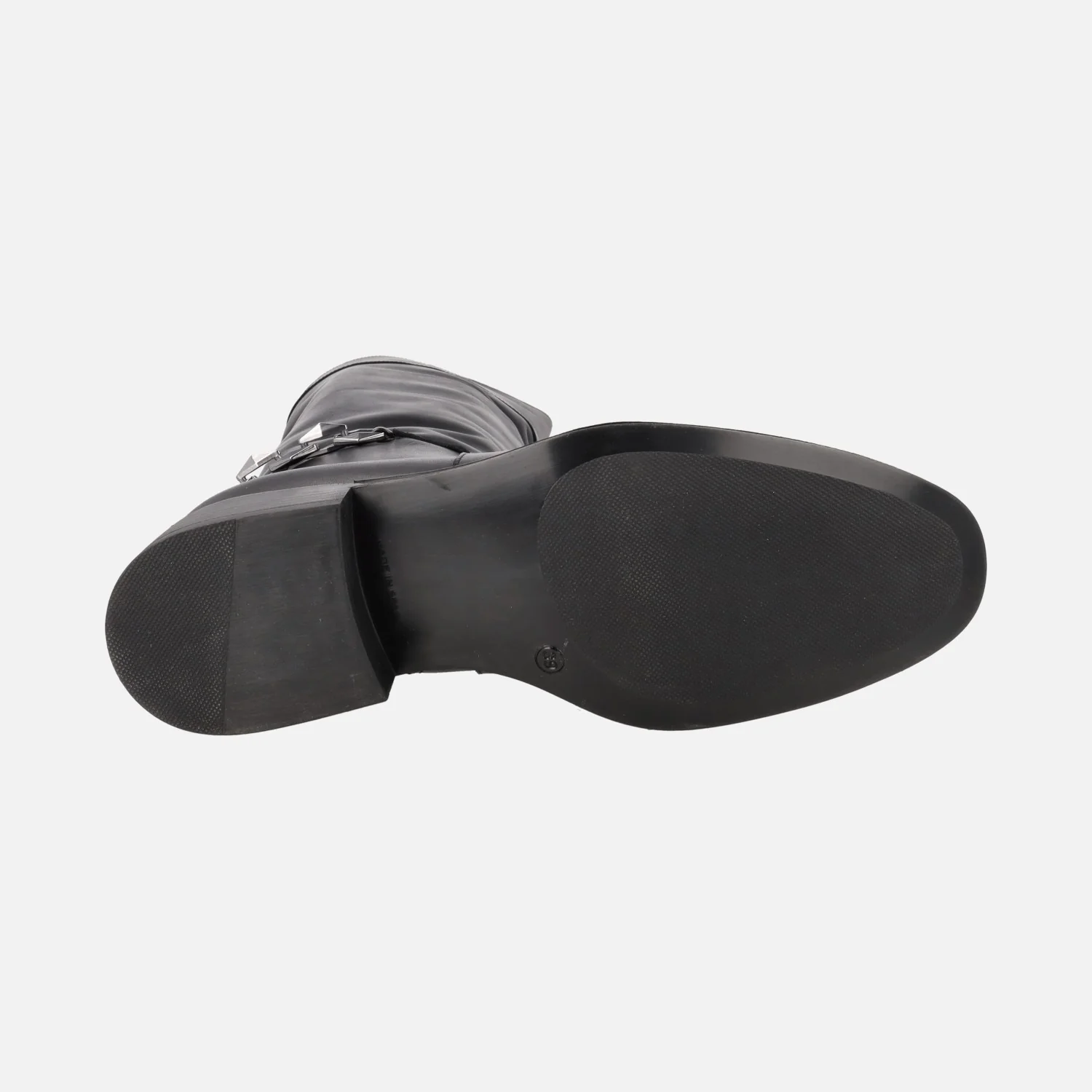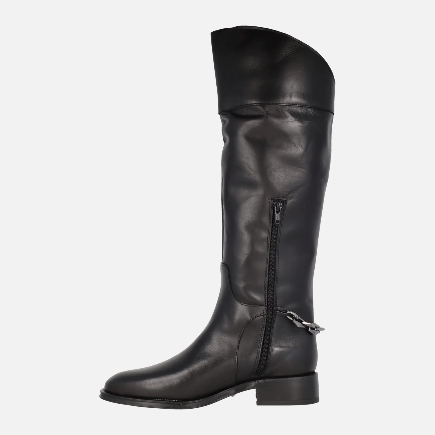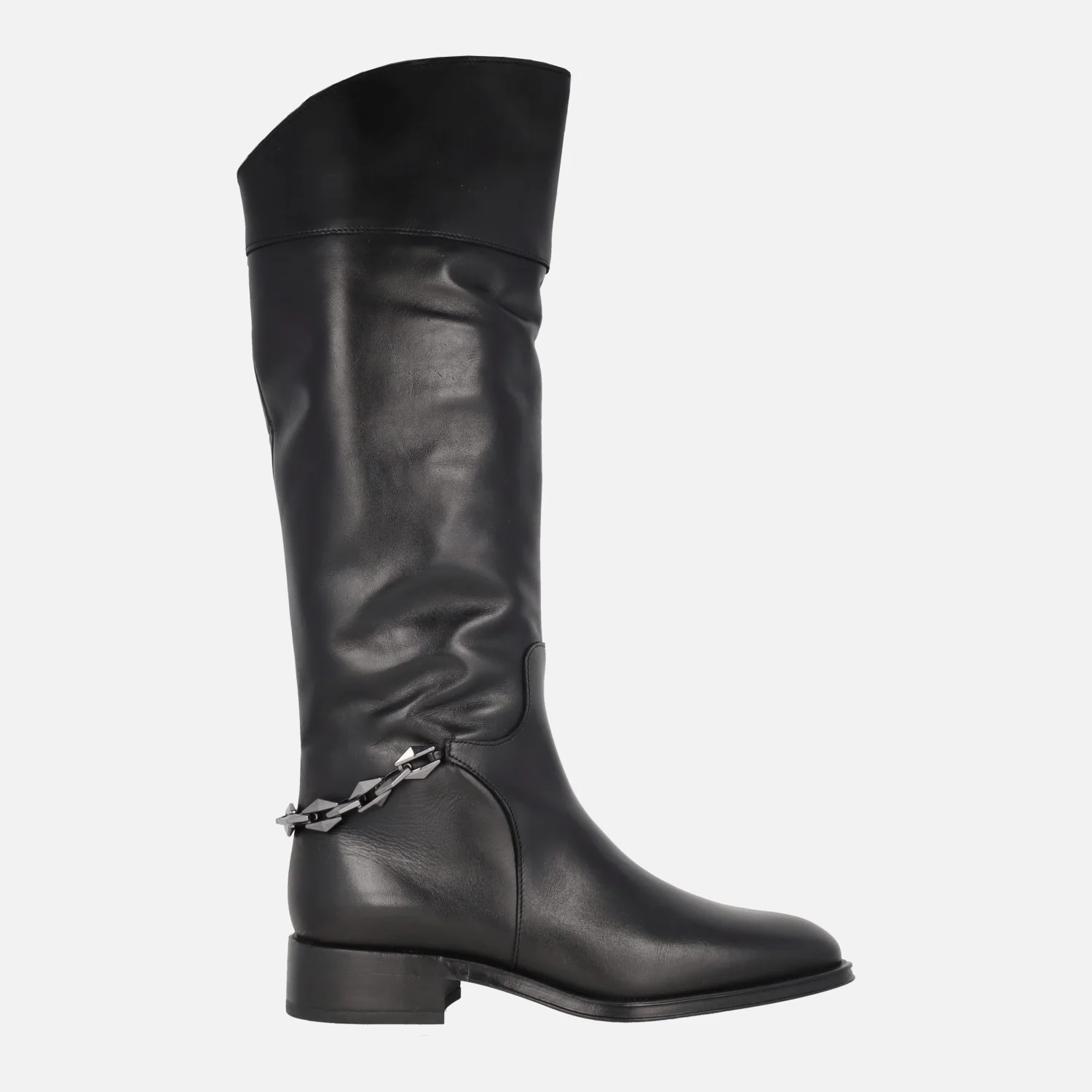 Botas de caña alta Alpe Couture 5188 Negro. Botas altas, elaboradas en piel negra, con adorno de cadena metálica plateada en la talonera. Cierre de cremallera a media caña en el lado interior, para facilitar la puesta. Caña de 41,5 cms de altura. Interior textil. Piso sintético, con tacones de 3,5 cms de altura.