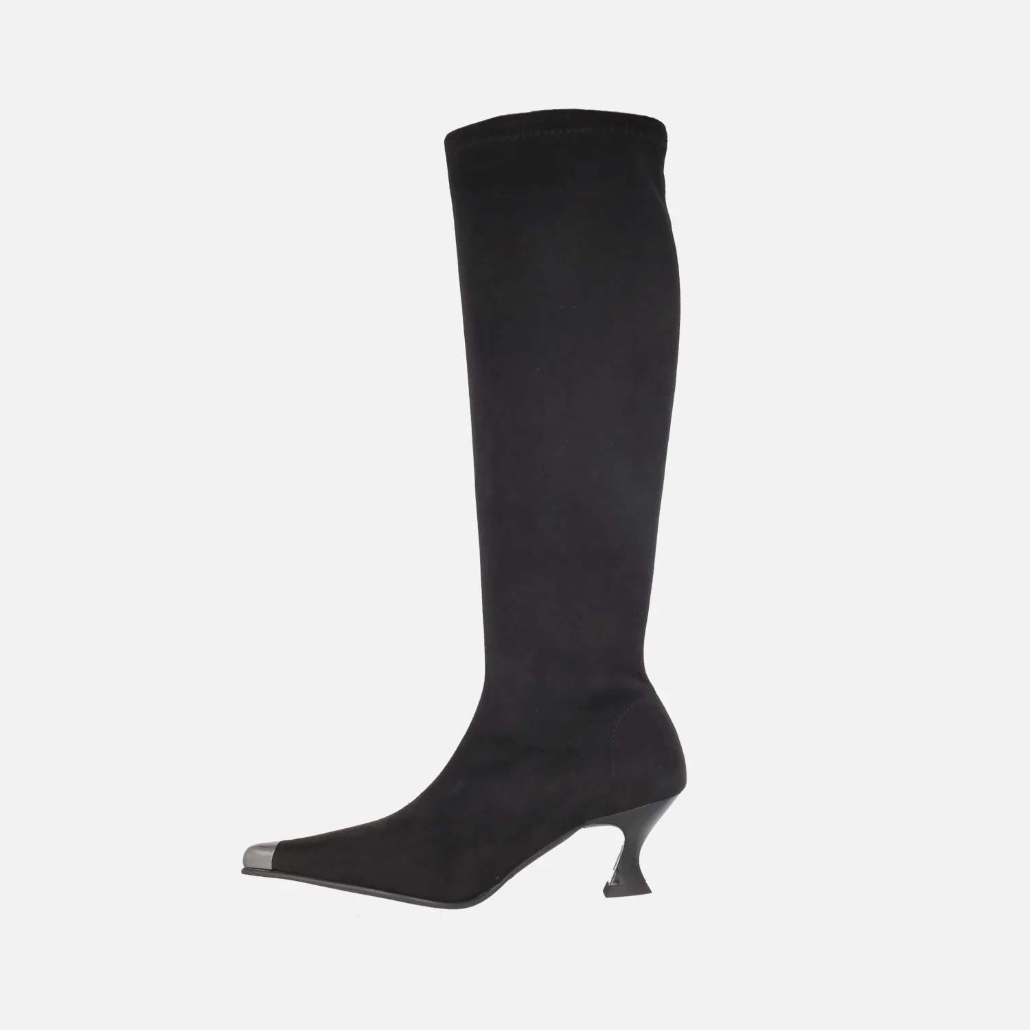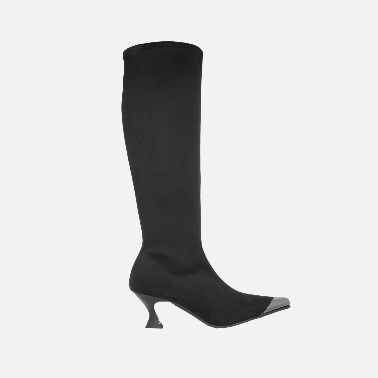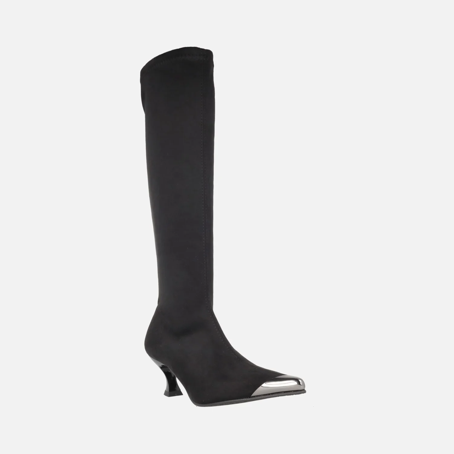 Botas de caña alta de la marca Miss elastic modelo 078650-AE Negro. Botas altas elaboradas en tejido elástico efecto ante, con adorno metálico en la puntera (sesgado, no simétrico). Tratamiento Eco DRY Solutions para una ligera resistencia a la lluvia. Interior textil. Suela sintética con tacones de 6 cm. Caña de 42 cm de altura.