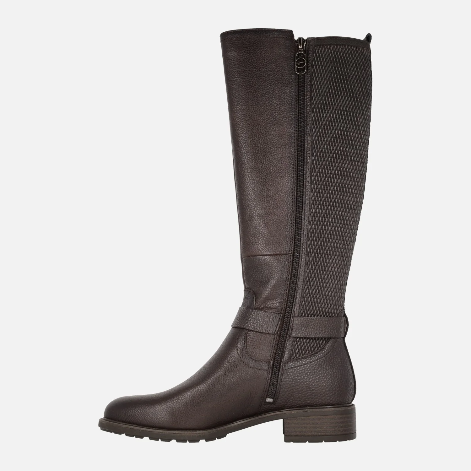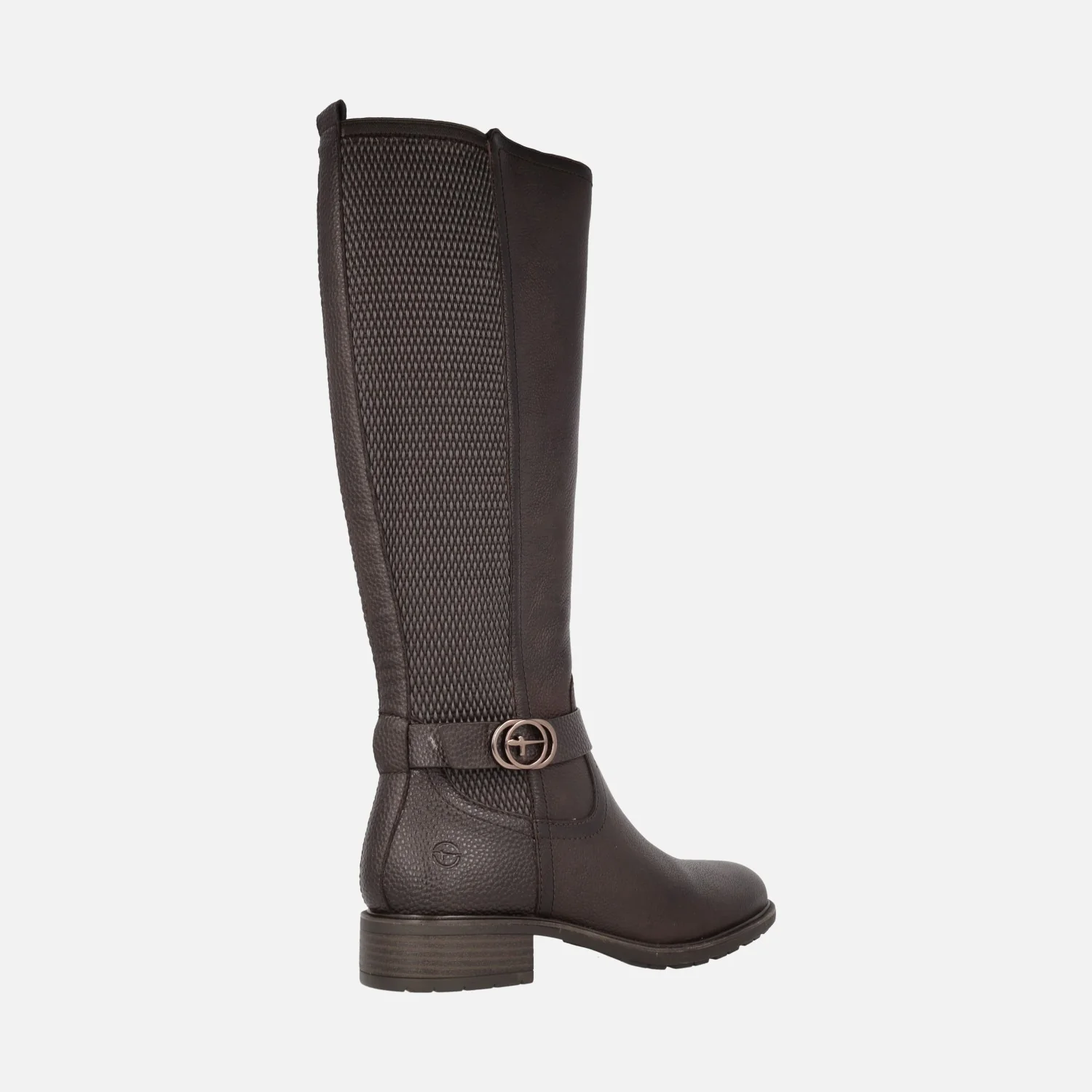 Botas marrones de caña alta de la marca Tamaris, modelo 1-25618-43 Mahogany. Botas elaboradas en piel marrón con parte trasera en tejido elástico, para un mayor calce y ajuste. Adorno metálico en el lado exterior. Cierre de cremallera en el lado interior. Caña de 40 cms de altura. Interior mixto de tejido y sintéticos. Piso de goma, con tacones de 3,5 cms de altura.