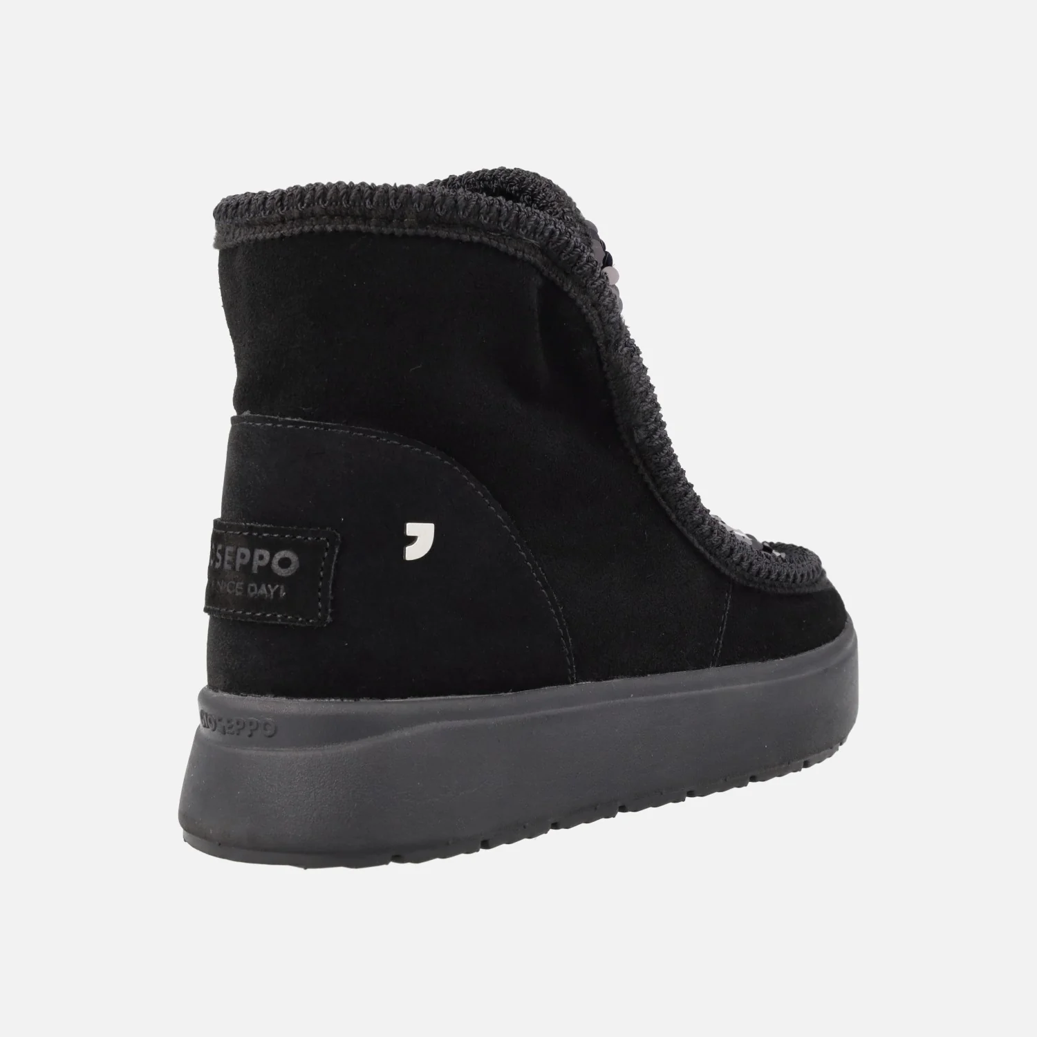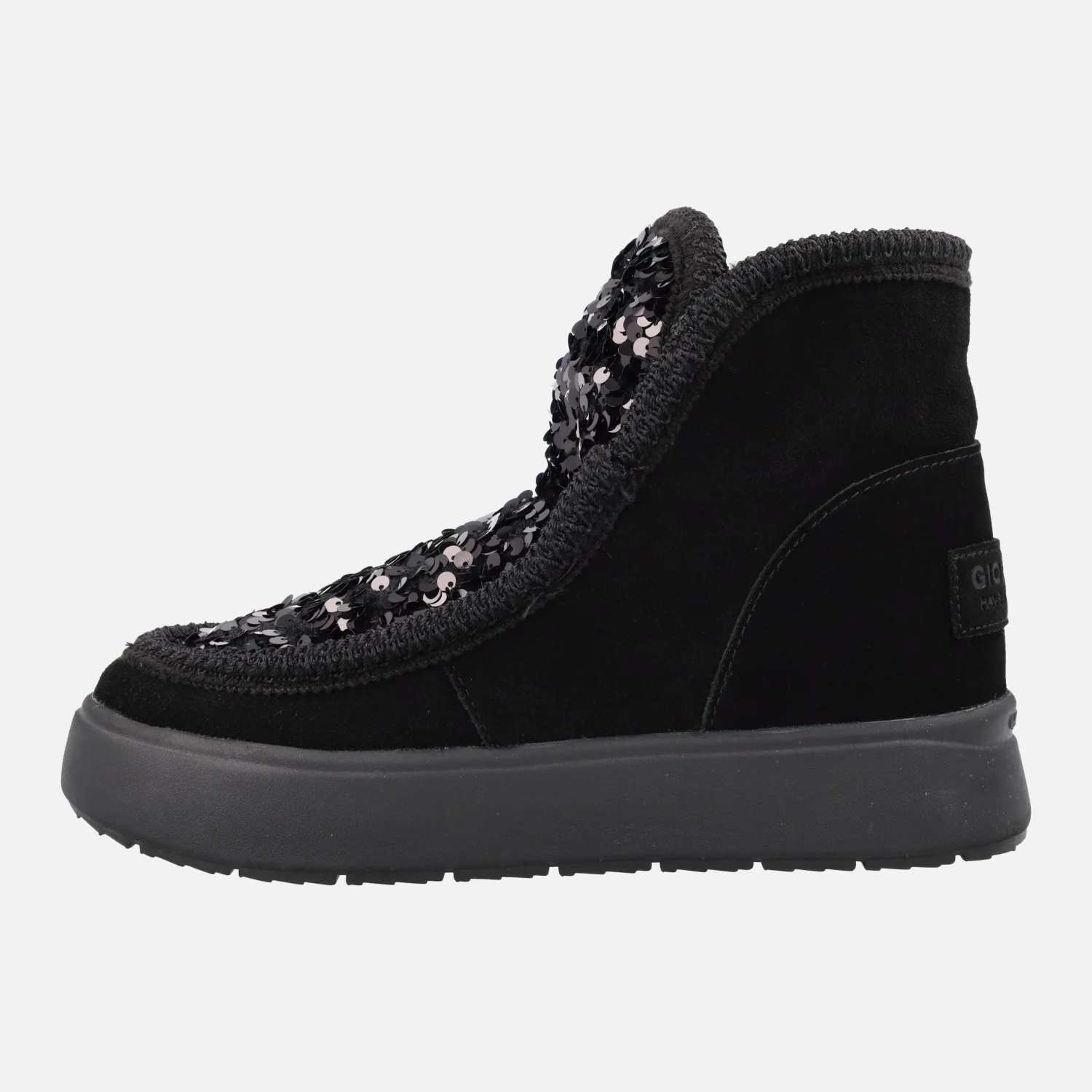 Botas estilo australianas de la marca Gioseppo, modelo Stark 73267, disponibles en negro Botas de piel serraje con pala textil con lentejuelas. Forro interior de pelo (planta y caña). Altura de caña 12,5 cms. Piso de goma eva, muy ligero, de aproximadamente 3 cms de altura.
