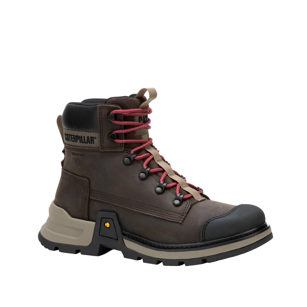 Botas impermeables Cat para hombre, color café, elaboradas en piel con fijación de agujeta, punta redonda y textura lisa, cuenta con tecnología WATERPROOF, posee cuero impermeable, costuras selladas y membranas que mantienen el agua fuera del zapato esto hace que el pie se mantenga seco a pesar de la lluvia y elementos externos del ambiente.