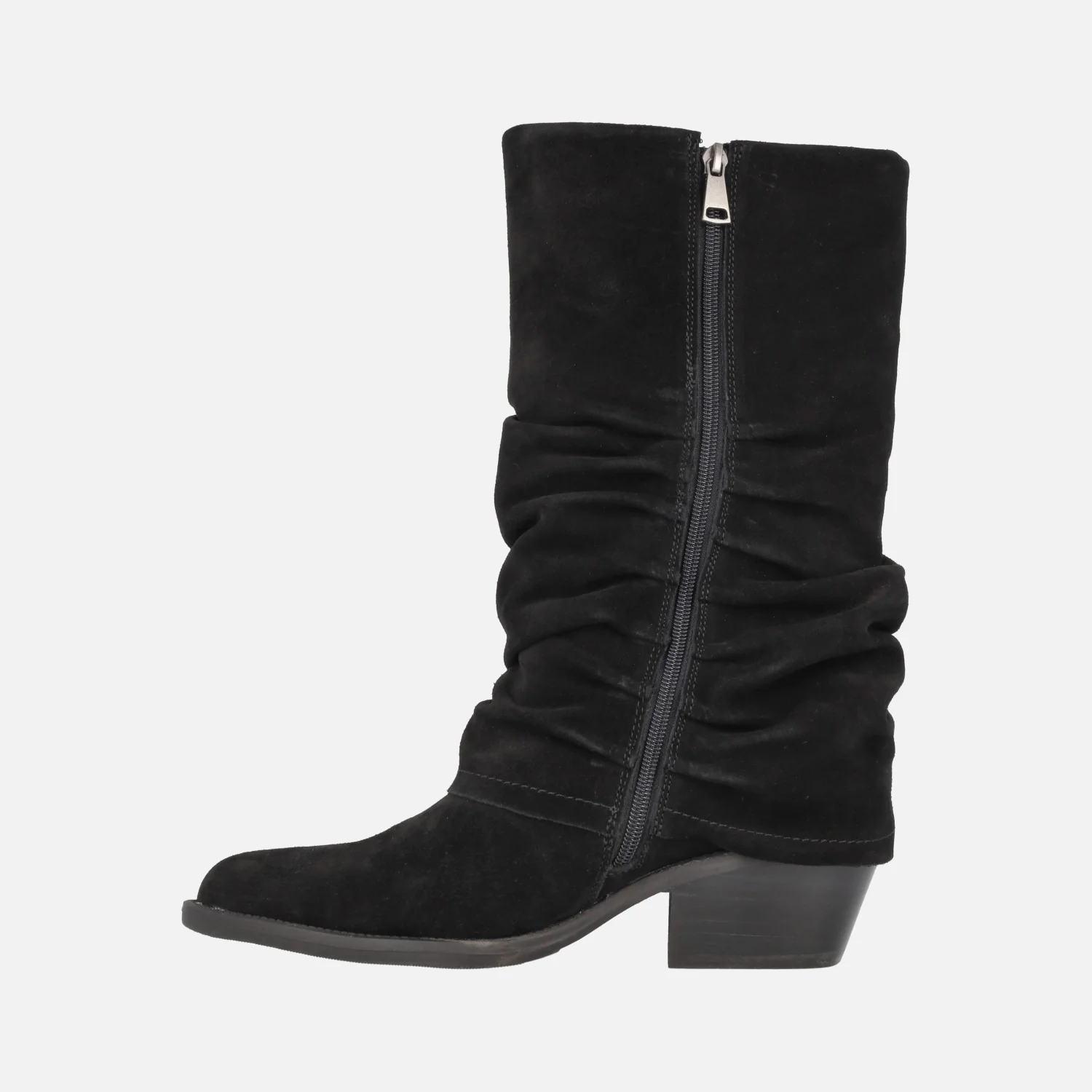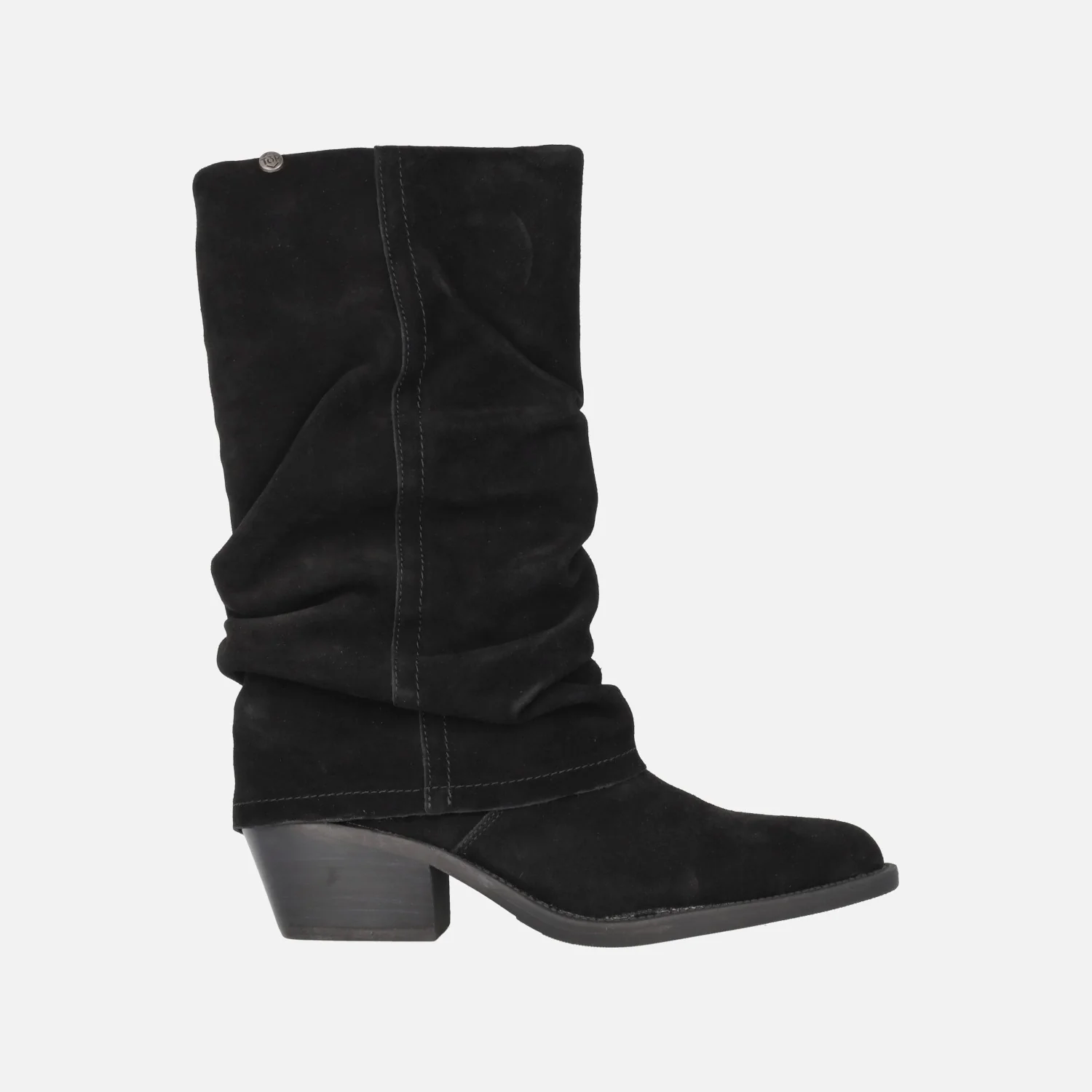 Botas inspiración cowboy para mujer de la marca TOP3 modelo SS24722 Negro. Botas de horma ligeramente afilada, elaboradas en piel serraje color negro con detalle de faldón. Cierre de cremallera en el lado interior. Forro y planta textiles. Tacones de 6 cms de altura. Caña de 27 cms, con vuelta (faldón) y frunces.