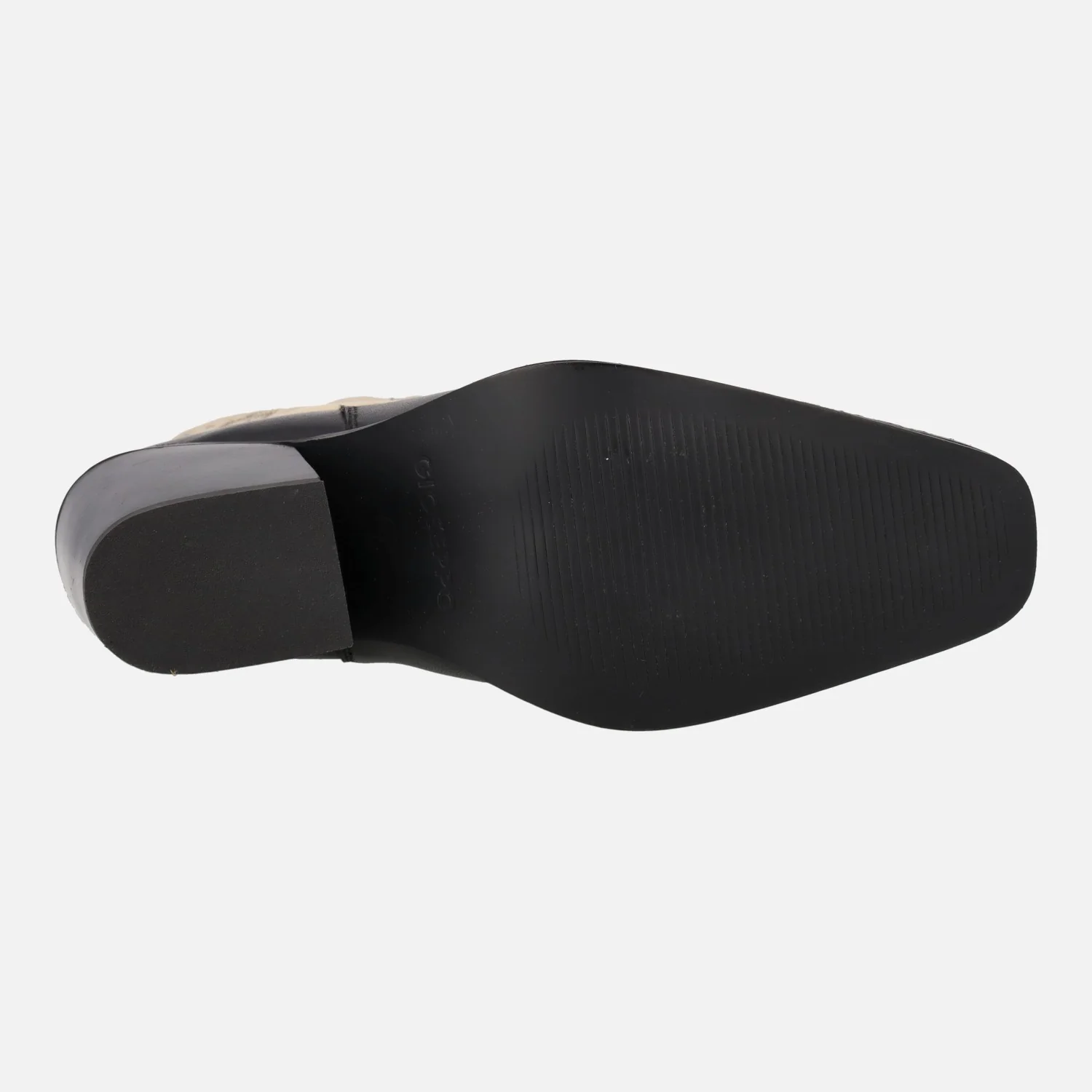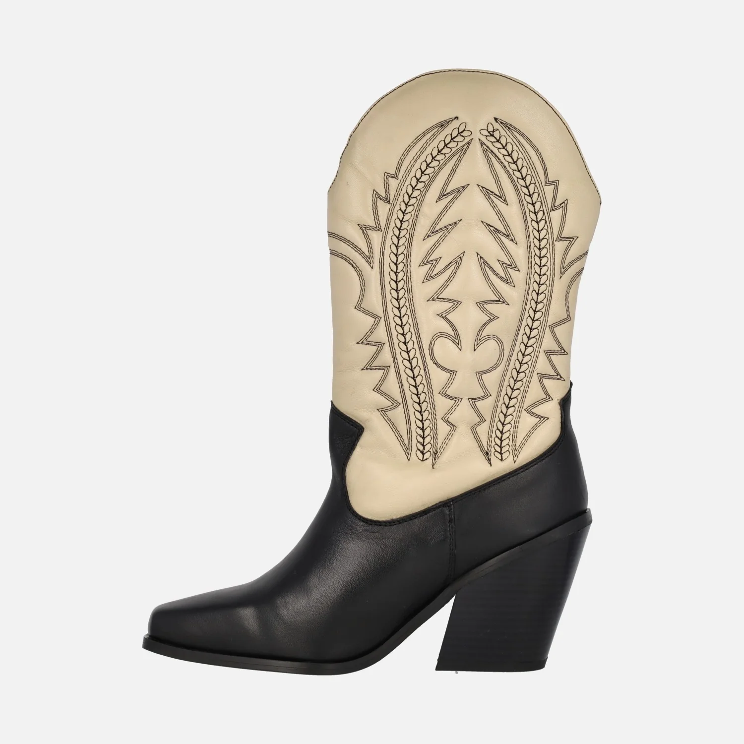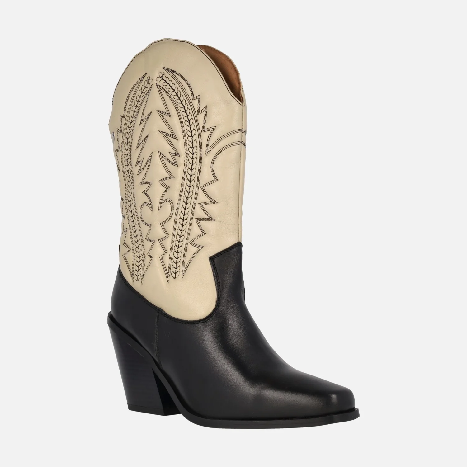 Botas estilo cowboy para mujer de la marca Gioseppo modelo Herlev 70761-P Off White. Botas elaboradas en piel en combinado de beige y negro, con detalles bordados en la caña. Interior textil con planta de piel. Altura de caña 26 cms. Sin cremallera. Tacones anchos de 9 cms de altura. Piso sintético.