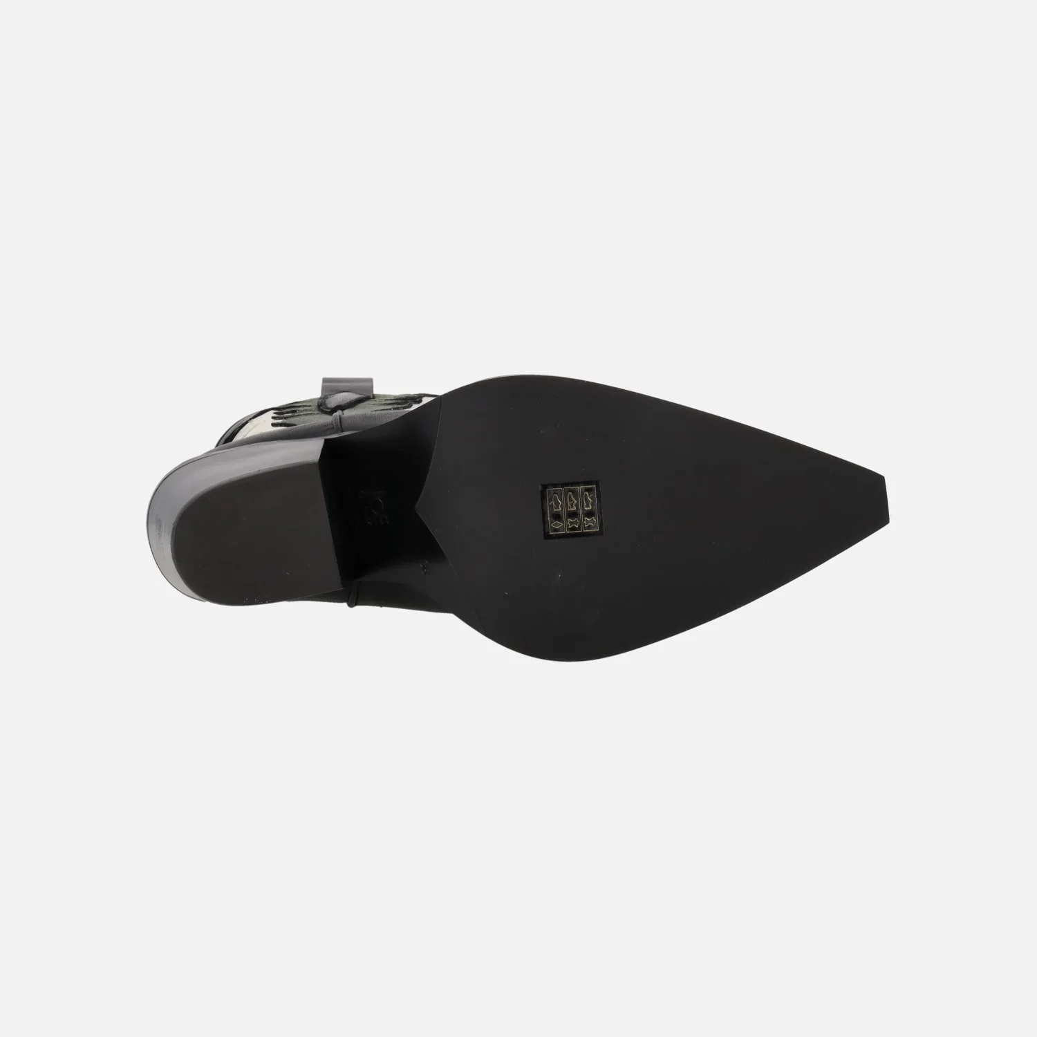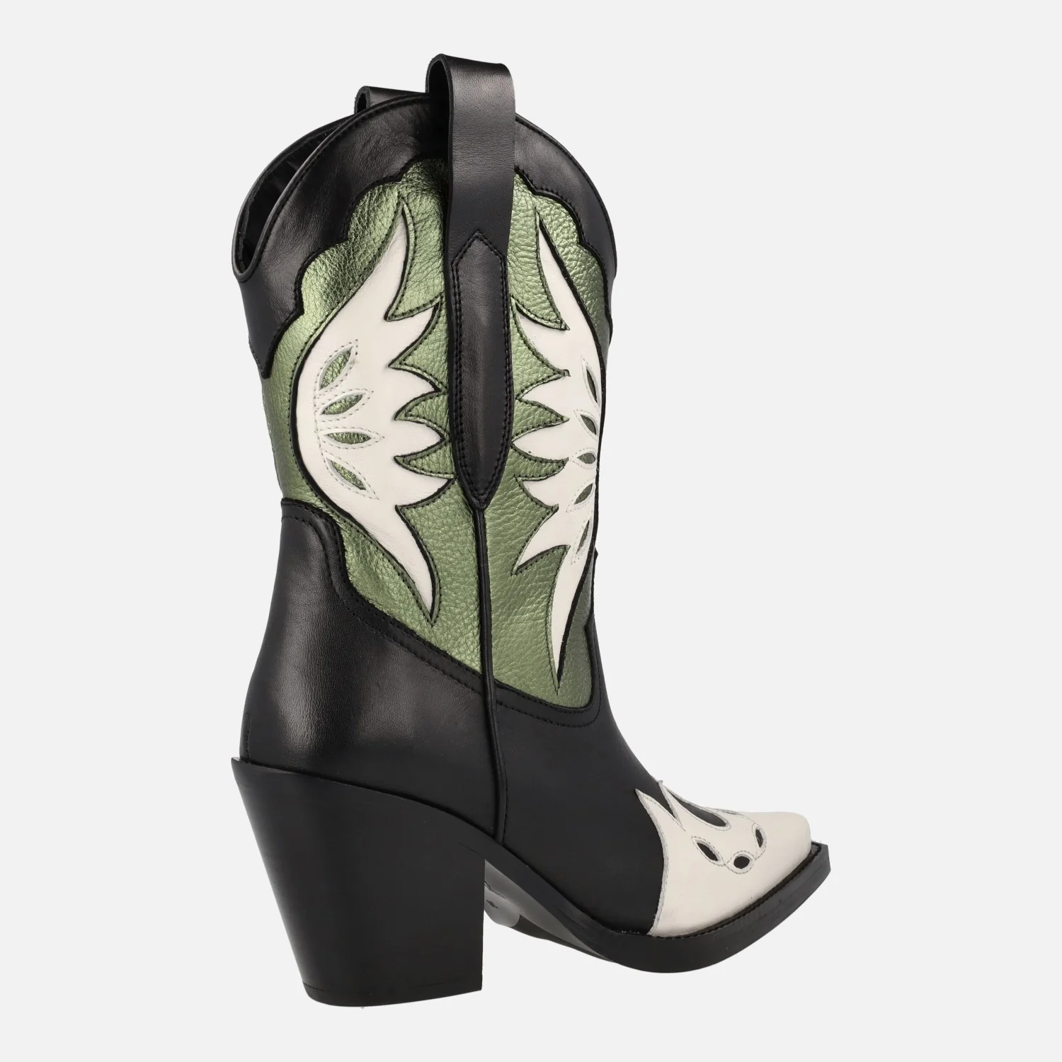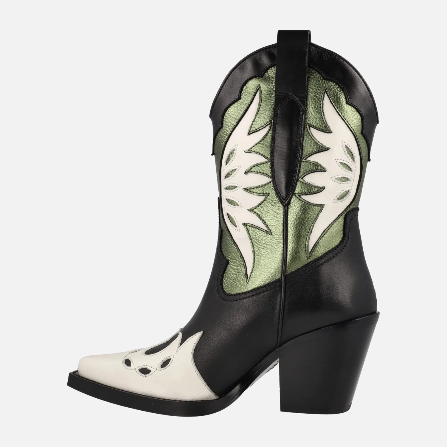 Botas cowboy para mujer de la marca española Joe Sánchez modelo 19820 negro/blanco/cadmio. Botas de media caña en combinado tricolor, sin cremallera, pero con dos tiradores, uno a cada lado, para facilitar el calce. Interiores de piel, forro y planta. Caña de 22 cms de altura. Tacones de 7,5 cms. Made in Spain.
