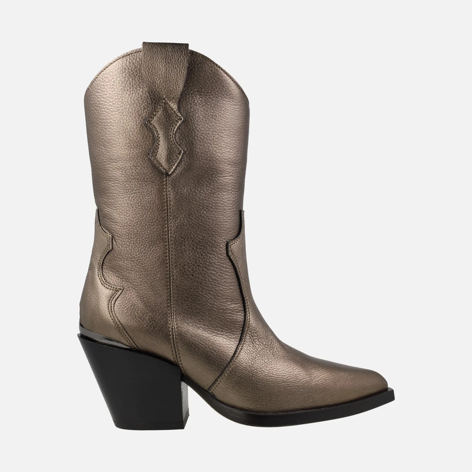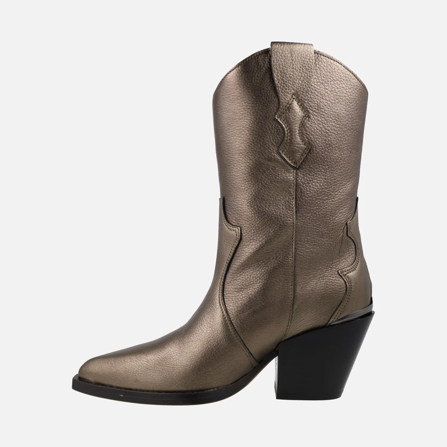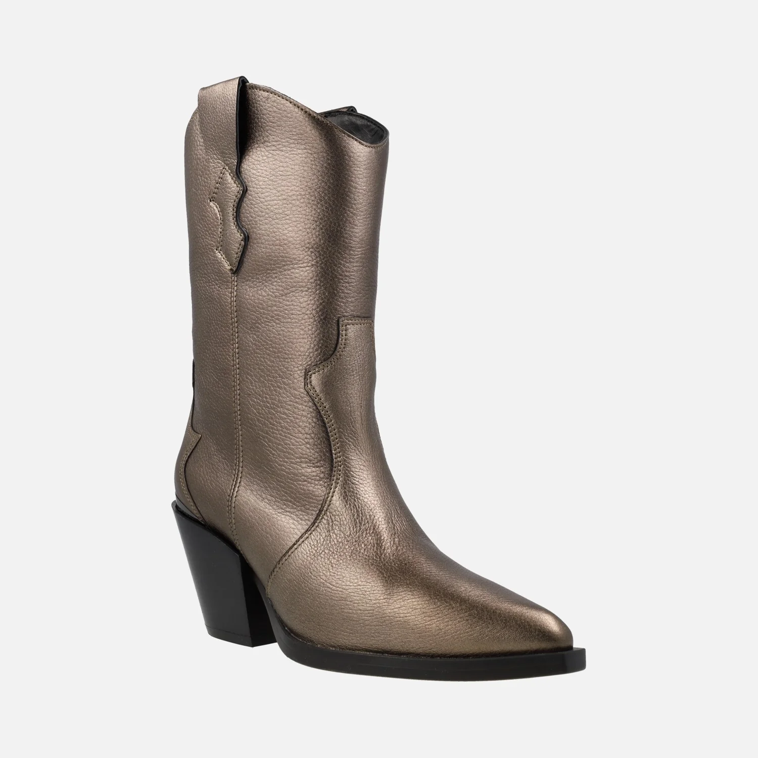 Botas cowboy de media caña de la marca Alpe, modelo Vermont 2037 y disponibles en negro, smog y bronzo. Botas de piel de puntera afilada, sin cremallera y con un tirador a cada lado para facilitar el calce. Botas de media caña, ideales para tus faldas largas y vestidos, aunque también quedan fenomenal con unos pantalones pitillo. Interior mixto piel/textil. Tacones anchos, de estilo cubano, en madera, con una altura de 6 cms. Caña de 23 cms de altura. Suela sintética. Made in Spain.