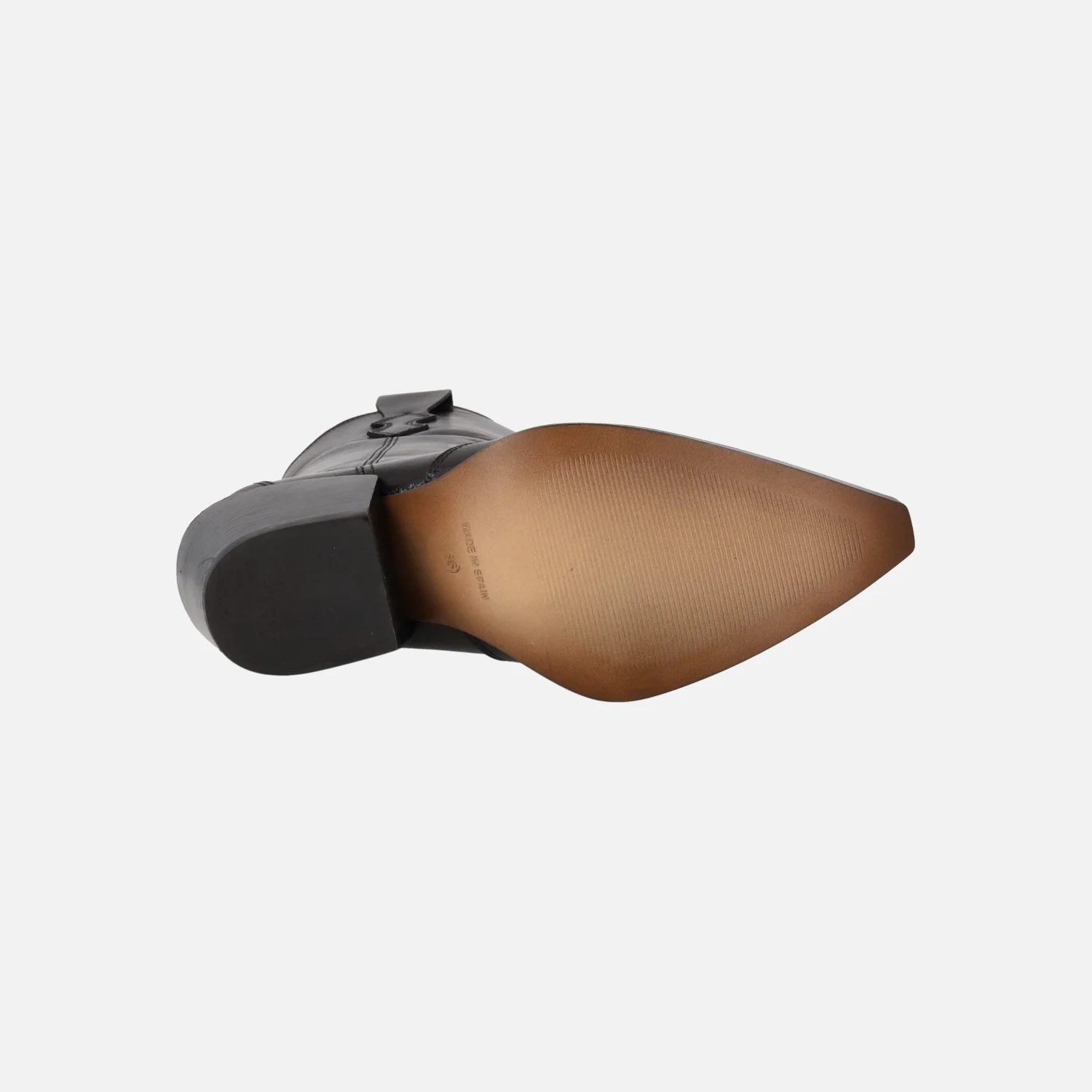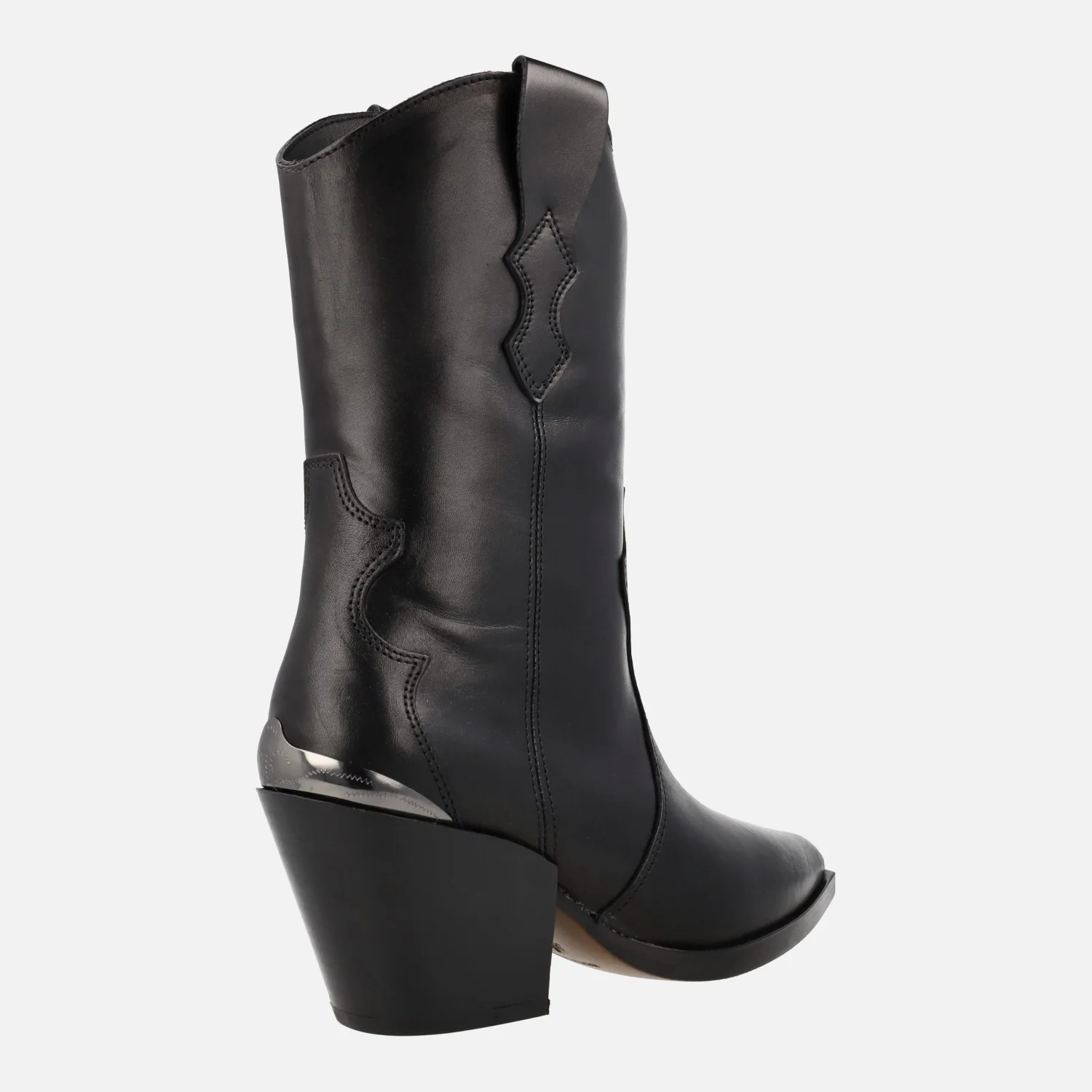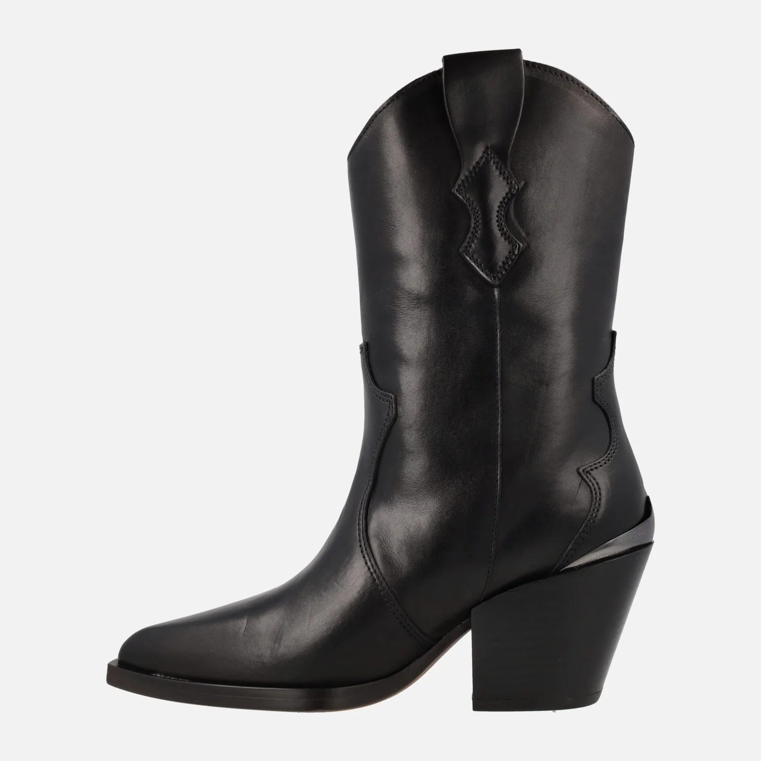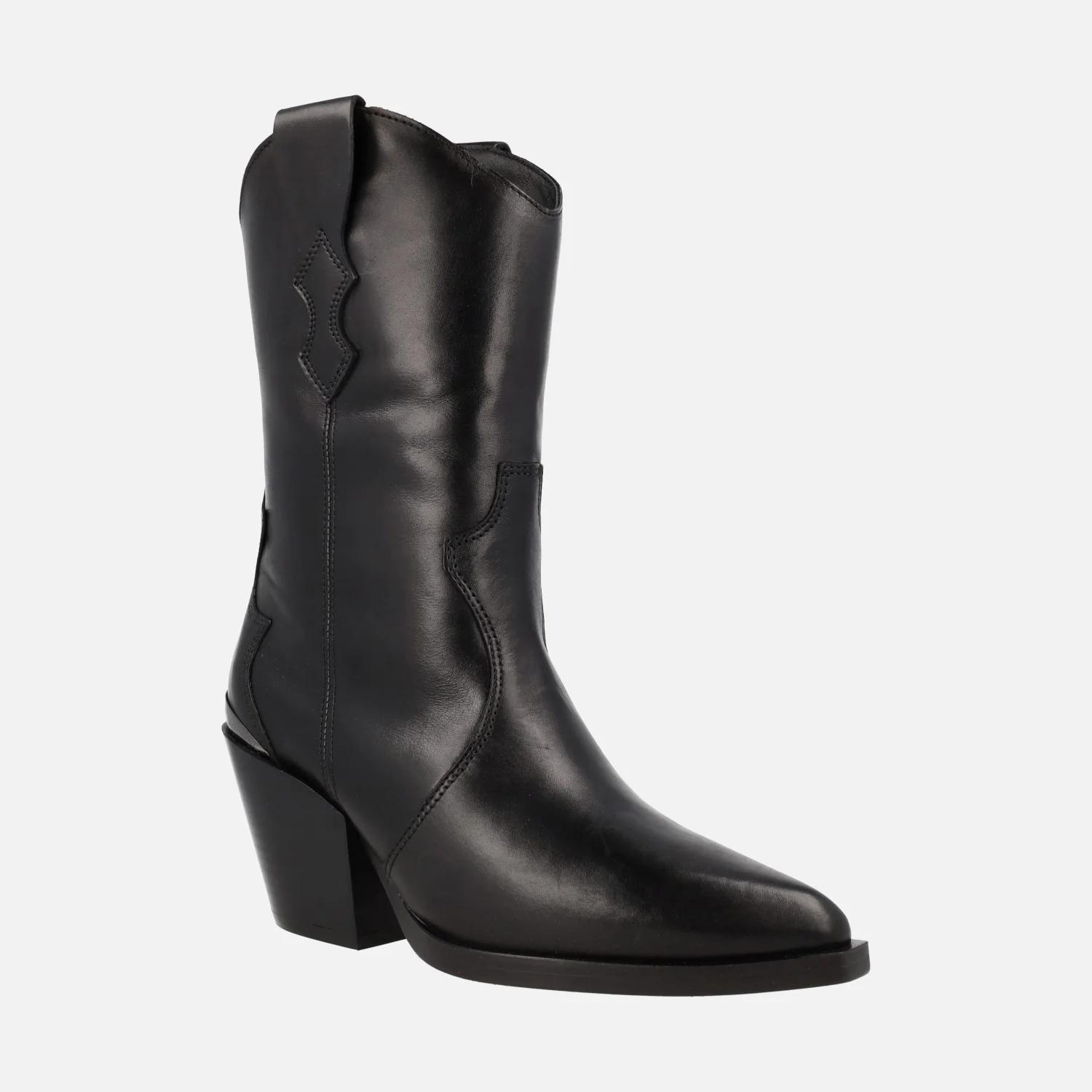 Botas cowboy de media caña de la marca Alpe, modelo Vermont 2037 y disponibles en negro, smog y bronzo. Botas de piel de puntera afilada, sin cremallera y con un tirador a cada lado para facilitar el calce. Botas de media caña, ideales para tus faldas largas y vestidos, aunque también quedan fenomenal con unos pantalones pitillo. Interior mixto piel/textil. Tacones anchos, de estilo cubano, en madera, con una altura de 6 cms. Caña de 23 cms de altura. Suela sintética. Made in Spain.