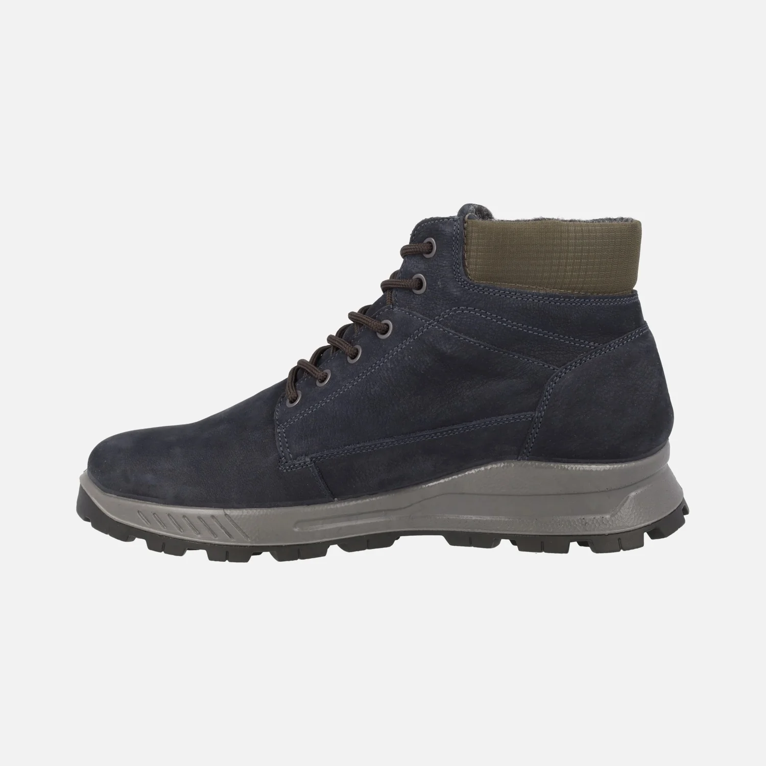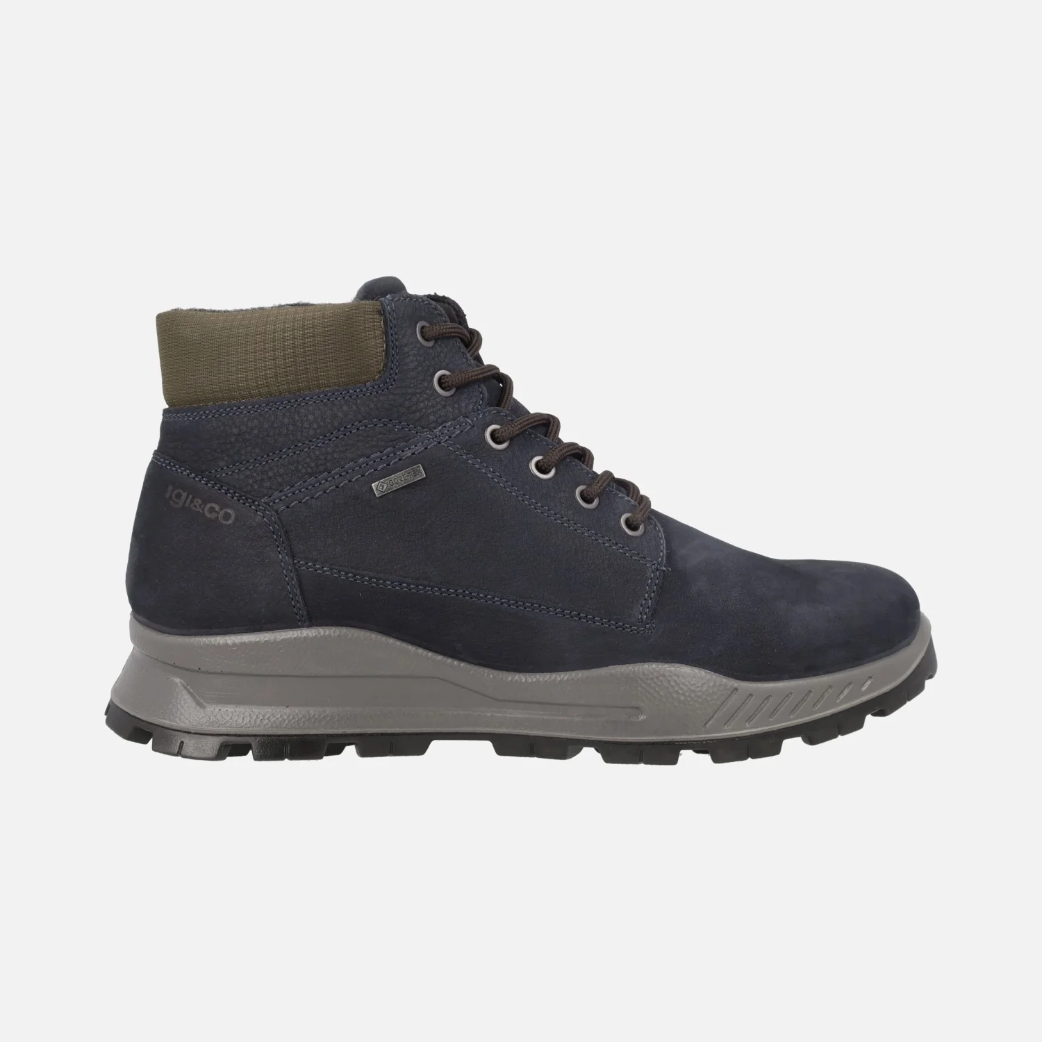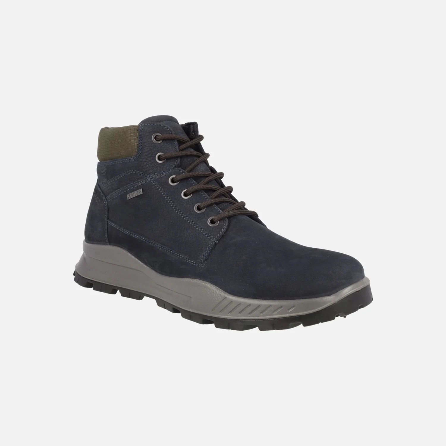 Botas de cordones para hombre de la marca italiana Igi&co. modelo 86297 Blu Scuro. Botas elaboradas en piel nobuck azul oscuro con collarín textil. Cierre de cordones, membrana interior de Goretex. Plantillas extraíbles forradas de piel. Piso de goma.