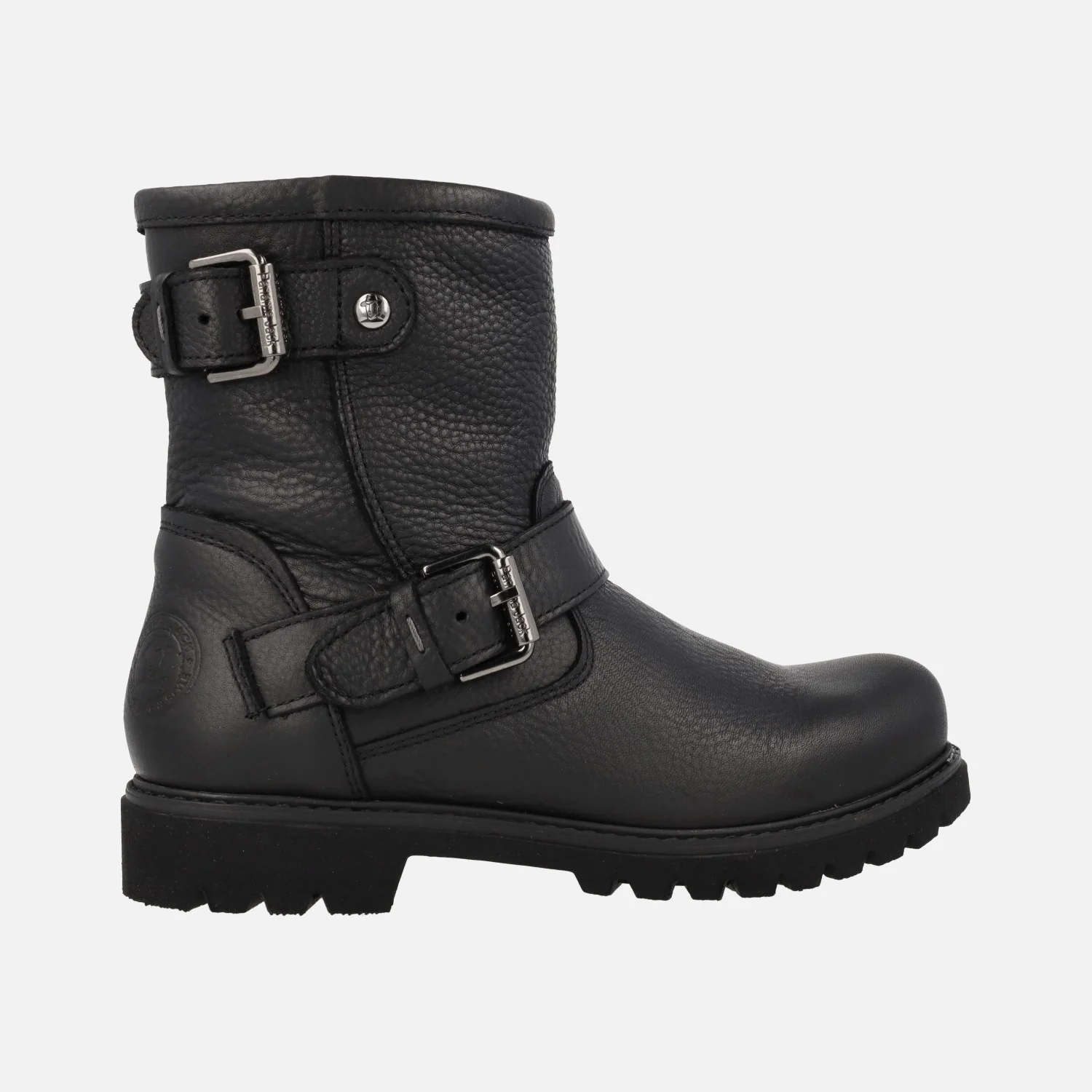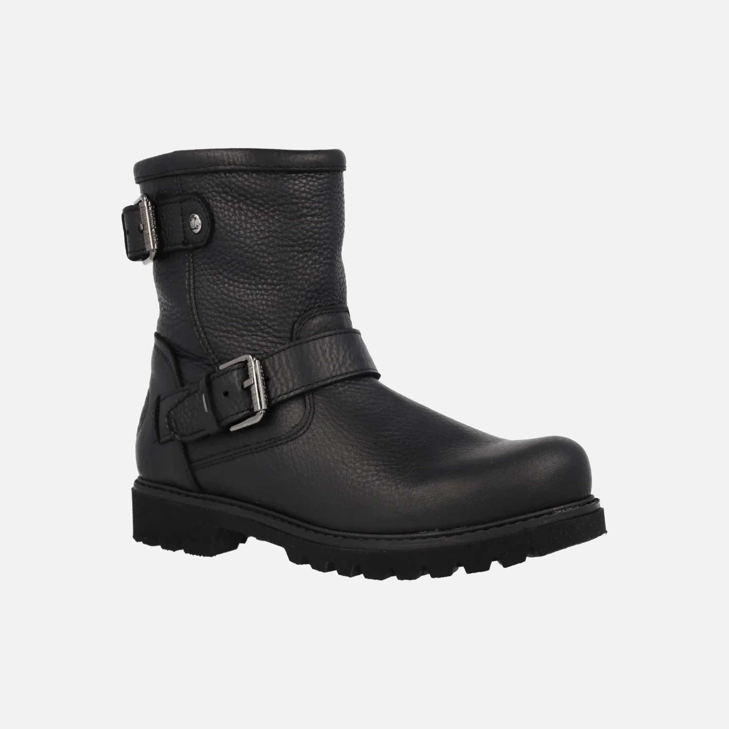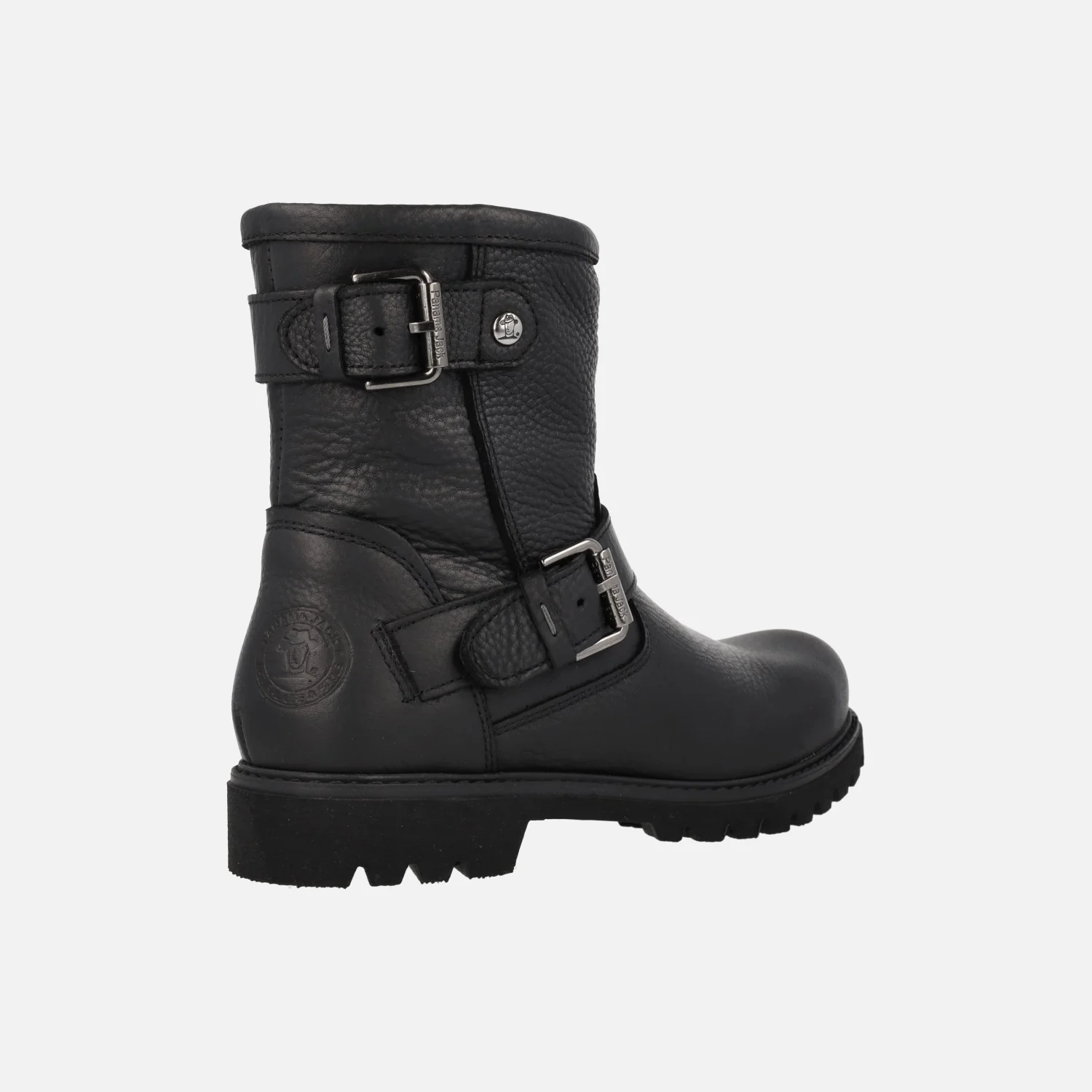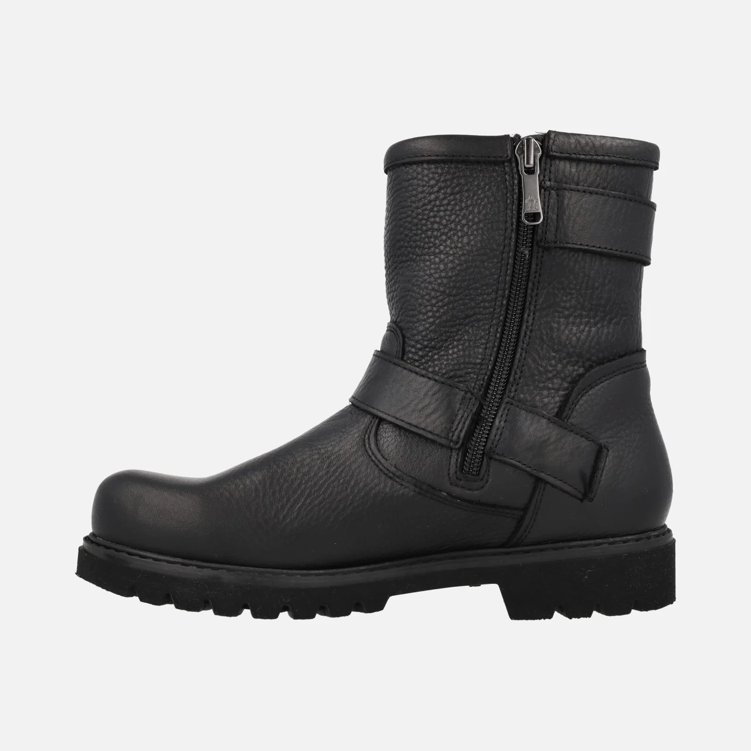 Botas de estilo motero de la marca Panama jack modelo Felina B9 Napa grass negro. Botas elaboradas en piel engrasada negra, con detalle de dos hebillas metálicas en el lado exterior. Cierre de cremallera en el lado interior. Forro y planta de pelo. Piso de caucho natural, con 3 cms de altura de tacón. Caña de 16,5 cms de altura. Made in Spain.