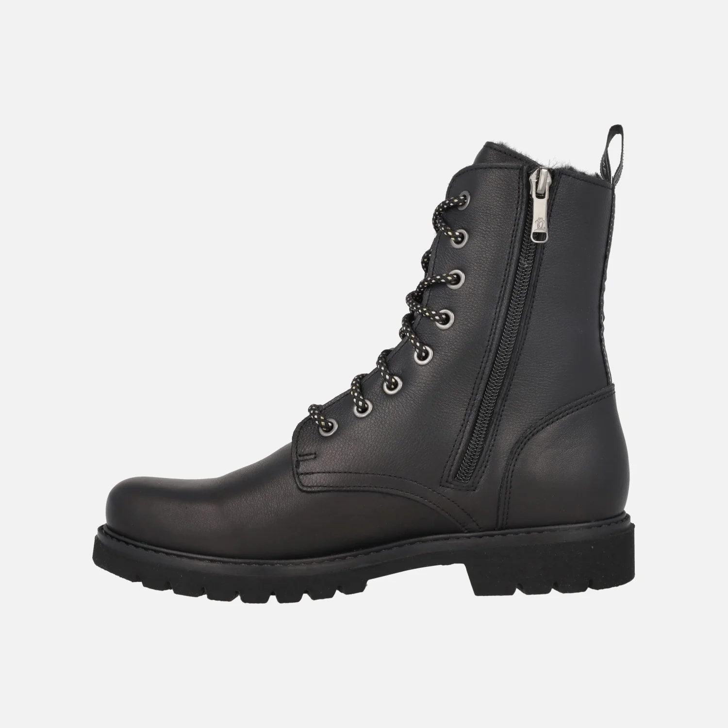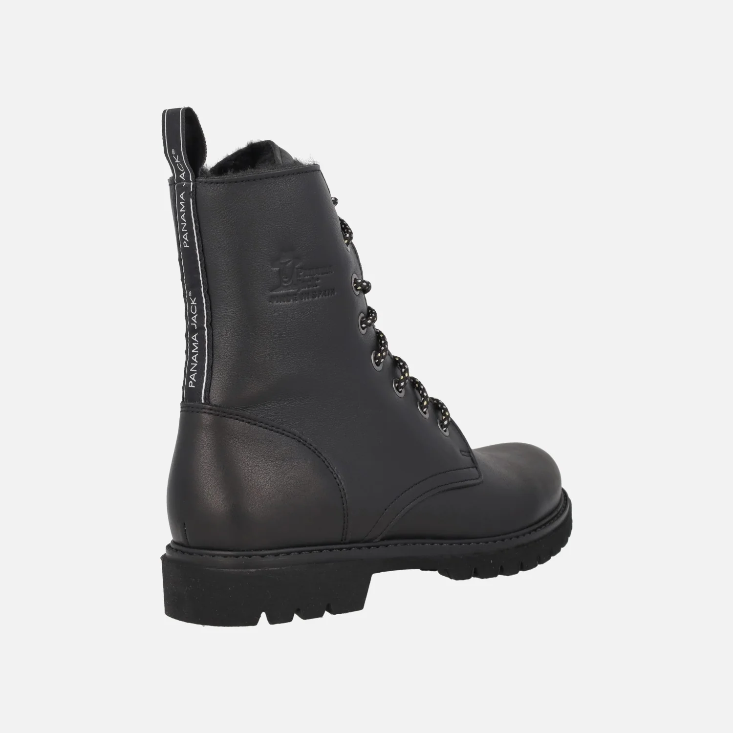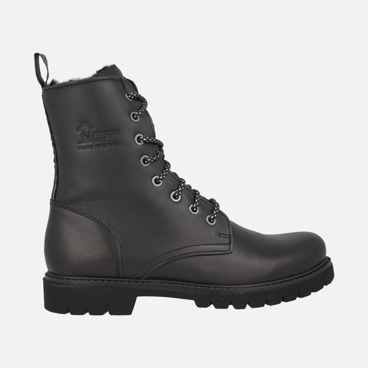 Botas de piel para mujer Panama jack Frisia, disponibles en piel napa negra B1 y en nobuck taupe B30. Botas de piel napa o piel nobuck con tratamiento waterproof, cierre de cordones y cremallera lateral. Tirador trasero. Interior forrado completamente de pelo incluida la planta. Plantillas extraíbles. Caña de 17 cms de altura con tirador textil. Piso de caucho natural, de 3 cms de altura de tacón (2 cm parte delantera). Made in Spain.