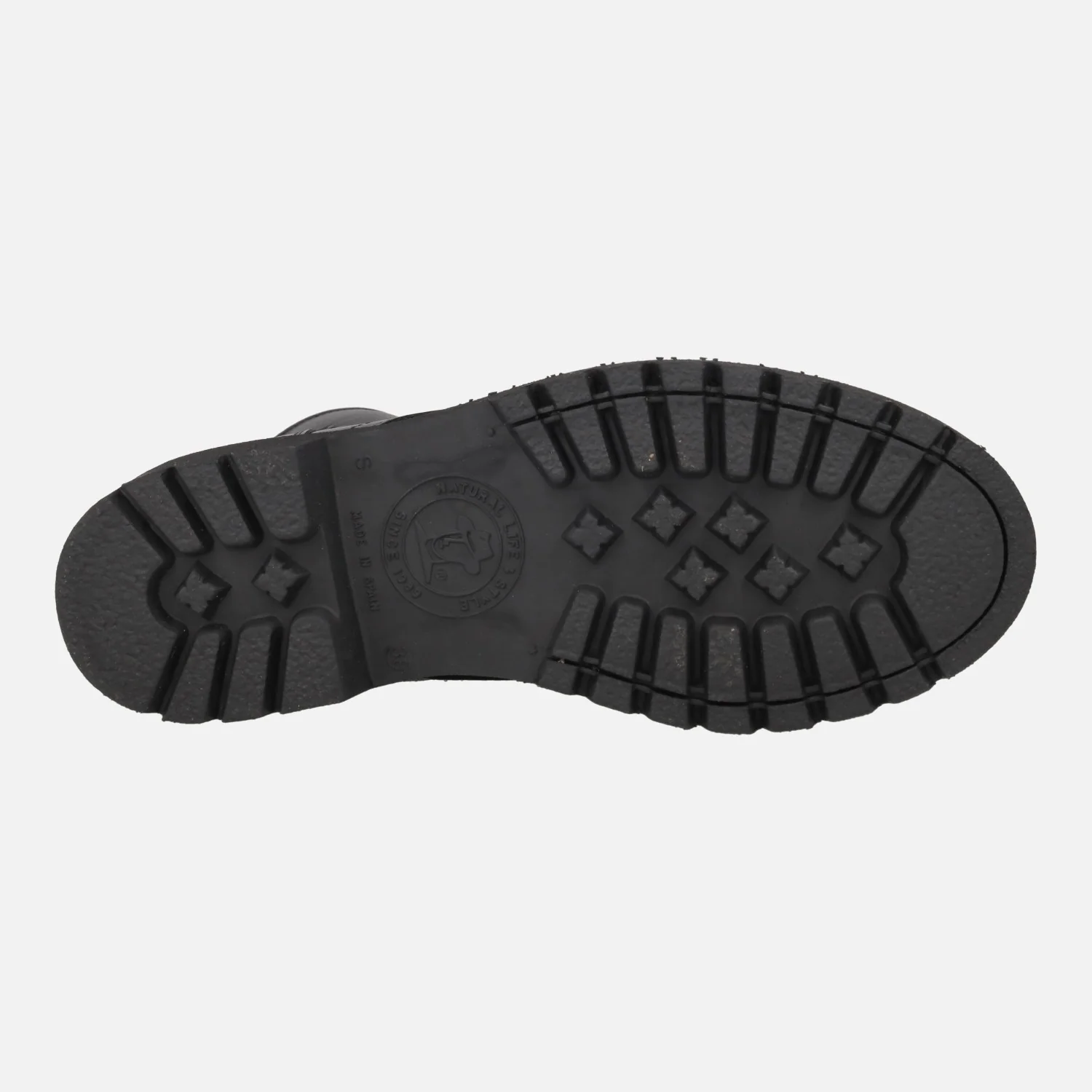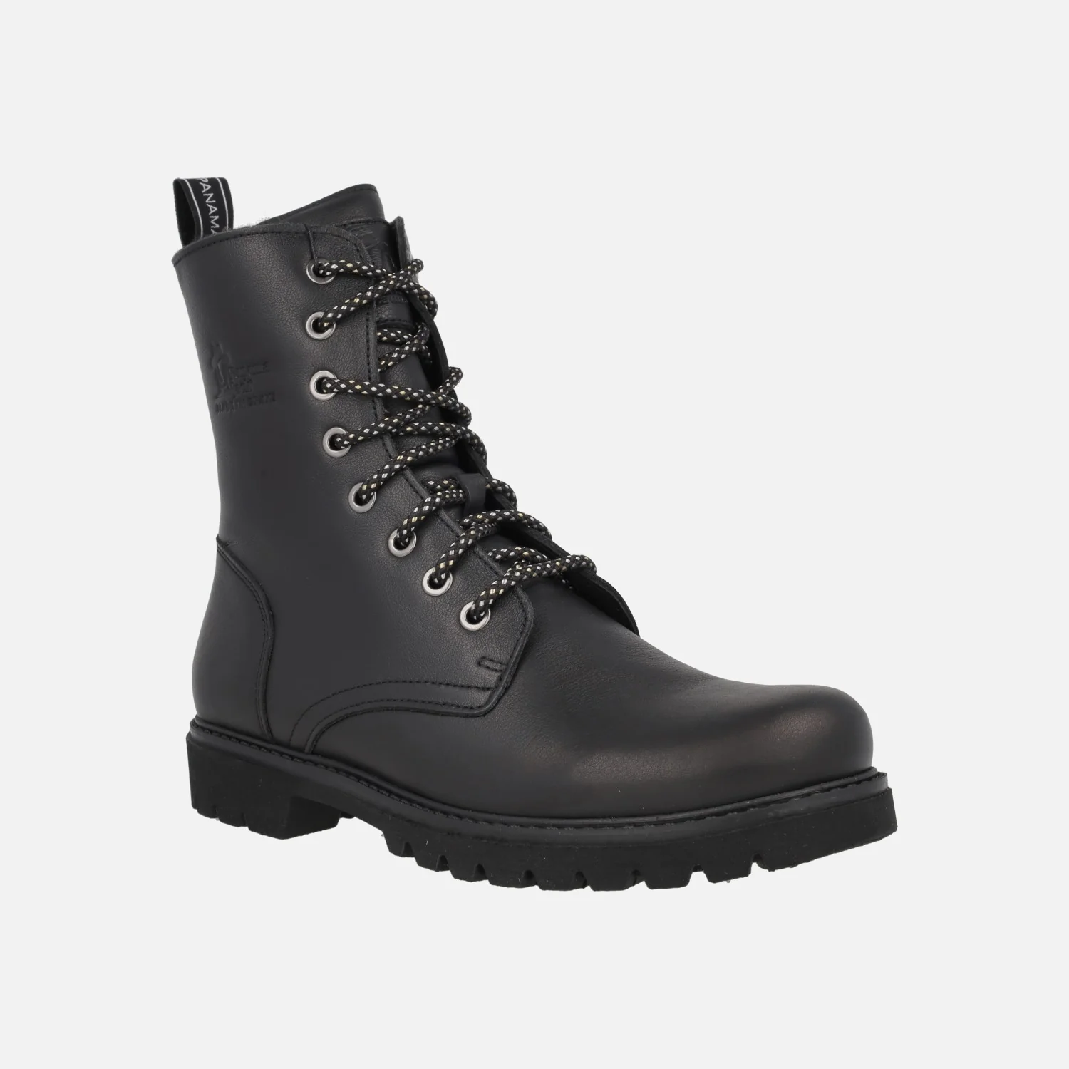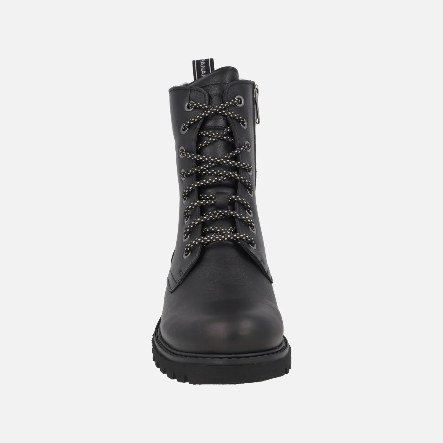 Botas de piel para mujer Panama jack Frisia, disponibles en piel napa negra B1 y en nobuck taupe B30. Botas de piel napa o piel nobuck con tratamiento waterproof, cierre de cordones y cremallera lateral. Tirador trasero. Interior forrado completamente de pelo incluida la planta. Plantillas extraíbles. Caña de 17 cms de altura con tirador textil. Piso de caucho natural, de 3 cms de altura de tacón (2 cm parte delantera). Made in Spain.