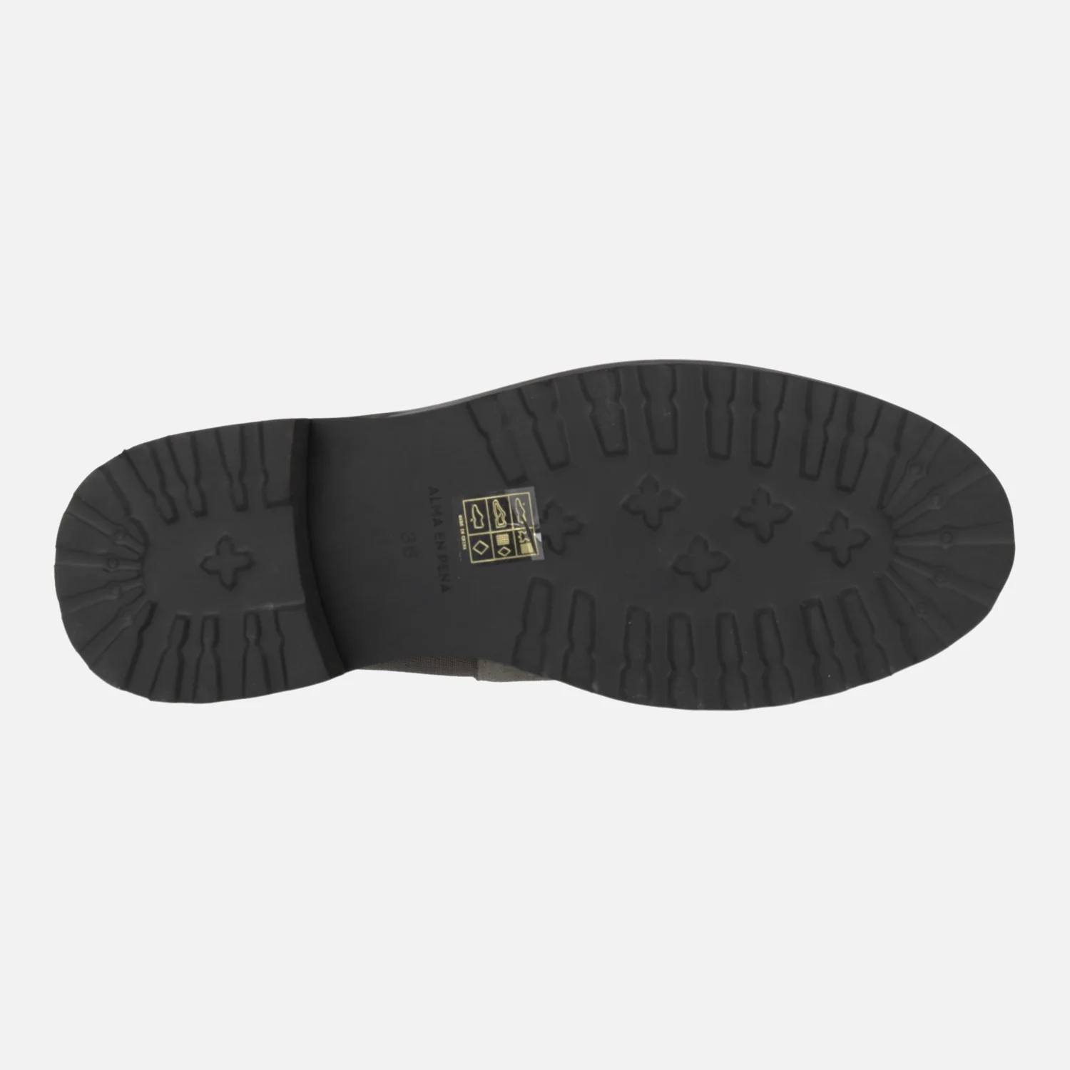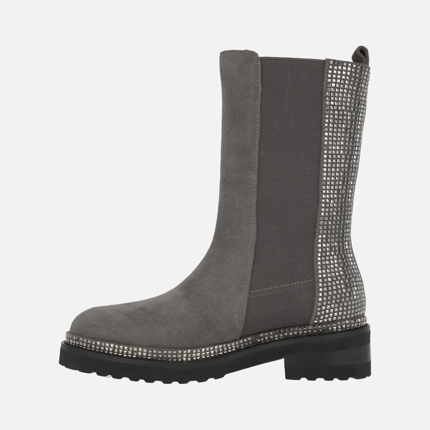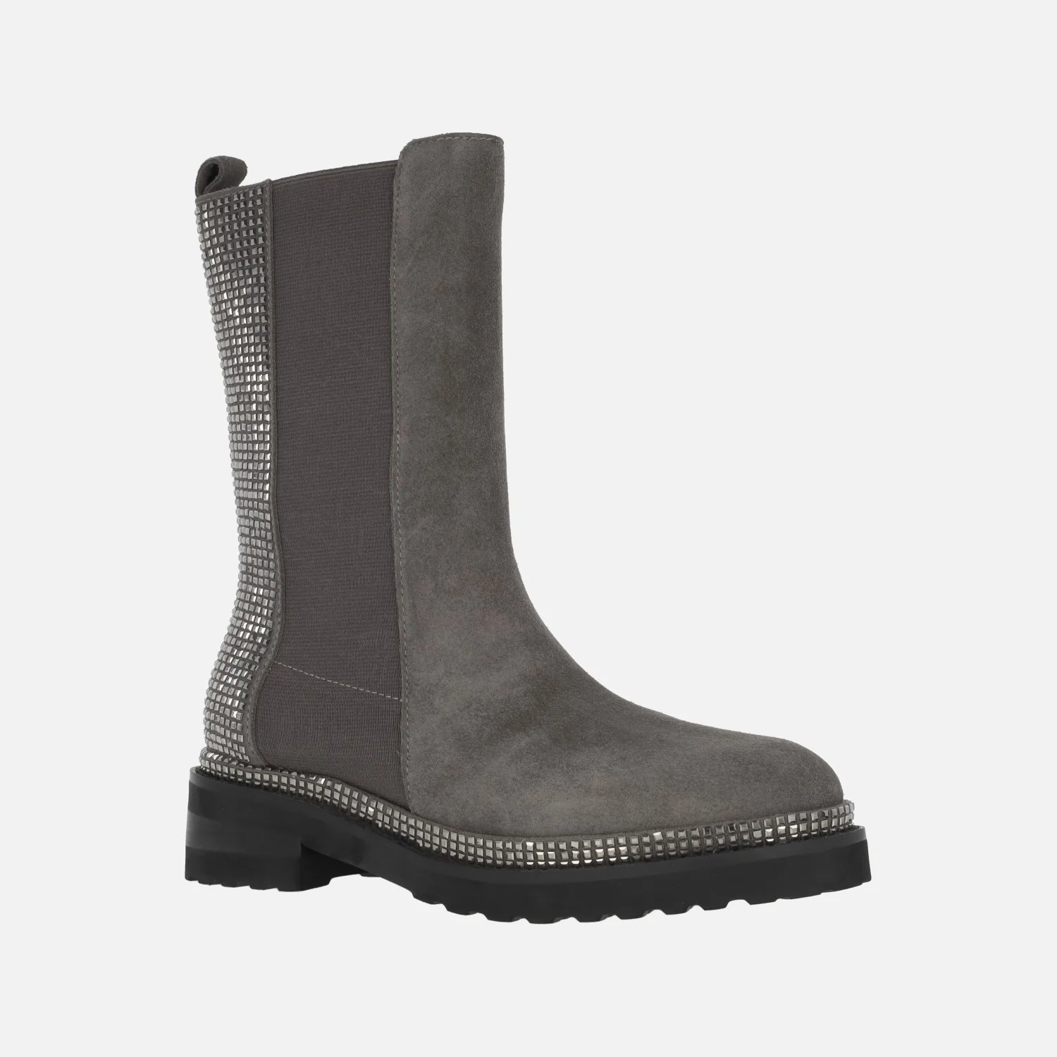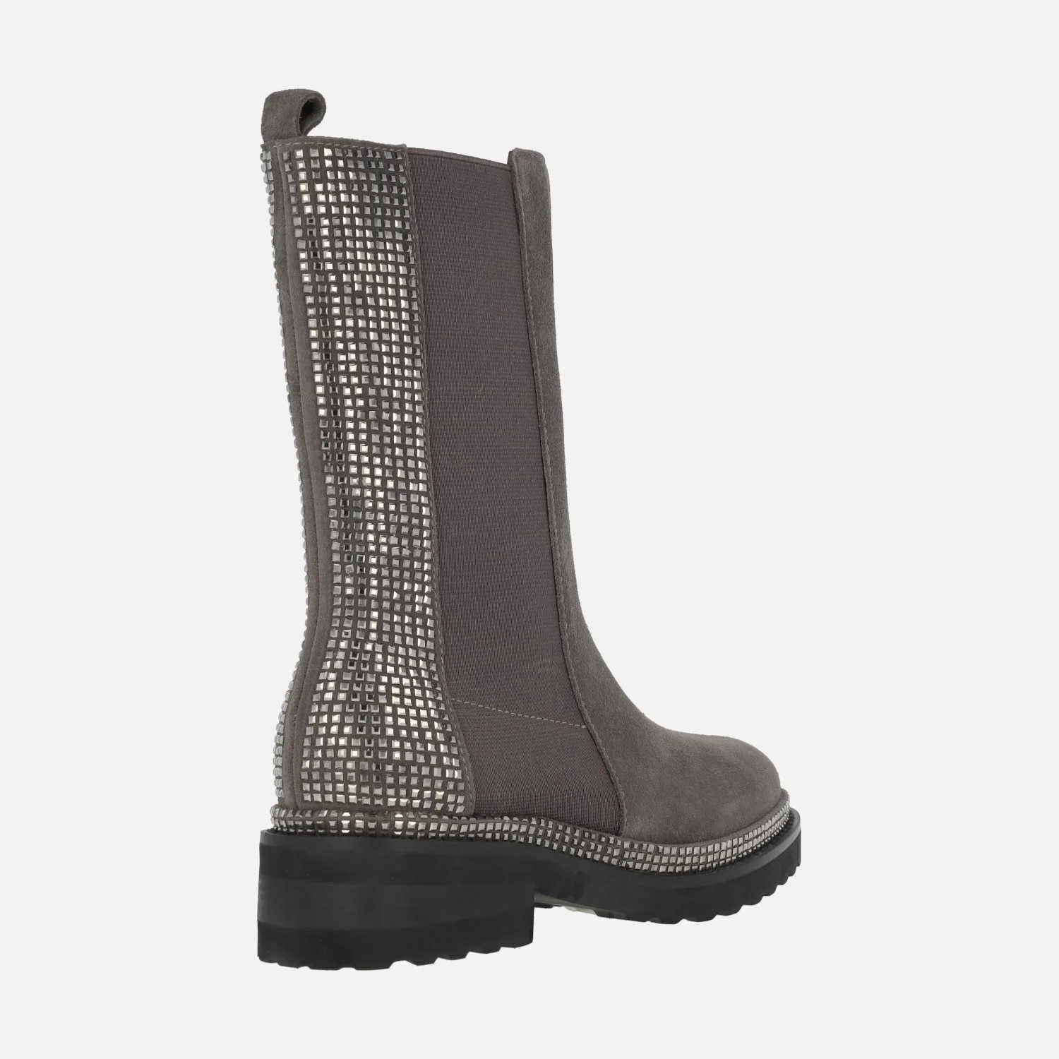 Botas de media caña de la marca Alma en pena, modelo I240854 Crosta grey. Botas elaboradas en piel serraje color gris con piezas elásticas a ambos lados y trasera cubierta de strass. También detalle de vira de strass pegada al piso. Interior mixto en tejido y otros materiales. Piso de goma, con tacones de 4,5 cms de altura (2 cms parte delantera). Caña de 23 cms de altura con tirador.