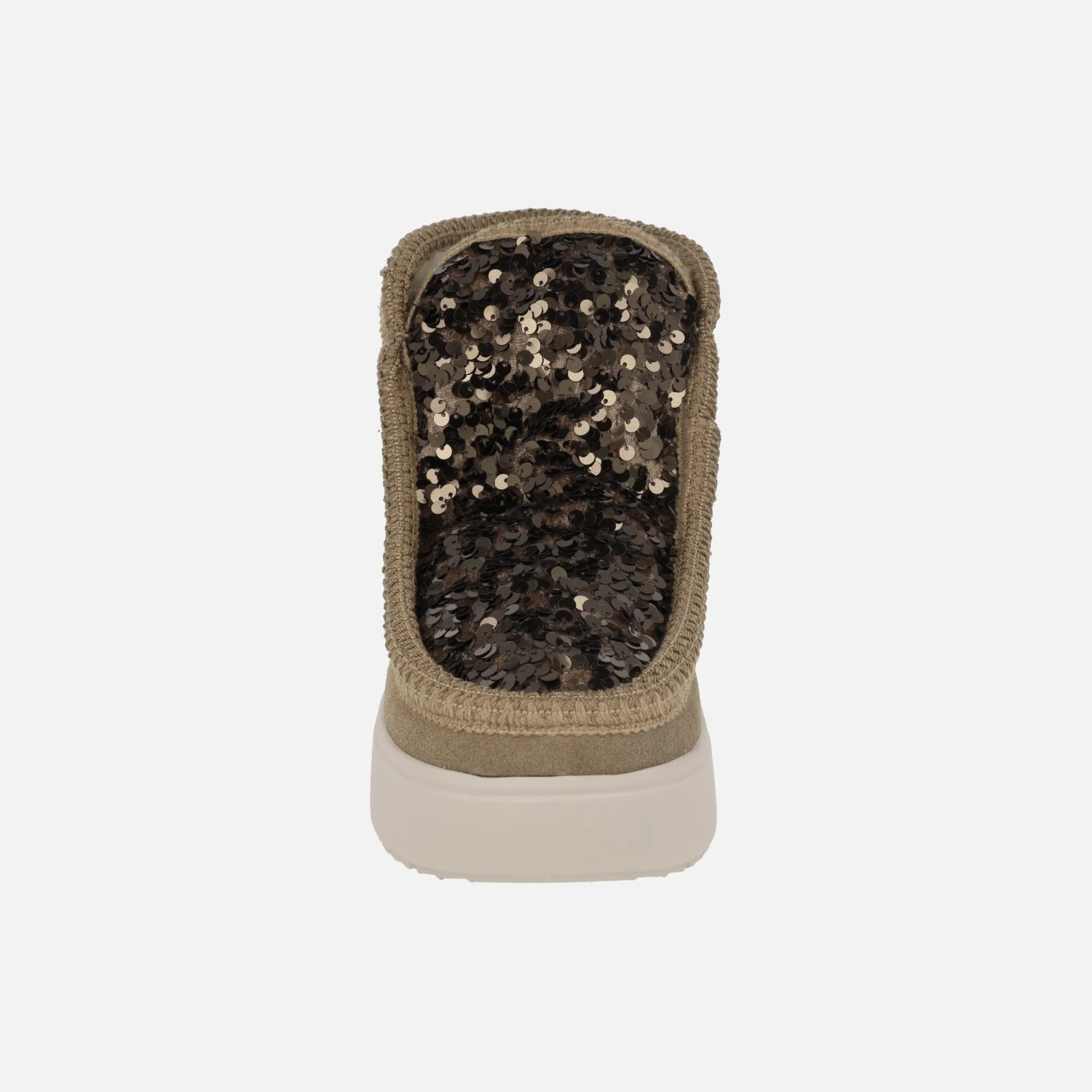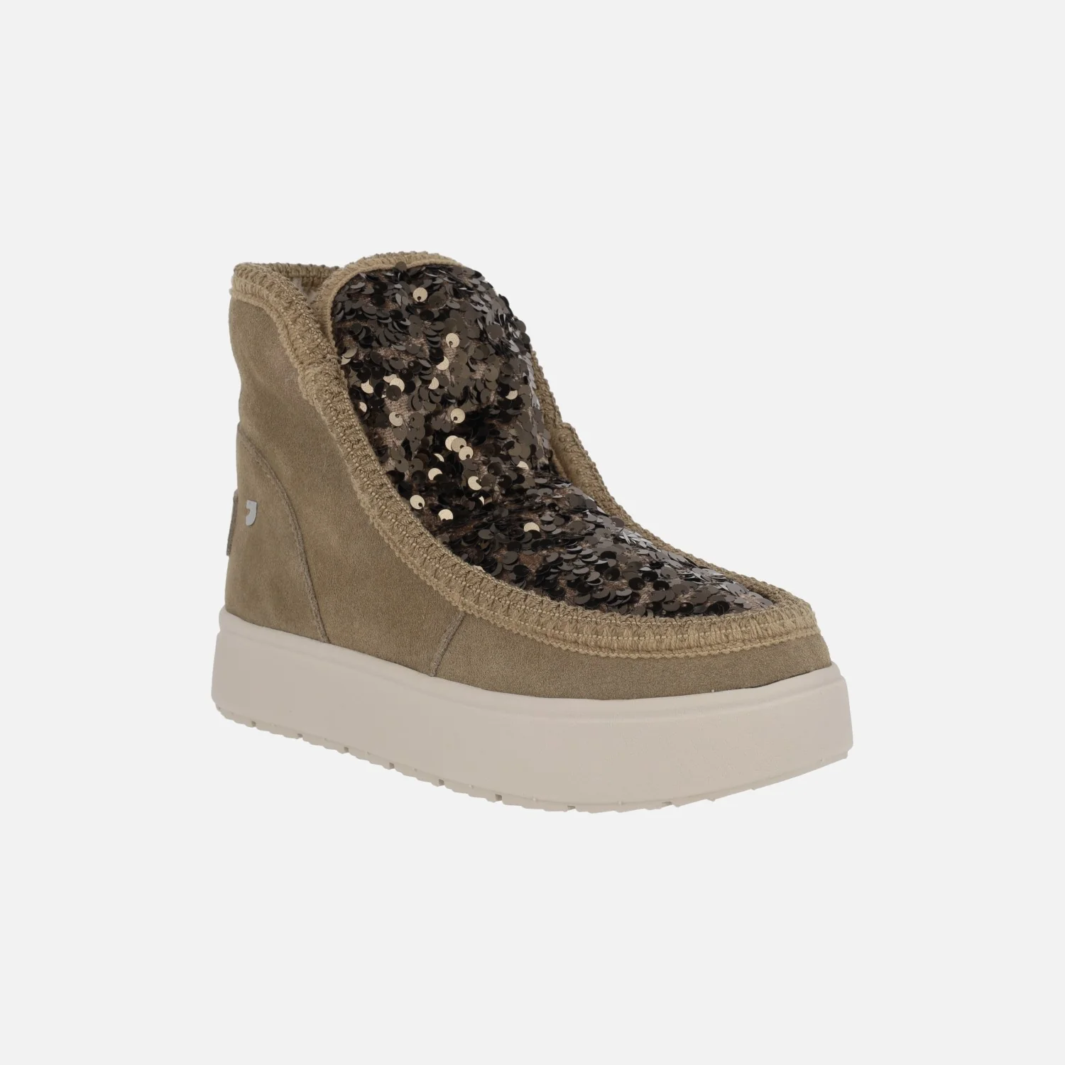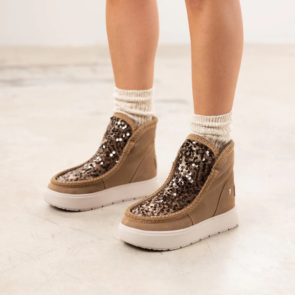 Botas estilo australianas de la marca Gioseppo, modelo Stark 73267, disponibles en color taupe. Botas de piel serraje con pala textil y lentejuelas. Forro interior de pelo (planta y caña). Plantillas extraíbles. Altura de caña 12,5 cms. Piso de goma eva, muy ligero, de aproximadamente 3 cms de altura.