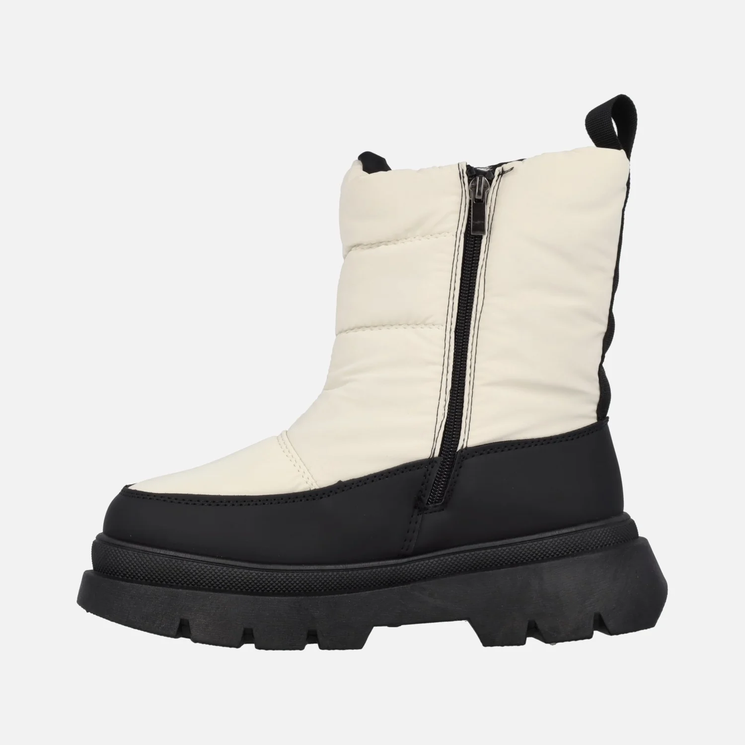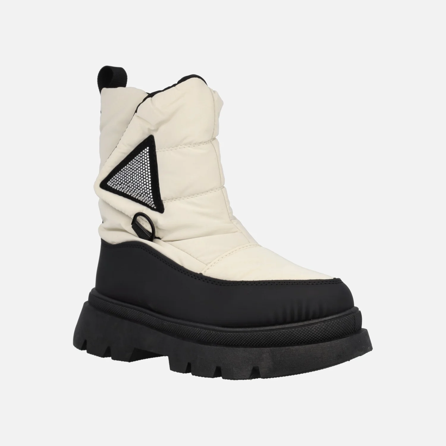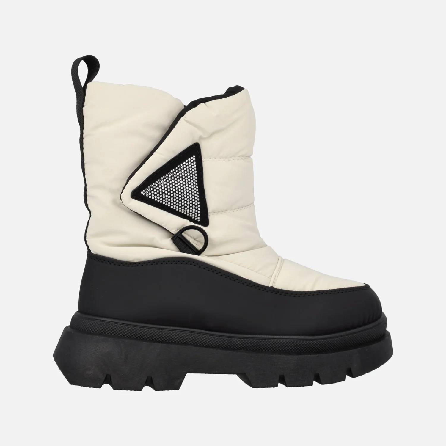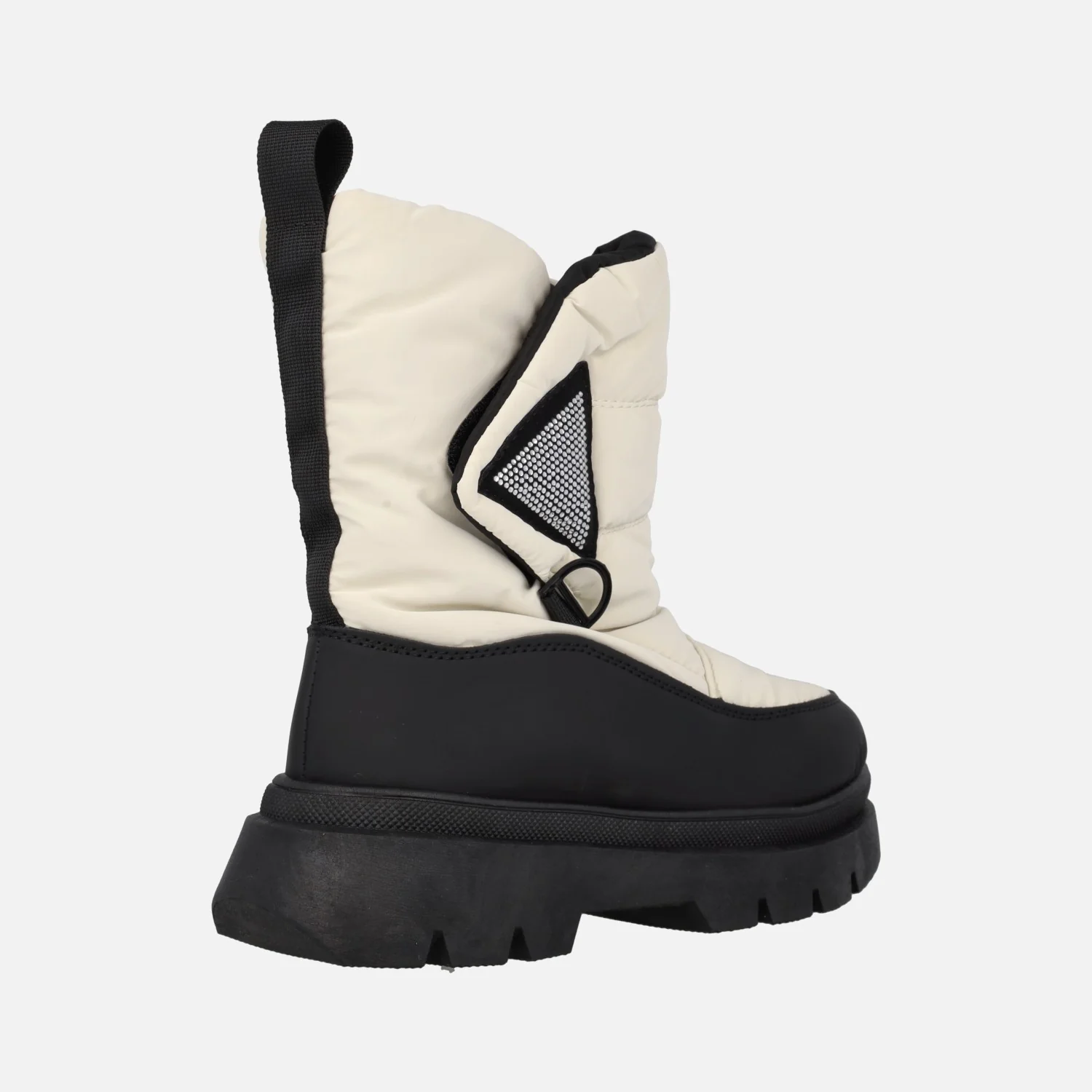 Botas estilo nieve de la marca Exe modelo HD2568 Fabric beige. Botas elaboradas en tejido acolchado beige combinado con detalles en sintético negro. Cierre de cremallera en el lado interior y cierre de velcro en el lado exterior, con detalle de triángulo cubierto de strass. Caña de 18,5 cms de altura, con tirador trasero. Interior forrado de pelo con plantillas extraíbles. Piso de goma con 5,5 cms de altura trasera (plataforma delantera de 4 cms).