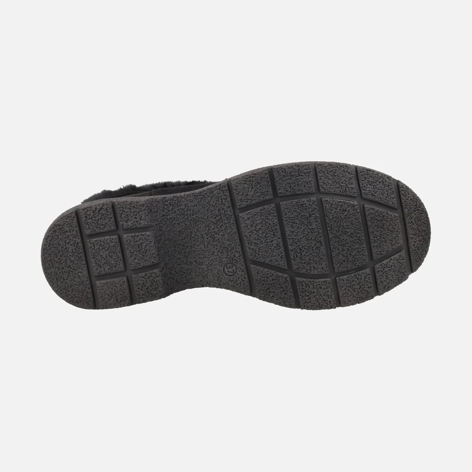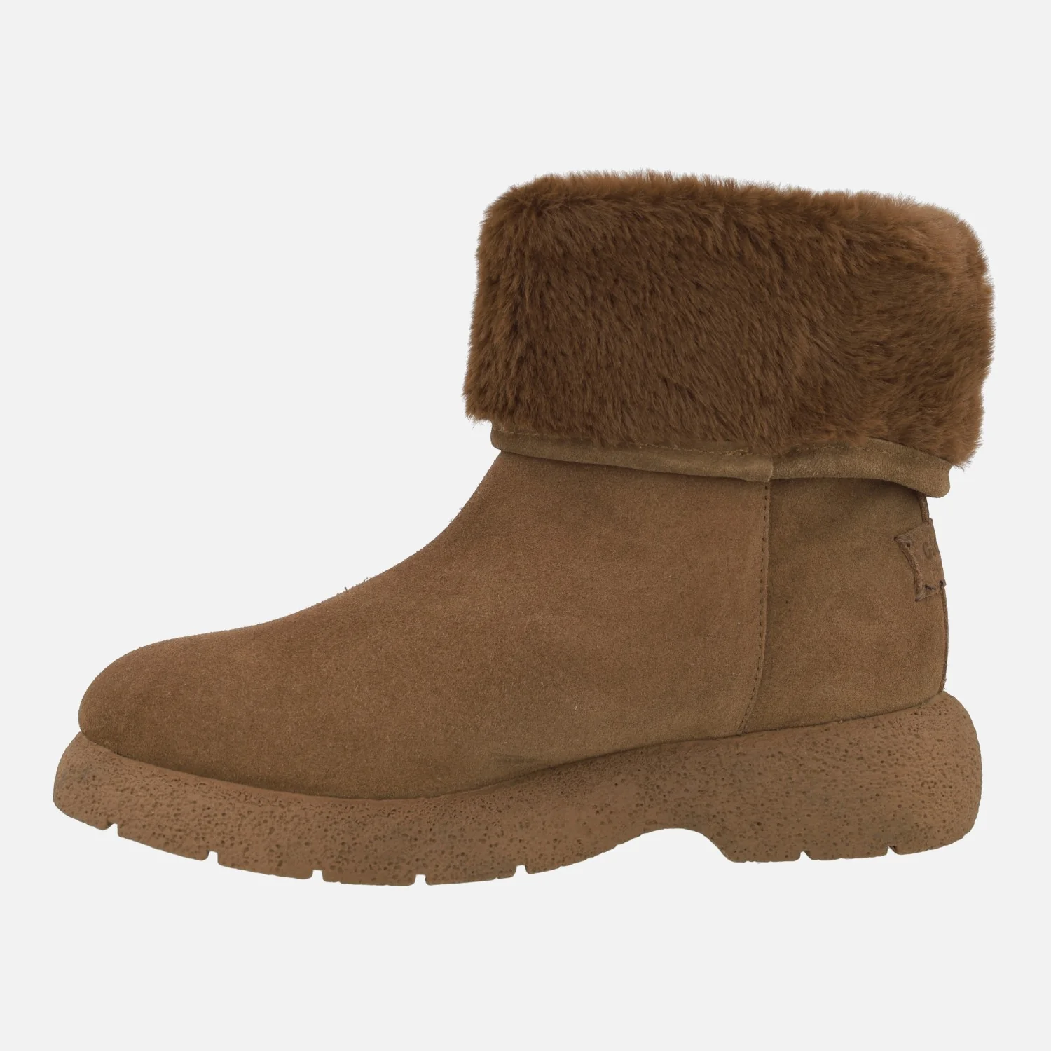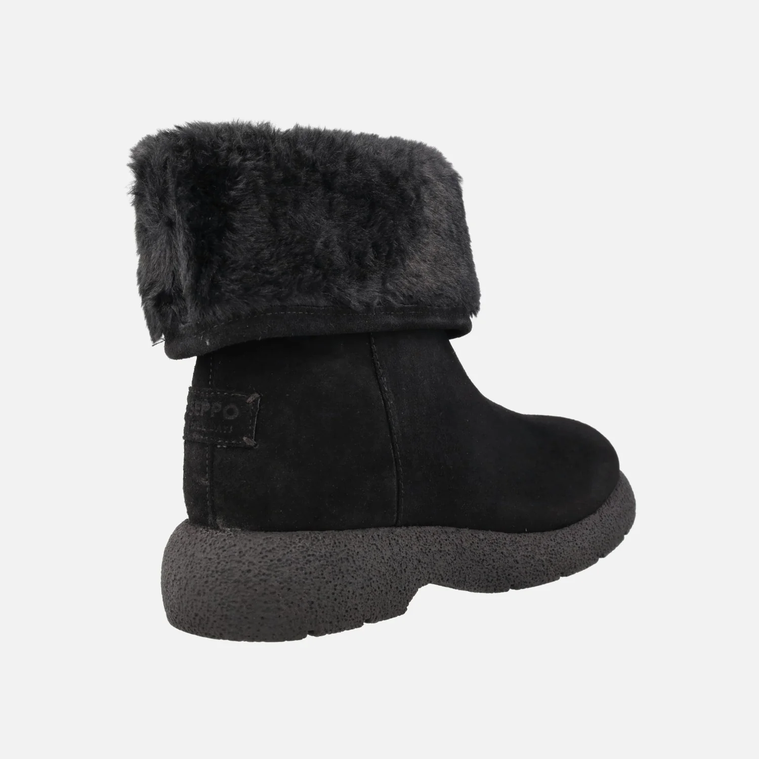 Botas multiposición de la marca Gioseppo, modelo Wilton 73626, disponibles en negro o en cuero. Botas de piel serraje con vuelta ancha de pelo (son multiposición porque también pueden llevarse estiradas). Interior textil con planta de piel. Piso de caucho de 4 cms de altura trasera (2 cms parte delantera). Altura de caña con la vuelta 17 cms. ( 22 cms con la caña estirada).