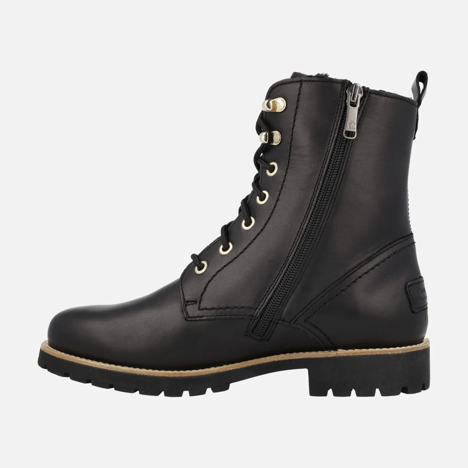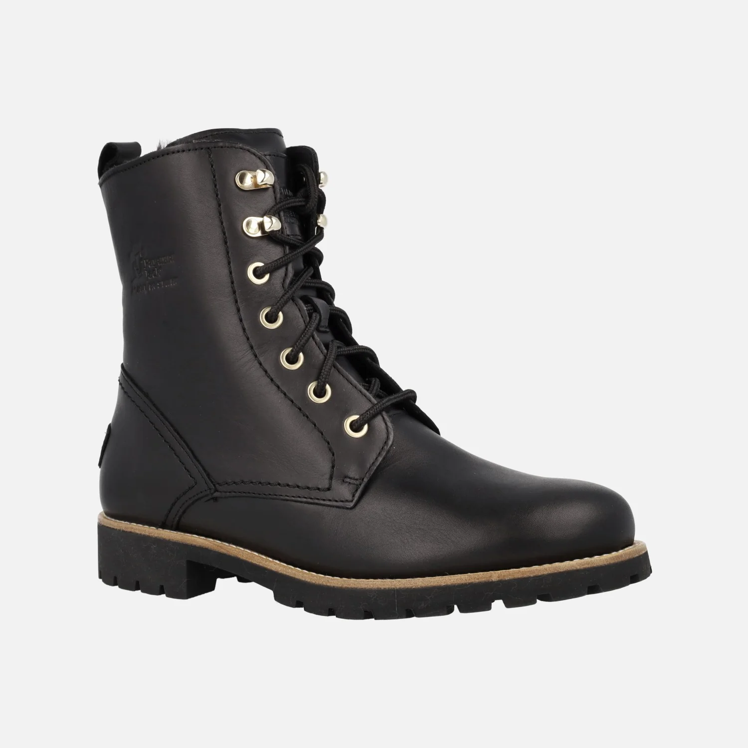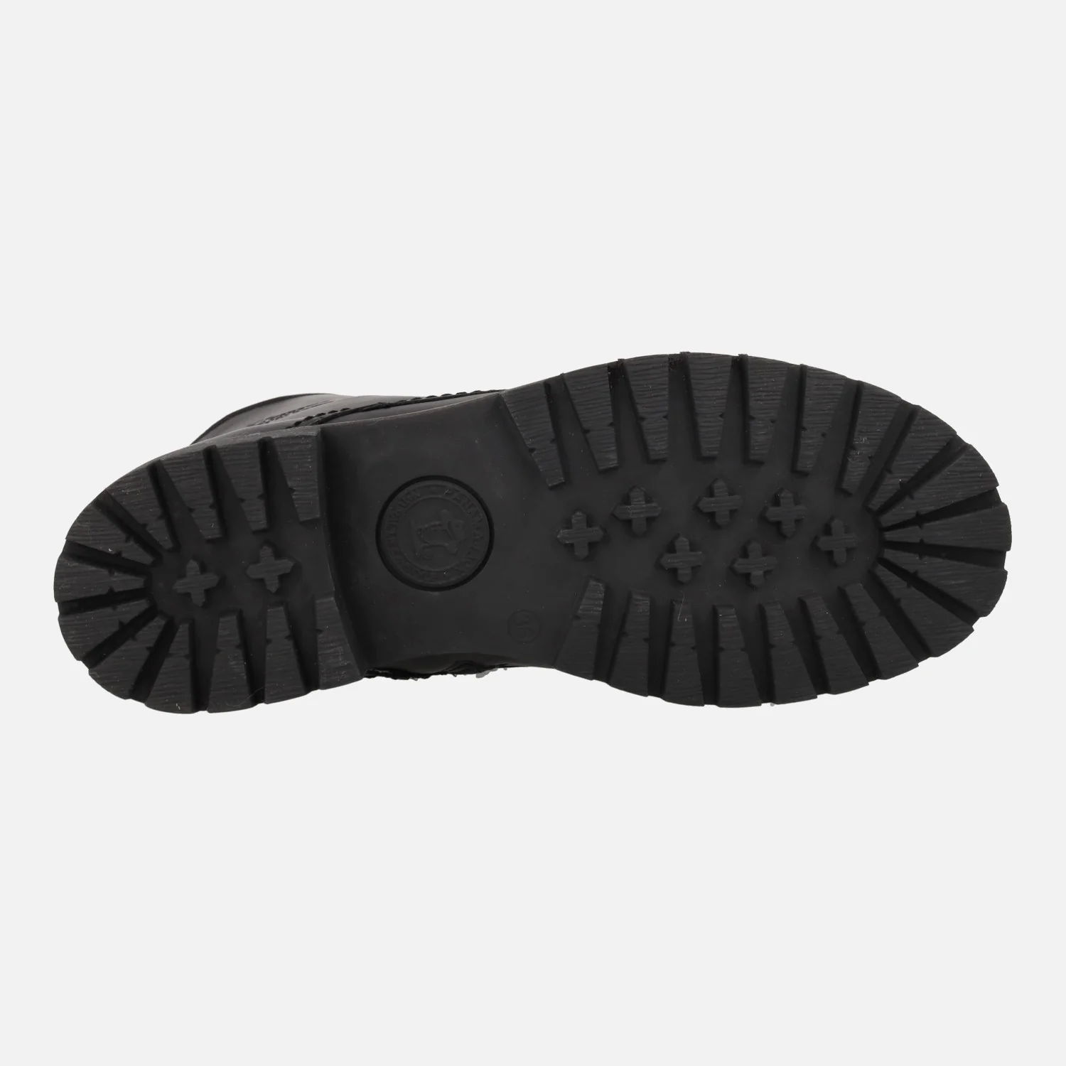 Botas de cordones Panama jack Fara Trav B3 Napa Black. Botas negras de piel con cordones, además de cremallera en el lado interior. Forro de pelo, en la caña y en la planta. Plantillas extraíbles. Caña de 16,5 cms, con tirador trasero. Piso de caucho, con 3 cms de tacón. Made in Spain.