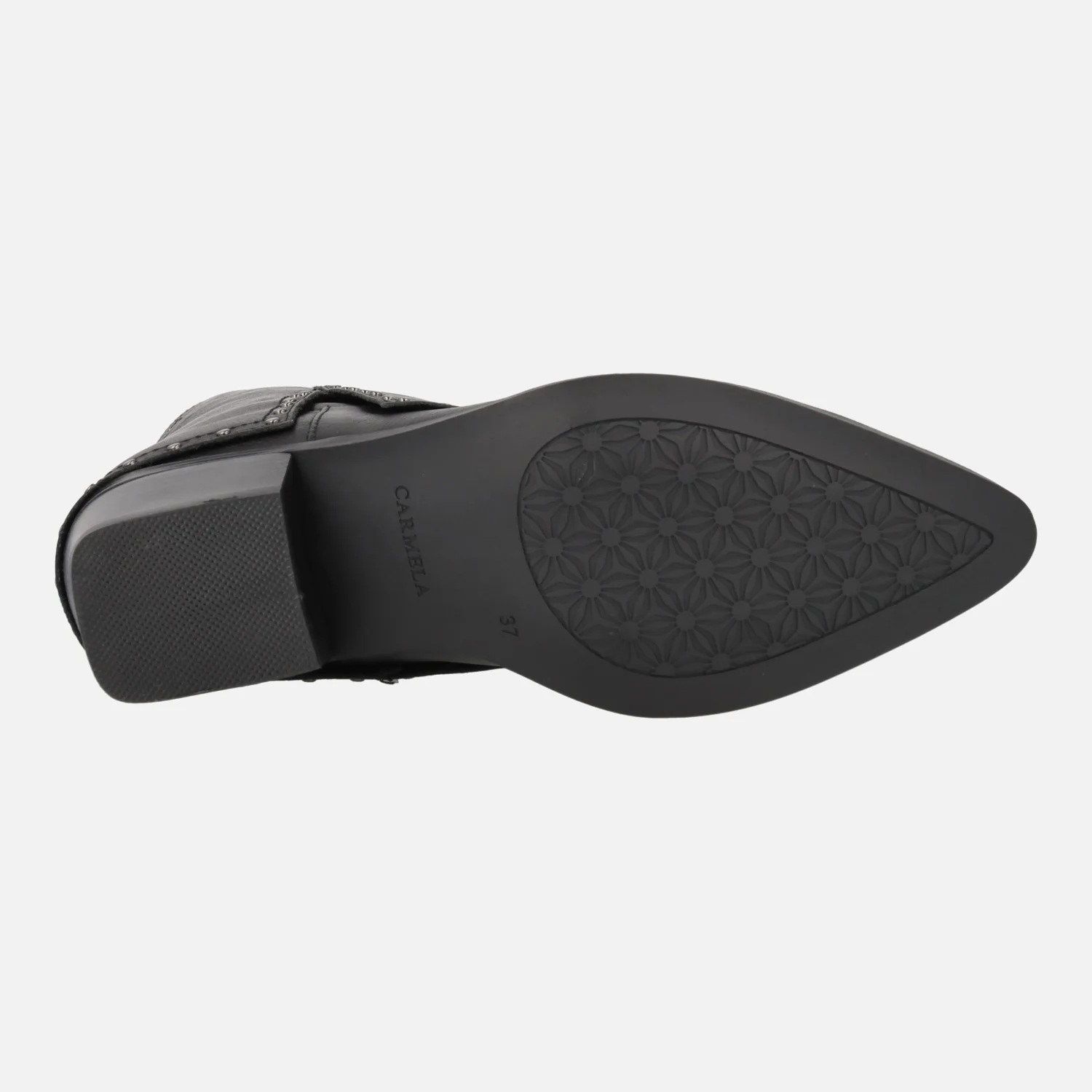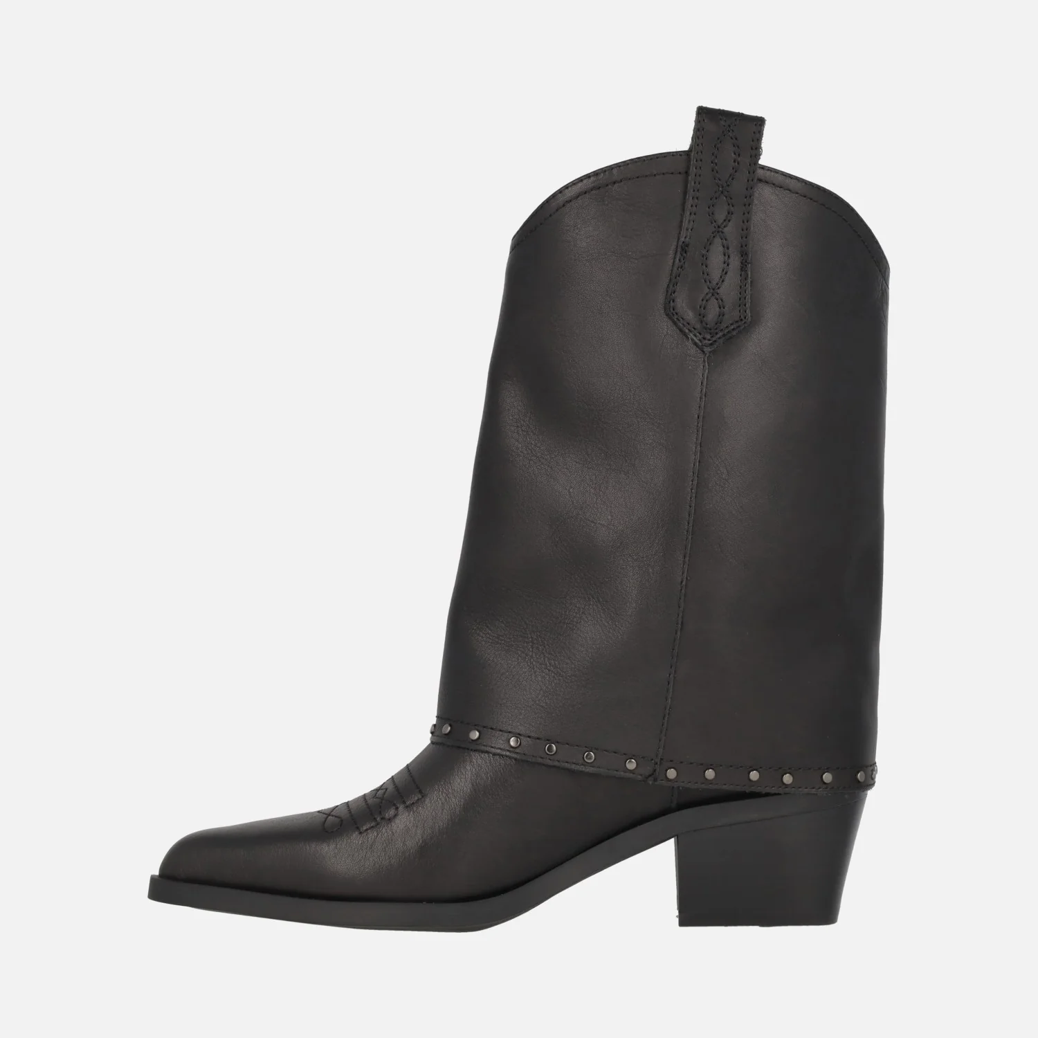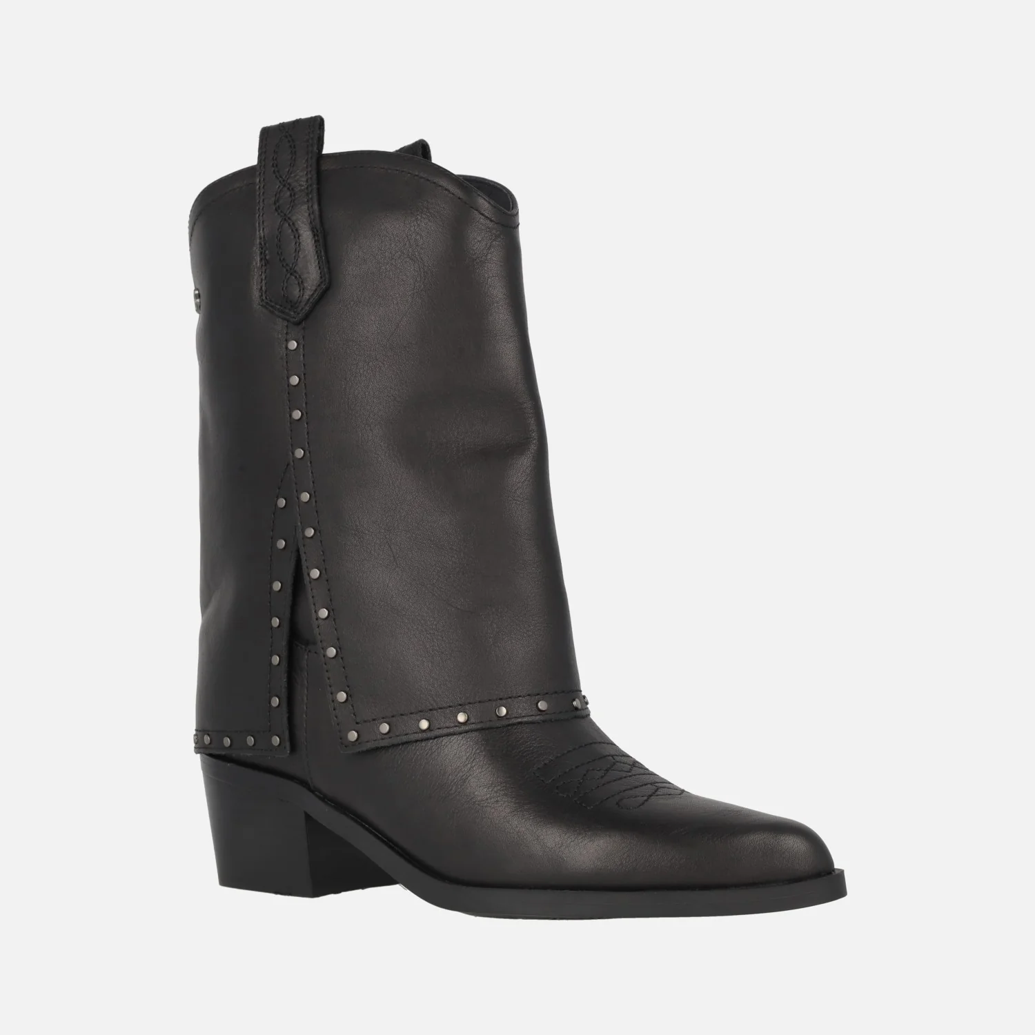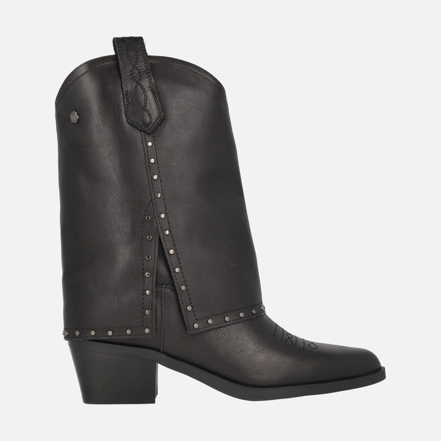 Botas de caña baja para mujer de la marca Carmela shoes modelo 161961 negro. Botas de inspiración cowboy, realizadas en piel negra con detalle de vuelta ancha en la caña (polaina) con tachas metálicas decorativas. Bordado cowboy en la puntera. Tiradores para facilitar la puesta. Interior mixto en piel y tejido. Tacones de 5 cms de altura. Caña de aproximadamente 22,5 cms.