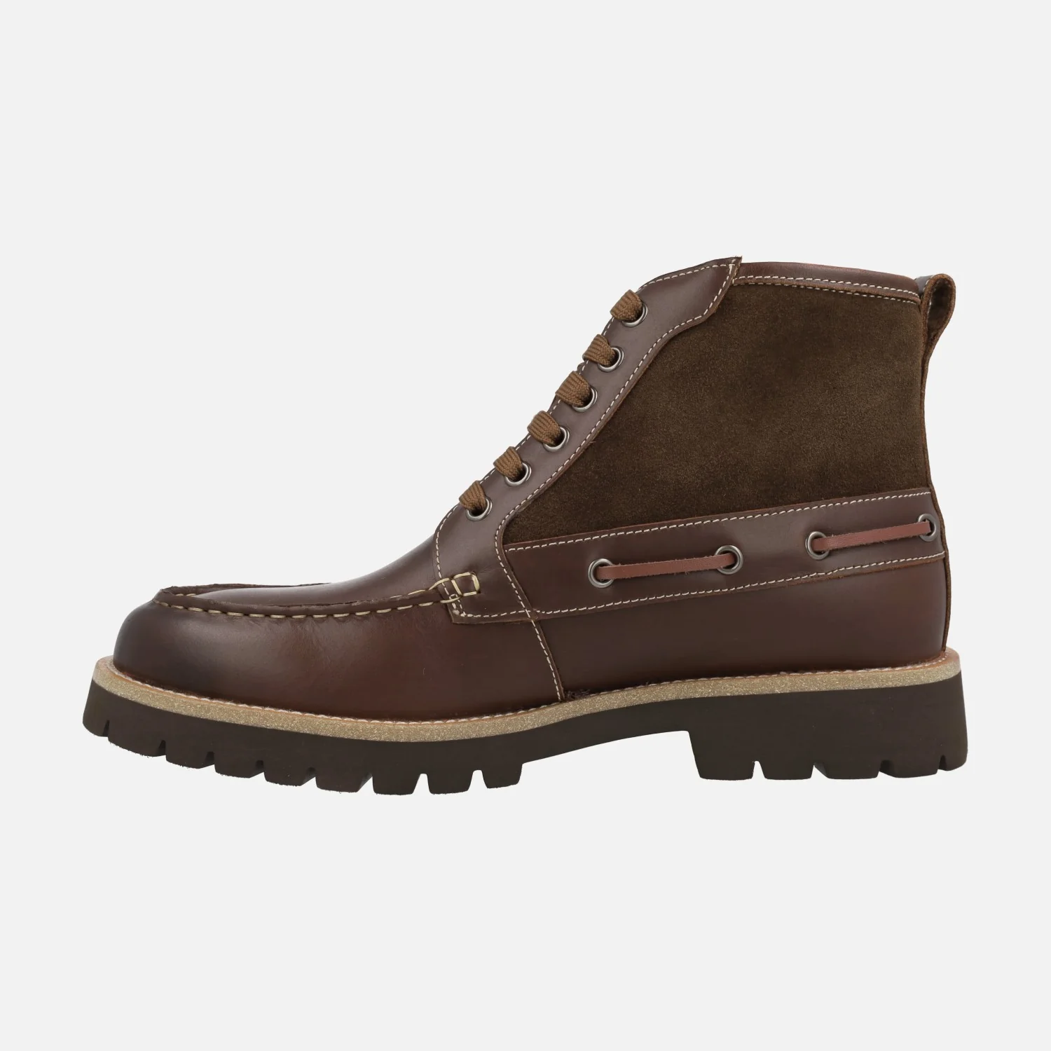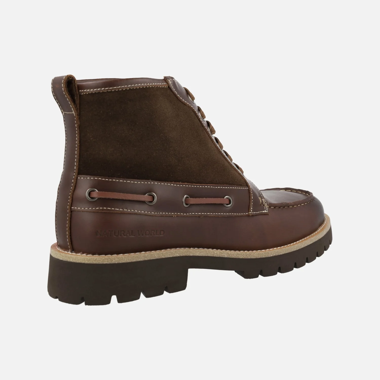 Botas de cordones para hombre de inspiración naútica modelo Astral 9082 de la marca Natural World. Botas de cordones, elaboradas en piel y serraje color marrón. Detalle de tirador trasero. Interior textil, con plantillas extraíbles. Piso de caucho.