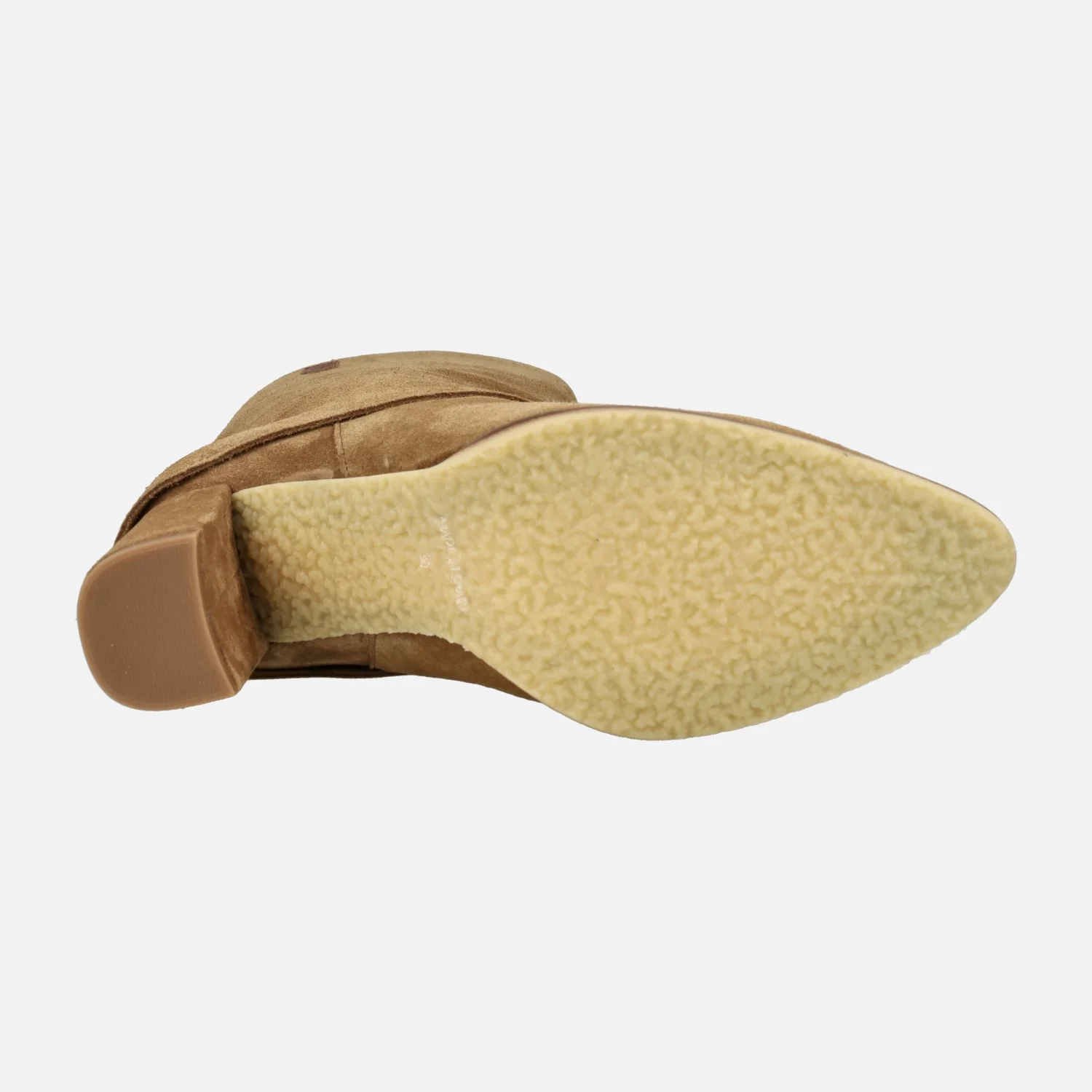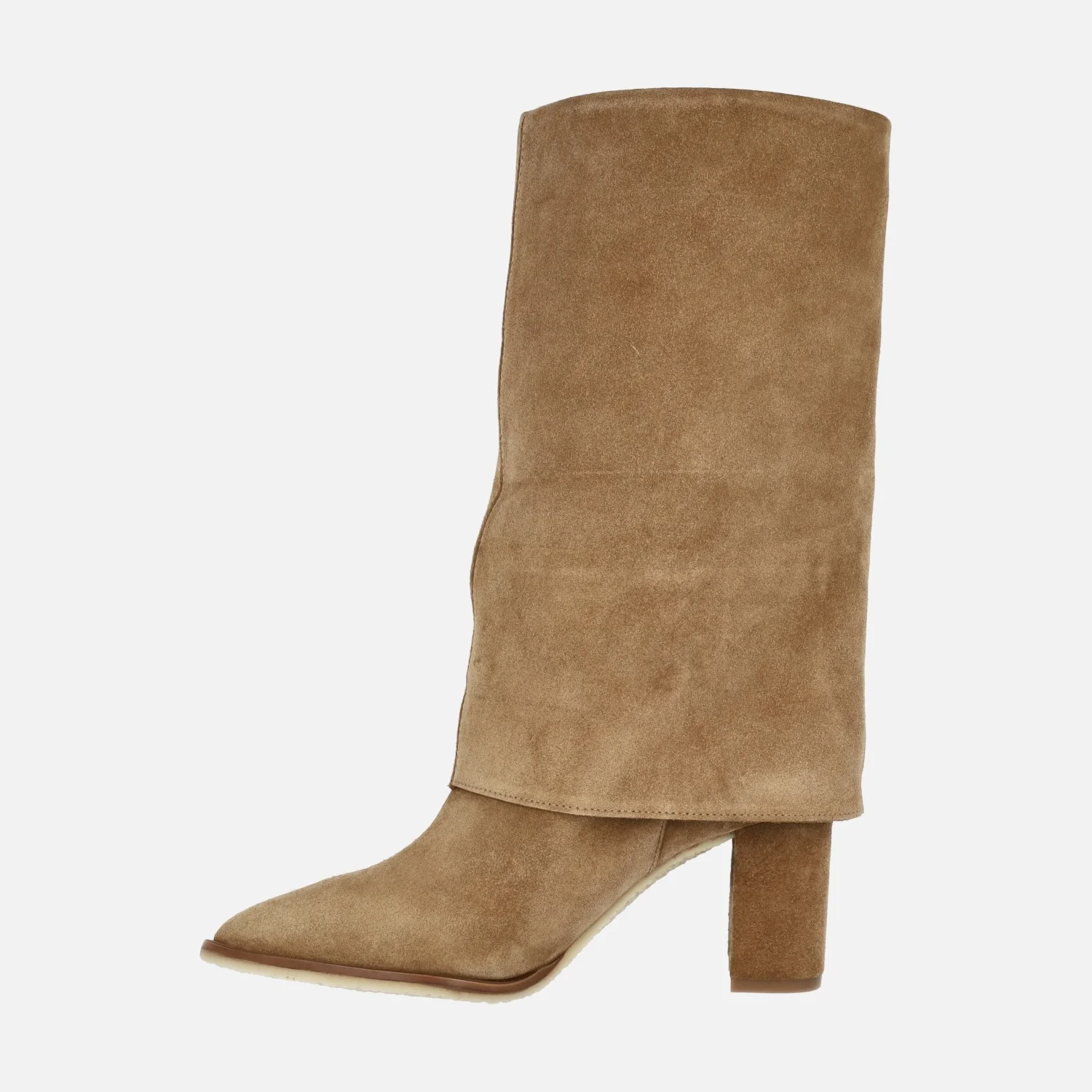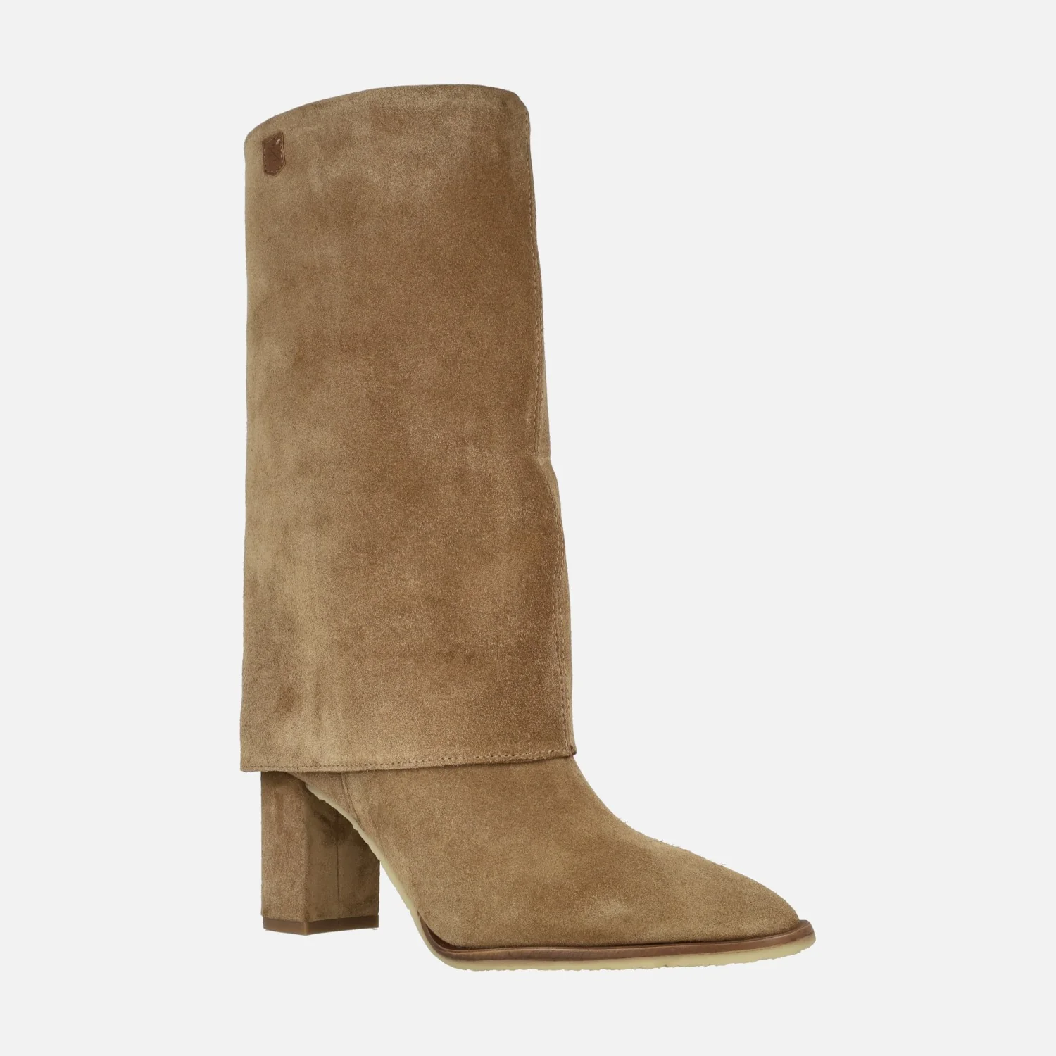 Botas para mujer con detalle de polaina de la marca Popa, modelo Demi serraje cuero. Botas elaboradas en piel serraje color cuero, con detalle de vuelta ancha (polaina) formando la caña. Planta de piel vegana, acolchada. Caña de aproximadamente 26,5 cms de altura. Tacones forrados, de 7 cms de altura.