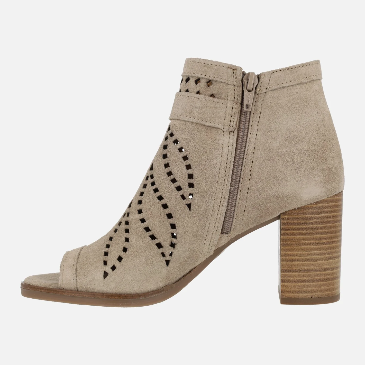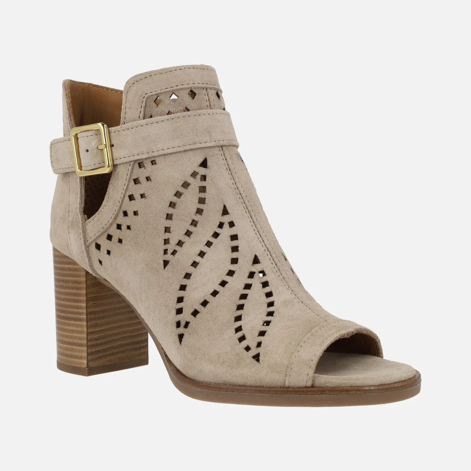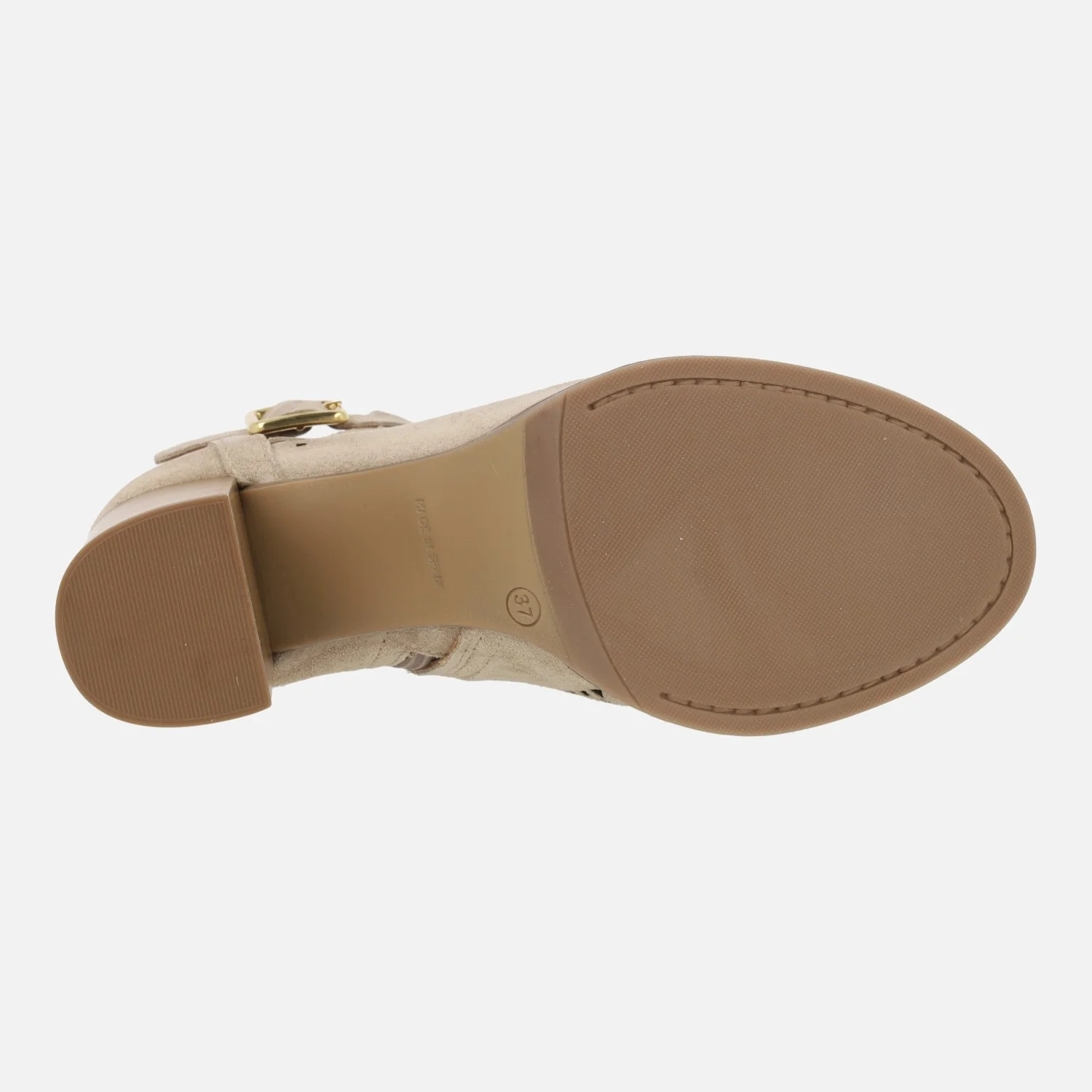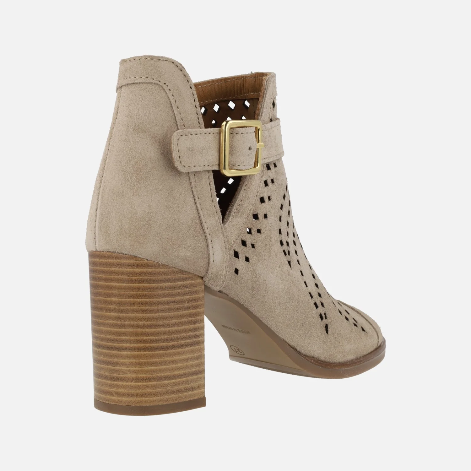 Botines Alpe Liset 5095 Dessert. Botines abiertos de puntera, elaborados en ante color beige con detalle de dibujos troquelados, tira de ante con hebilla dorada y cierre de cremallera en la parte lateral. Interior mixto de piel y tejido. Tacones altos, de aproximadamente 7,5 cms de altura. Made in Spain.