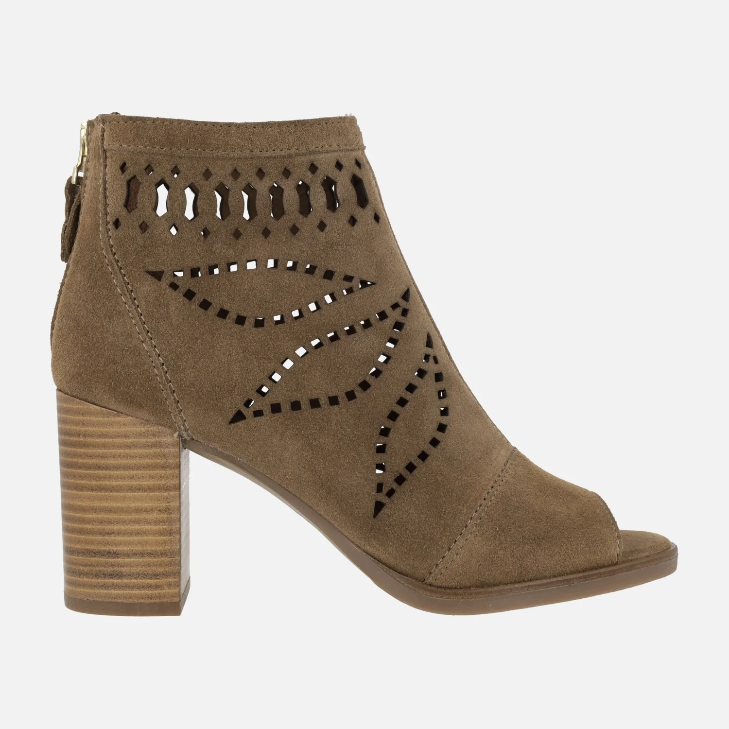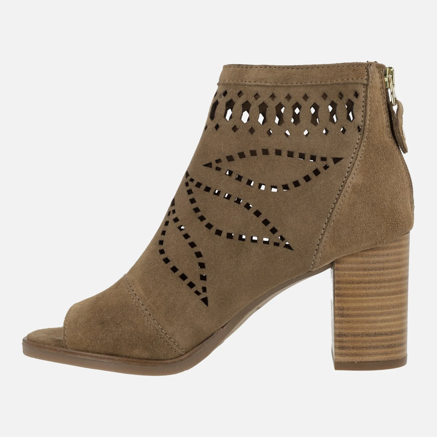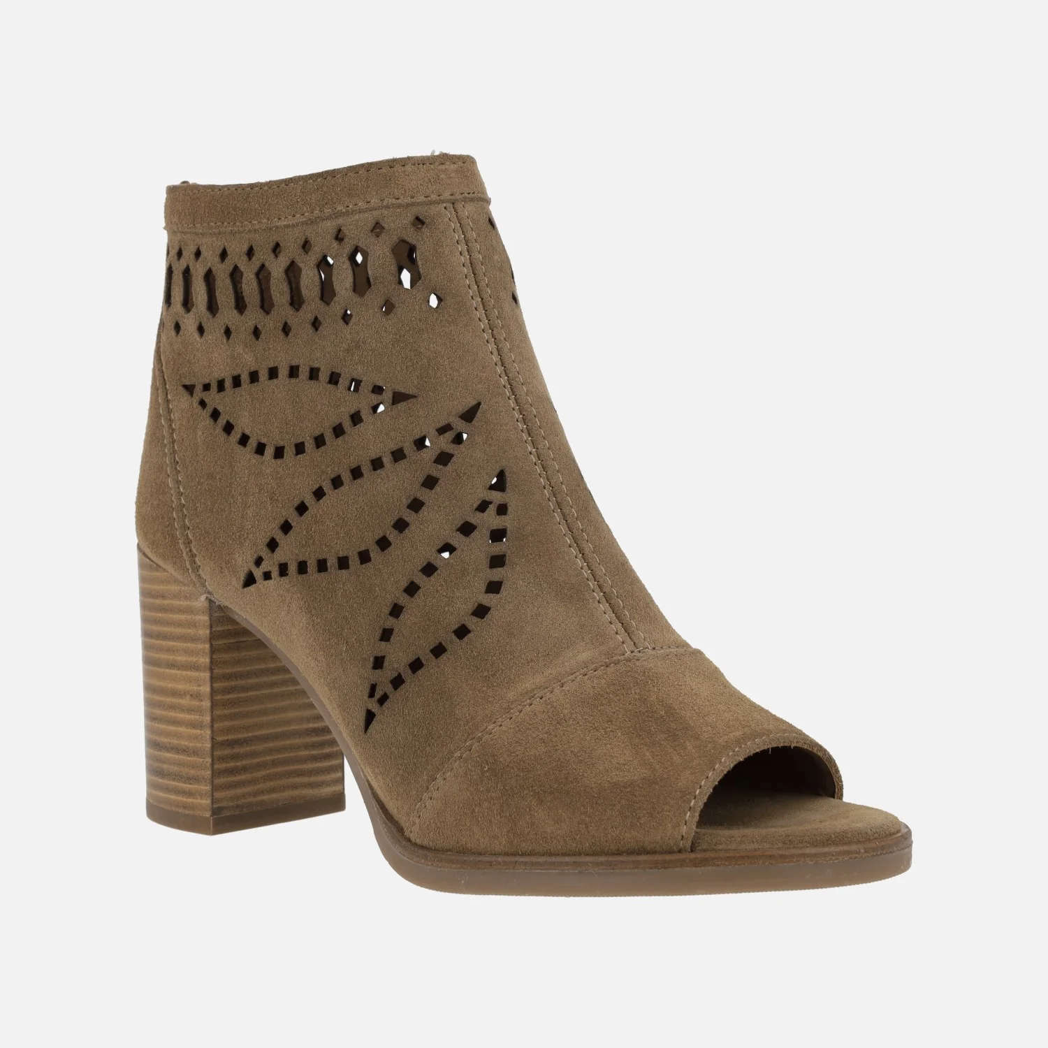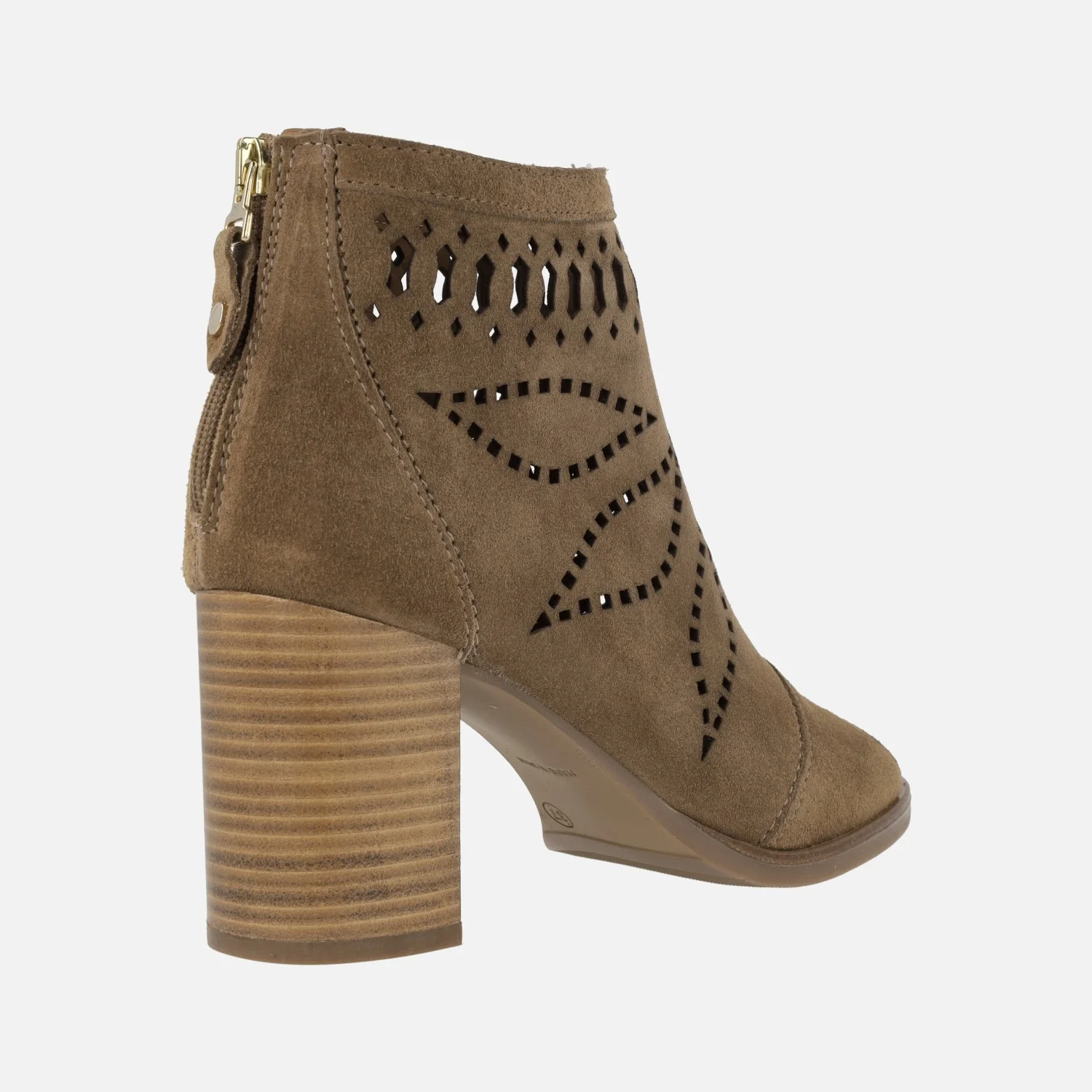 Botines Alpe Liset 5094 Cuero. Botines abiertos de puntera, elaborados en ante color cuero con detalle de dibujos troquelados y cierre de cremallera en la parte trasera. Interior mixto de piel y tejido. Tacones altos, de aproximadamente 8,5 cms de altura. Made in Spain.