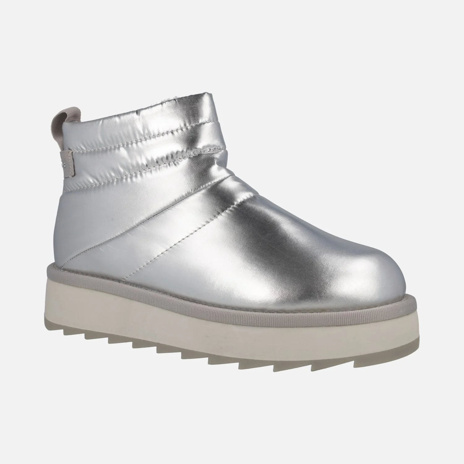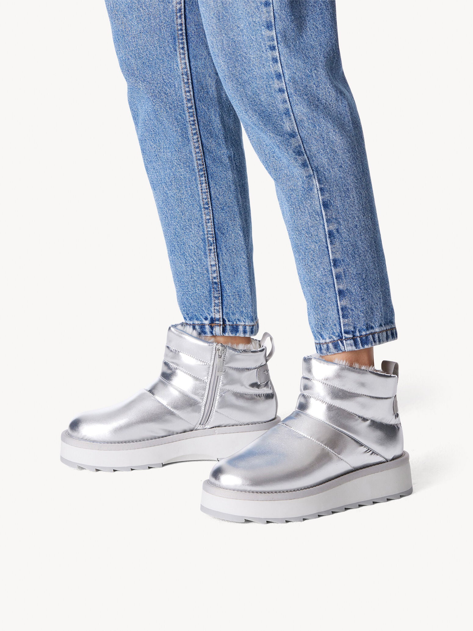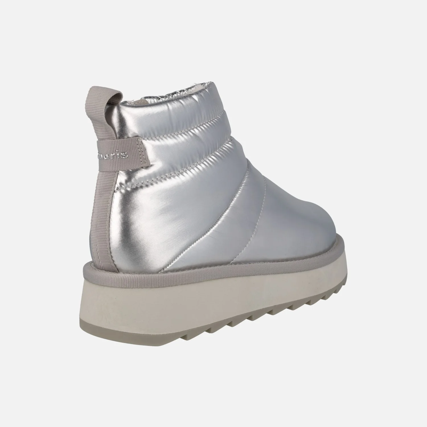 Enamoradas de los nuevos botines Tamaris modelo 1-26821-41 Silver. Botines bajos de caña, elaborados en materiales sintéticos en metalizado plata. Botines acolchados, con tirador trasero para facilitar el calce, así como cierre de cremallera en el lado interior. Forro y planta en pelo cálído y suave. Altura de caña 11 cms. Piso de goma de 4,5 cms de altura trasera (3,5 cms en la parte delantera).