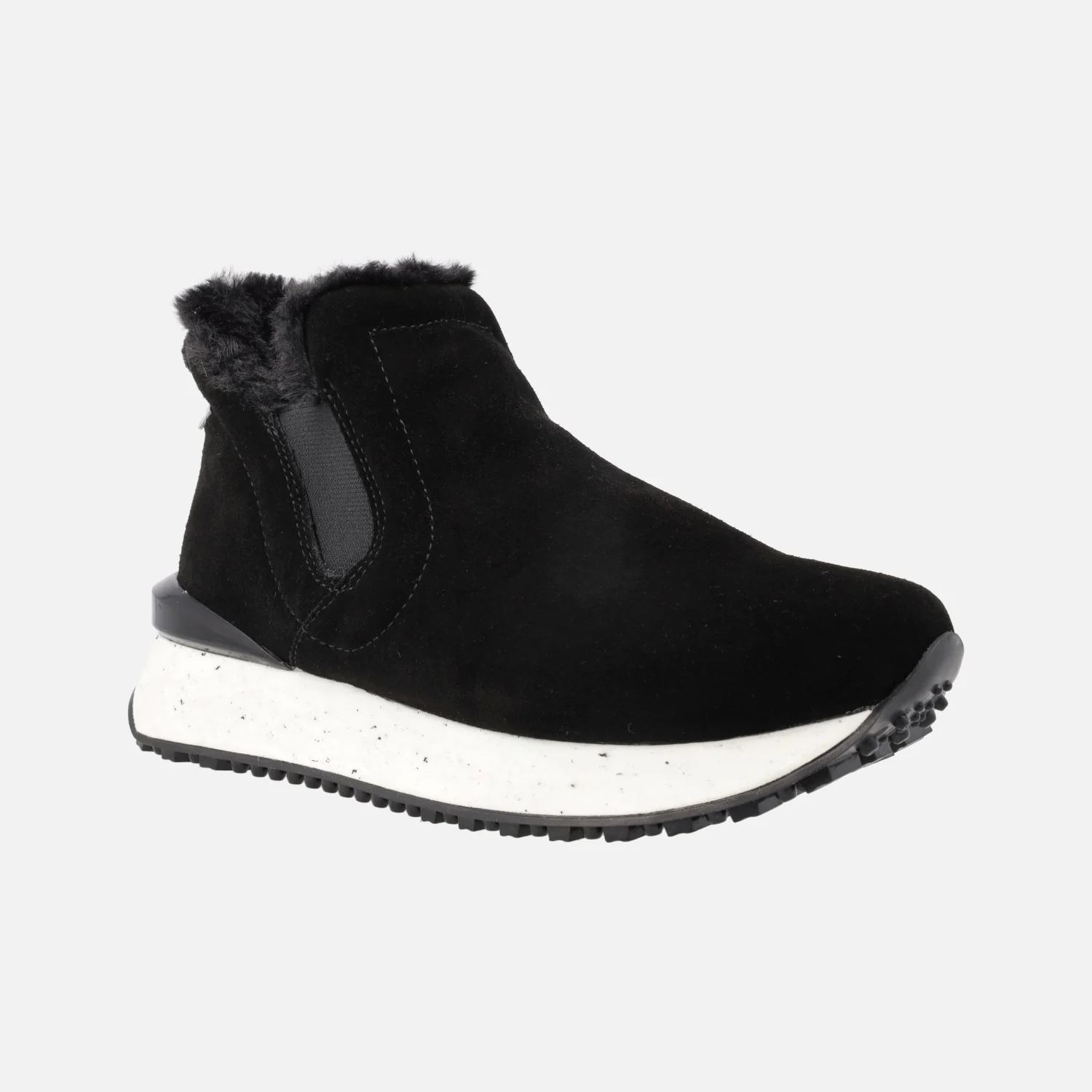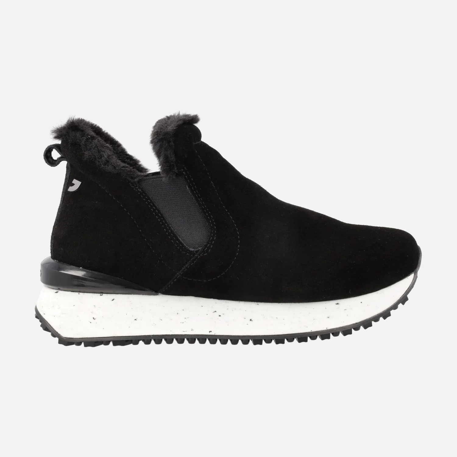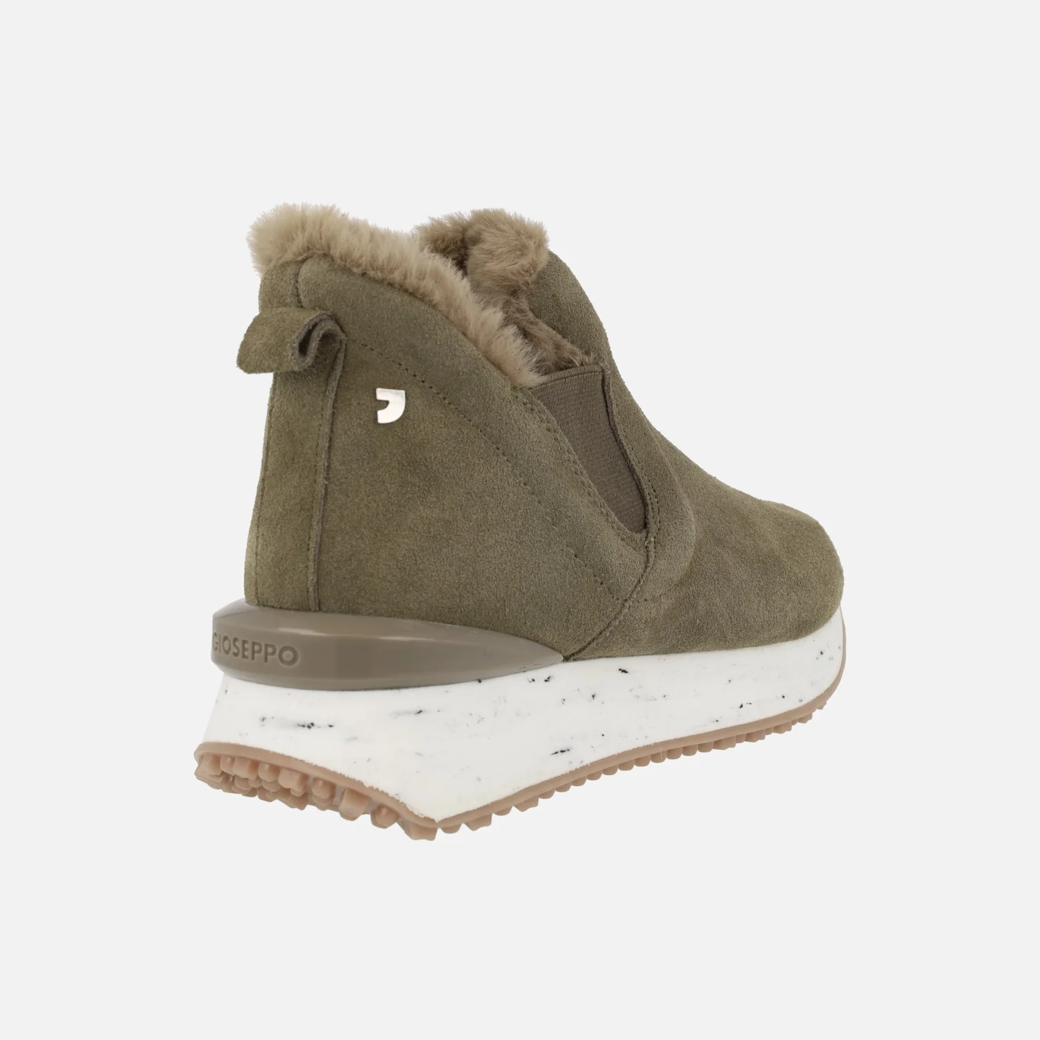 Sneakers estilo botín Gioseppo Jondal 64414. Botines de serraje, disponibles en taupe o negros, con elásticos laterales de estilo chelsea y detalle de pelo en la parte superior. Interior textil. Piso sierra de goma de 3cms de altura trasera (2 cms parte delantera). Aproximadamente 10 cms de altura de caña. Made in Spain.