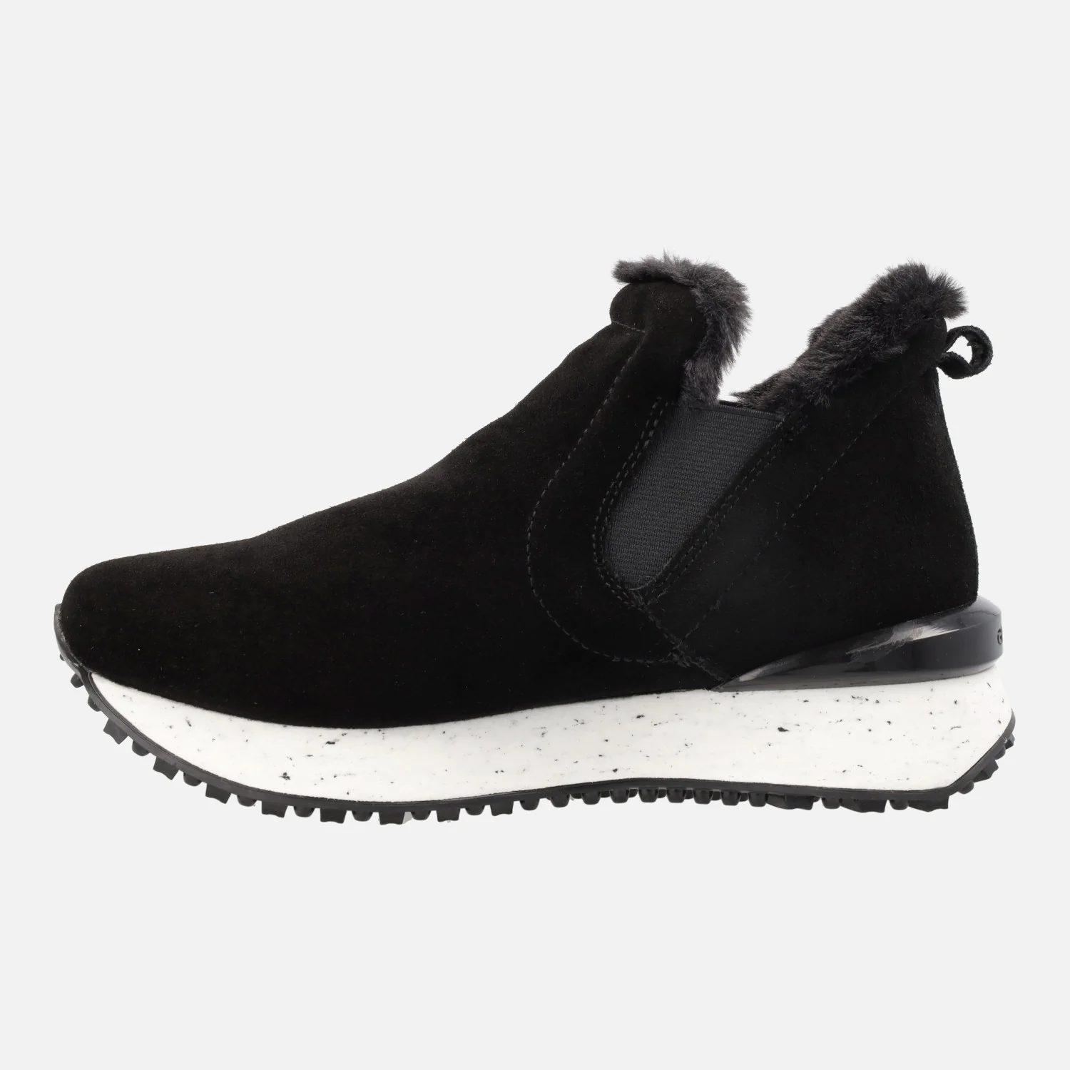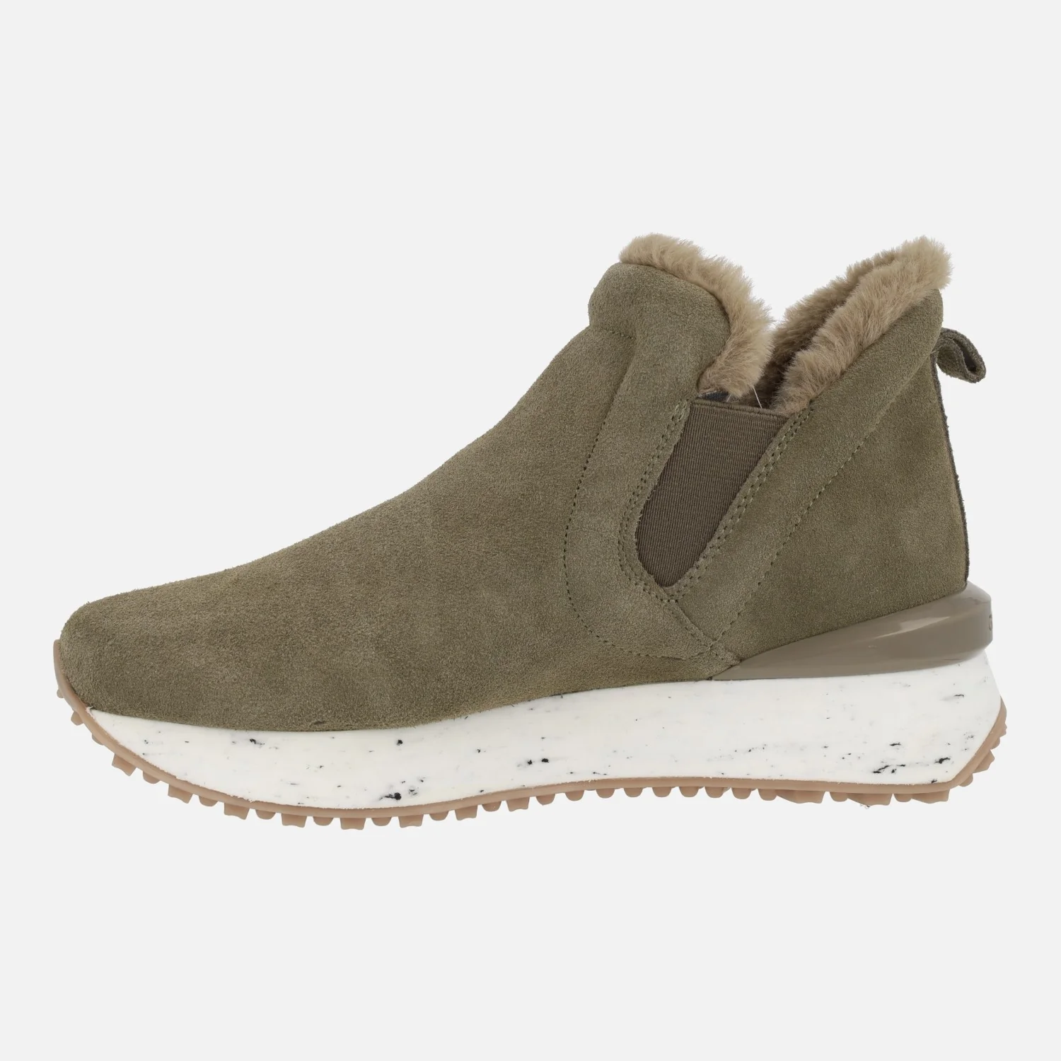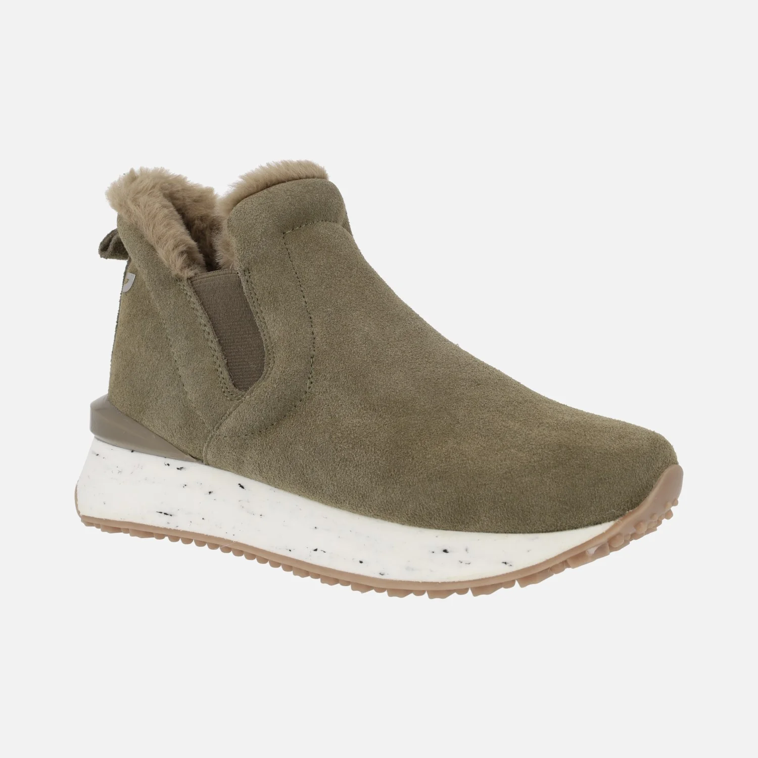 Sneakers estilo botín Gioseppo Jondal 64414. Botines de serraje, disponibles en taupe o negros, con elásticos laterales de estilo chelsea y detalle de pelo en la parte superior. Interior textil. Piso sierra de goma de 3cms de altura trasera (2 cms parte delantera). Aproximadamente 10 cms de altura de caña. Made in Spain.