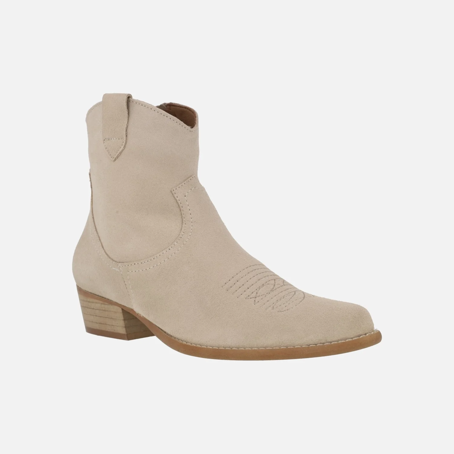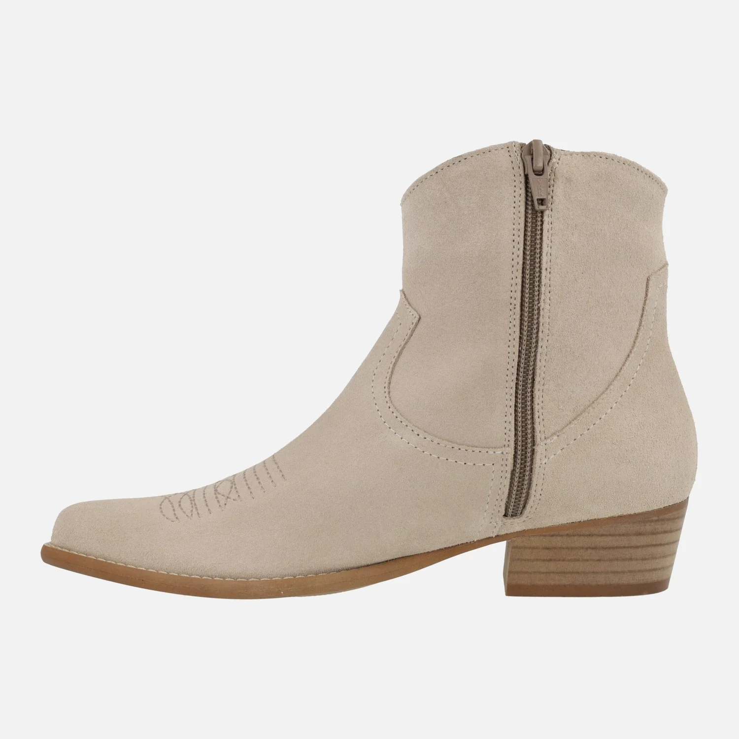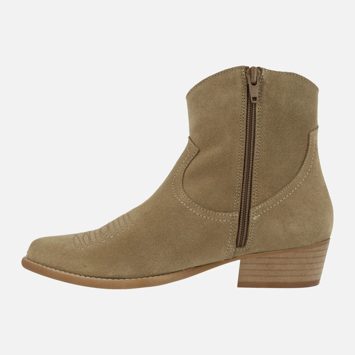 Botines para mujer estilo cowboy modelo Caliope de la marca Bryan Stepwise. Elaborados en piel serraje, con cierre de cremallera en lateral interior y adorno de tirador en el exterior. Disponibles en color tierra (cuero) o carne (beige). Llevan dibujos pespunteados en la puntera. Interior mixto piel/textil. Caña de 16 cms de altura. Tacones anchos, de 4 cms. Made in Spain.