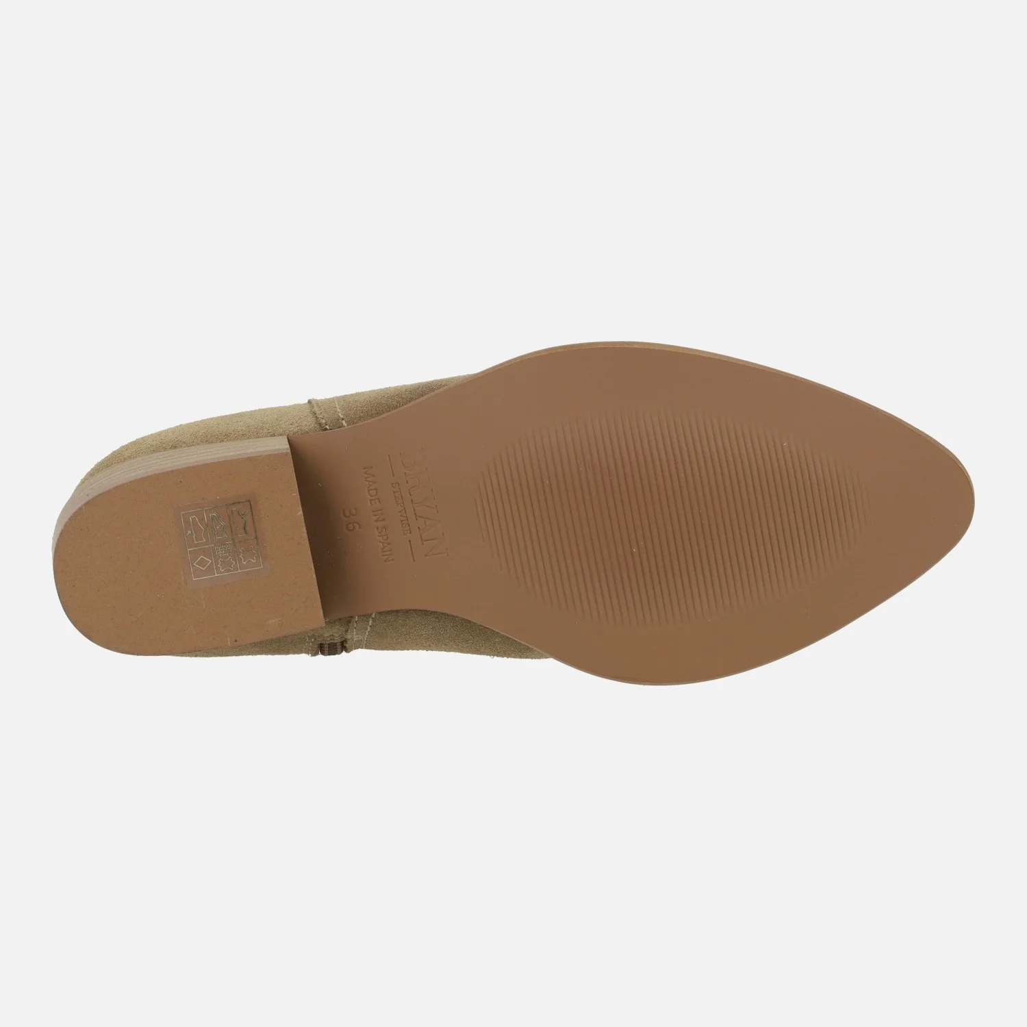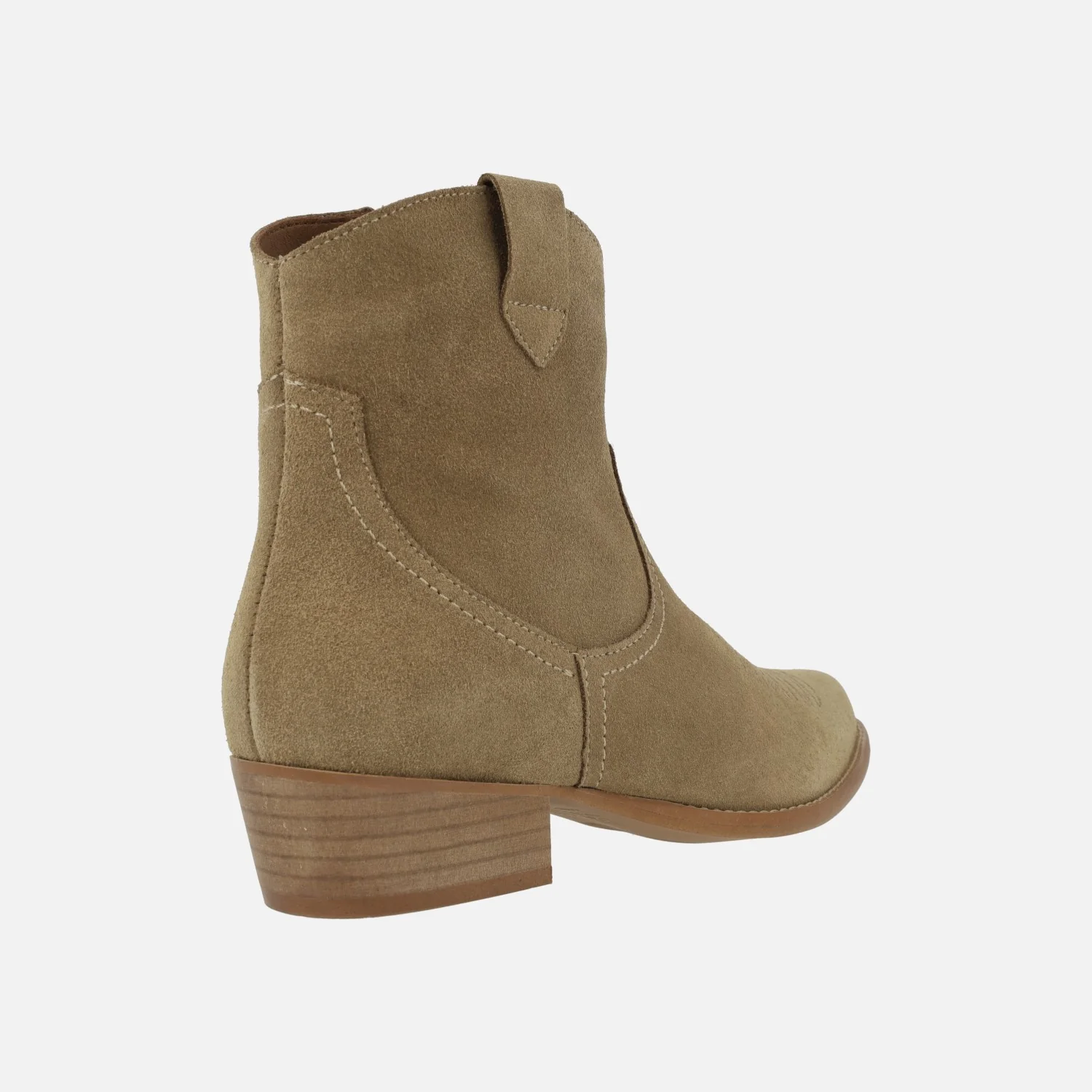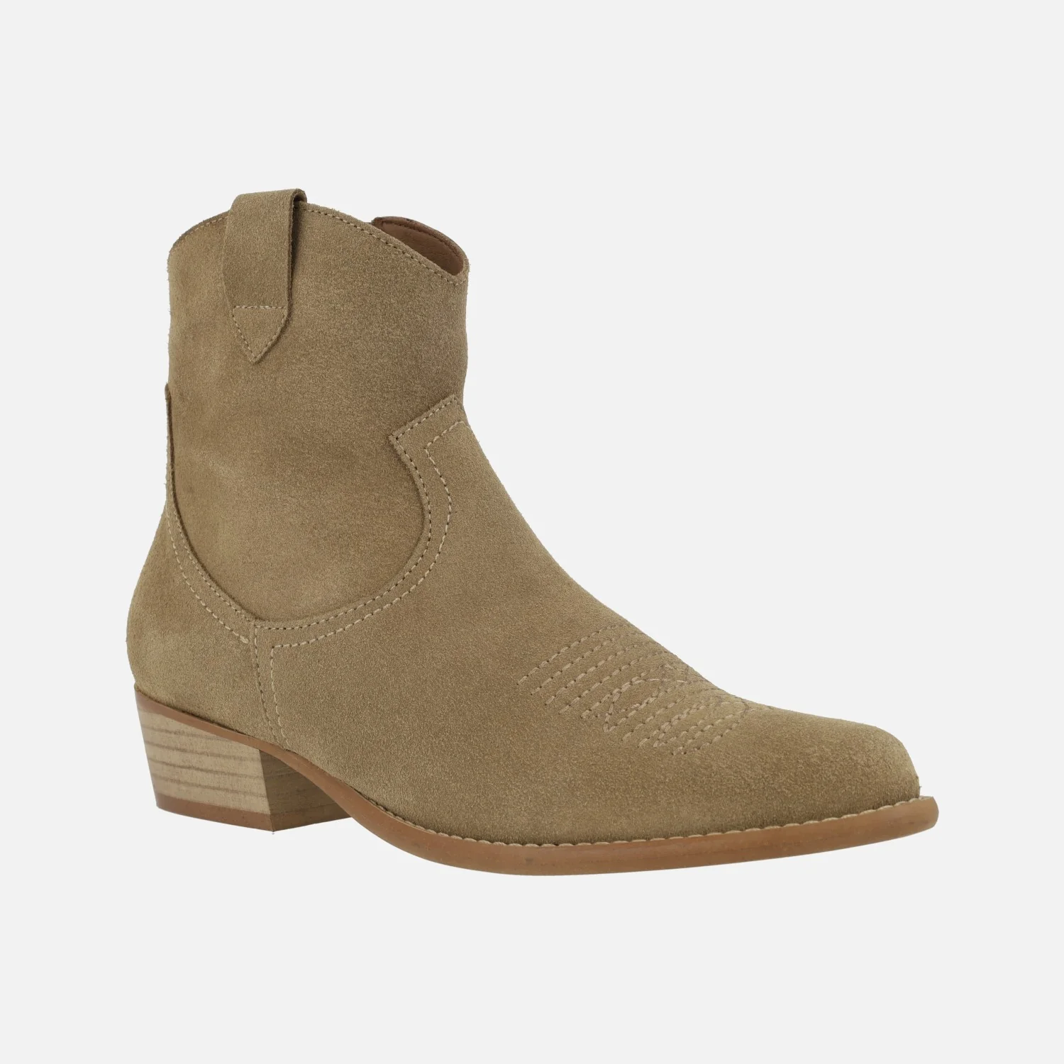 Botines para mujer estilo cowboy modelo Caliope de la marca Bryan Stepwise. Elaborados en piel serraje, con cierre de cremallera en lateral interior y adorno de tirador en el exterior. Disponibles en color tierra (cuero) o carne (beige). Llevan dibujos pespunteados en la puntera. Interior mixto piel/textil. Caña de 16 cms de altura. Tacones anchos, de 4 cms. Made in Spain.
