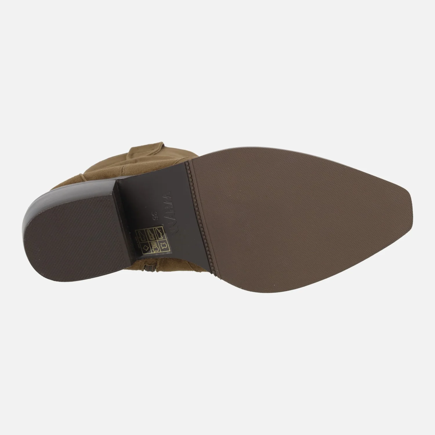Botines cowboy para mujer de la marca Whynn modelo Dallas. Fabricado en ante marrón, con cremallera en la parte interior y tirador en la parte externa. Forro y plantillas en piel y textil. Piso sintético con tacones de 5 cm. Altura de la caña de 15 cm.