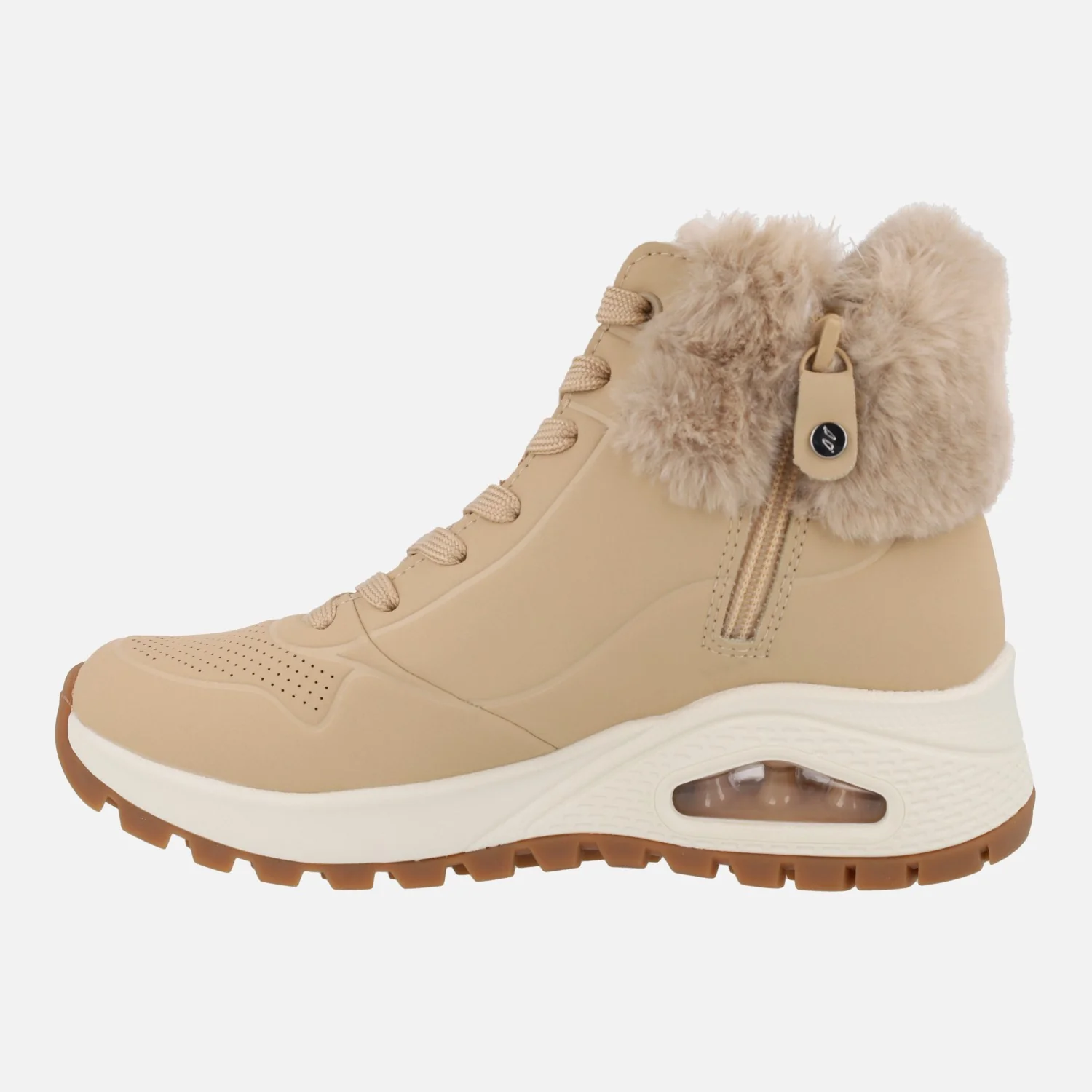 Botines de cordones para mujer de la marca Skechers modelo 167274 Uno Rugged Fall Air Sand. Botines elaborados en materiales sintéticos, con cuello de pelo. Cierre de cordones y además cremallera lateral. Interior textil. Caña de aproximadamente 11 cm de altura. Piso sintético con cámara de aire visible, 5 cm de altura trasera (2 cm parte delantera).