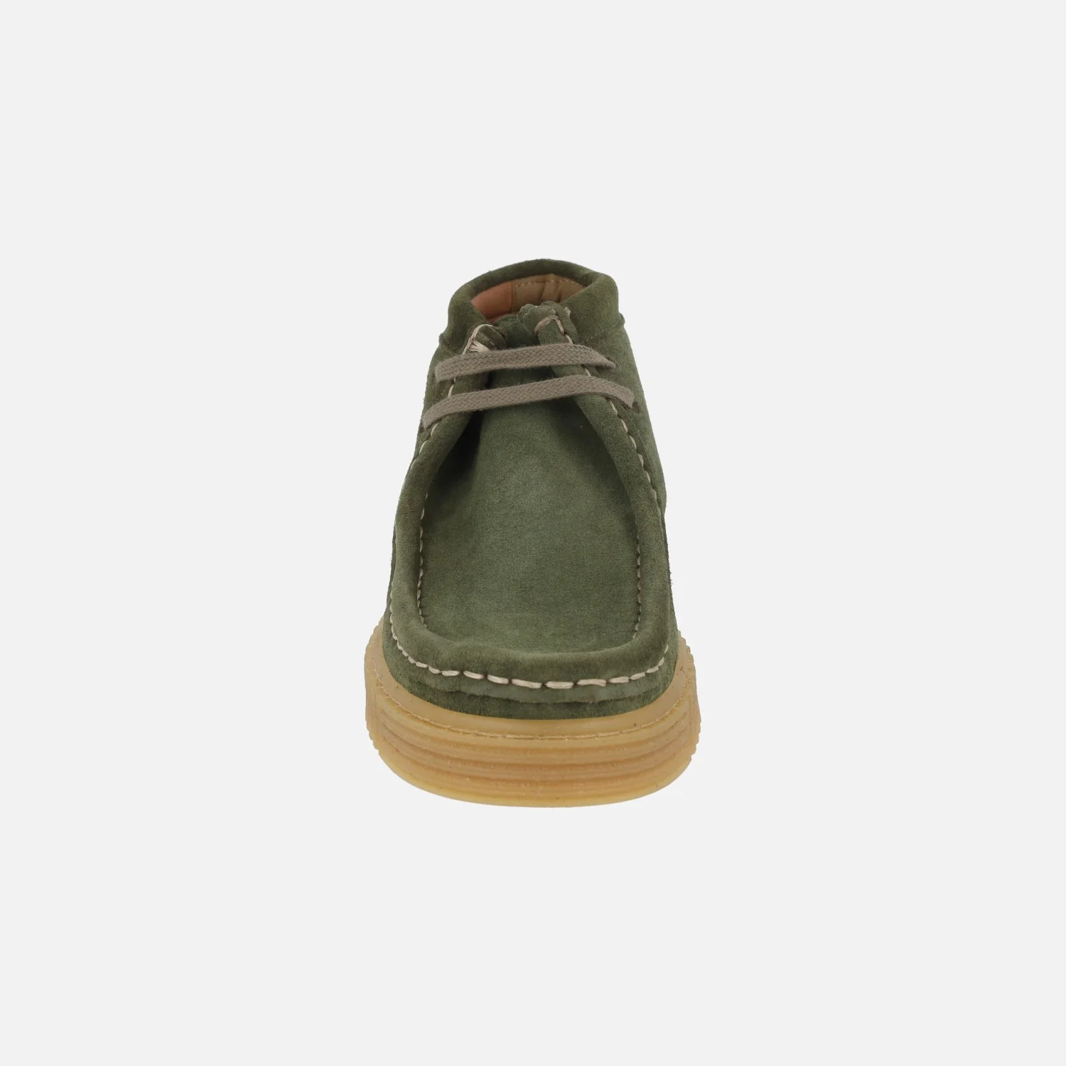 Botines para mujer corte wallabee de la marca Agot, modelo Ant. Fabricados en piel serraje con bordón y cordones, disponibles en verde (musgo) y en marrón (roble). El forro y las plantillas son de material sintético y llevan piso de goma con 3 cm de altura en la parte trasera y 2 cm en la delantera. Caña de 8,5 cms de altura. Made in Spain