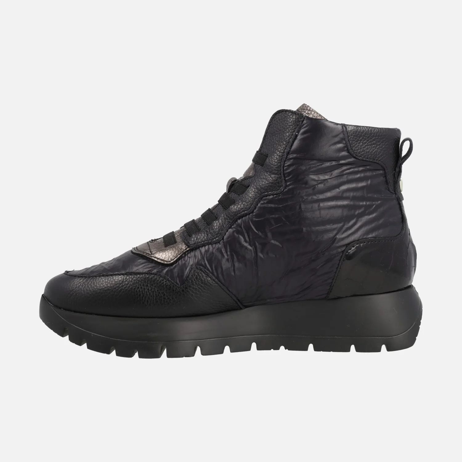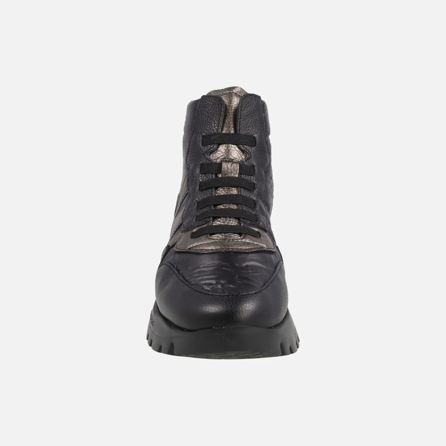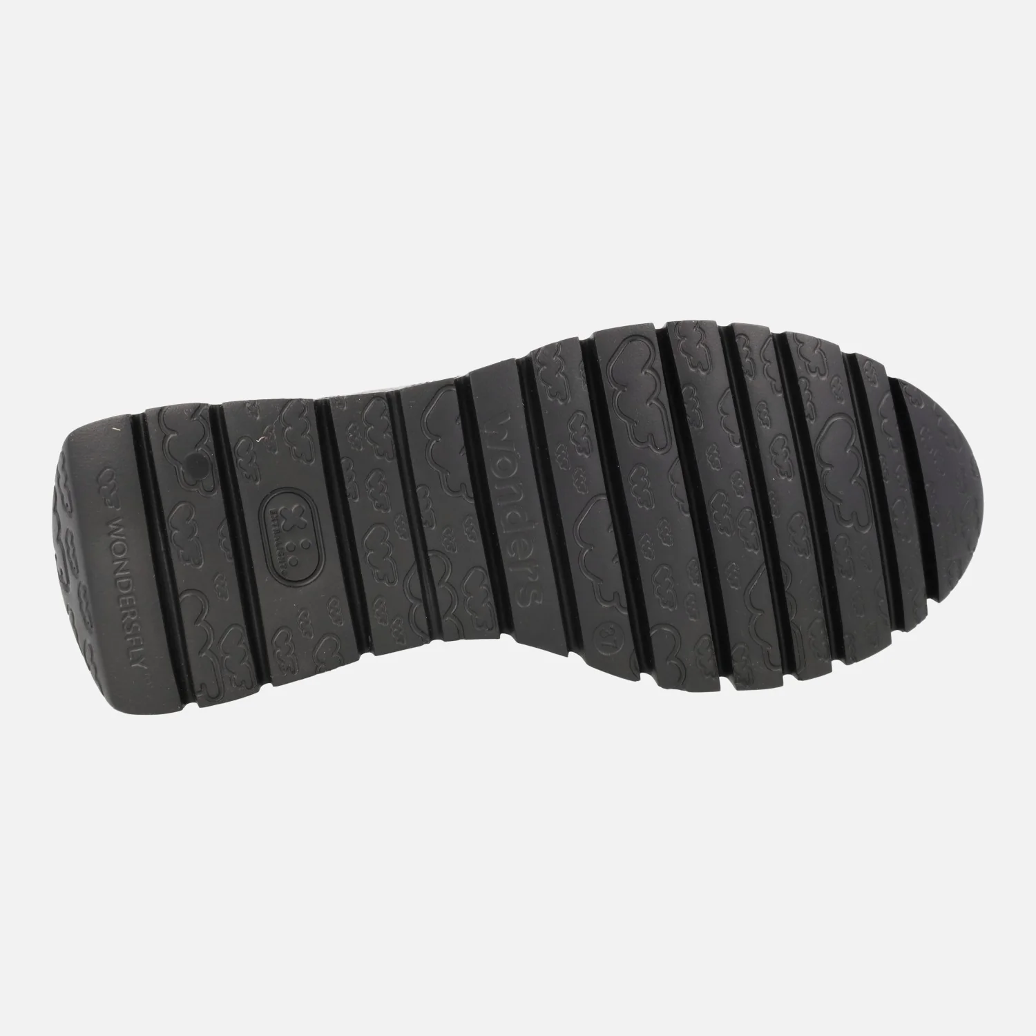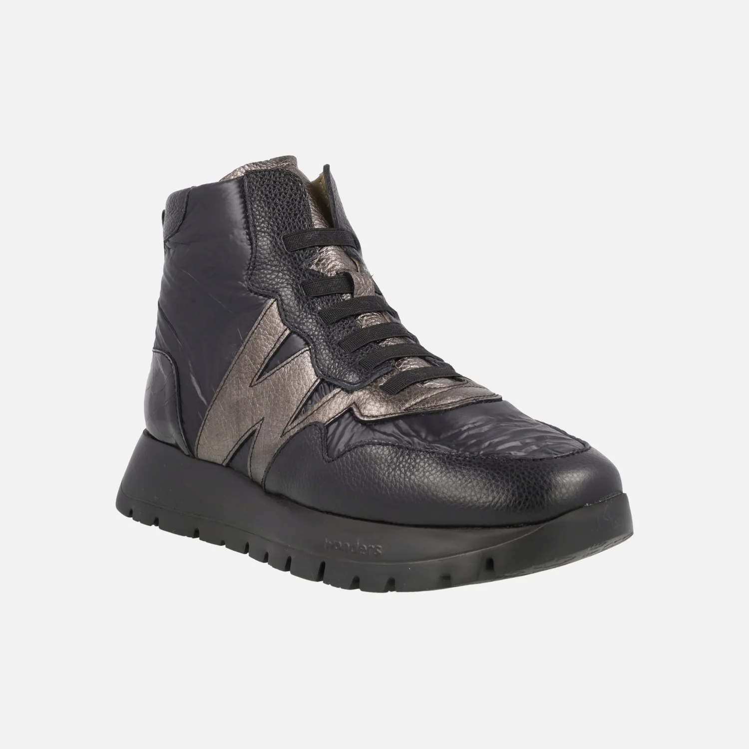 Botines de estilo deportivo de la marca Wonders modelo A-2493 Negro/plomo ODISEI 93. Botines elaborados en tejido nylon negro combinado con piel metalizada en negro y en metalizado plomo. Cierre de cordones elásticos. Interior mixto de piel y tejido, con plantillas extraíbles. Tirador trasero para facilitar el calce. Piso de goma EXTRALIGHT WondersFLY, muy ligero a la par que resistente. Altura de caña 11 cm. Piso de 3,5 cm de altura trasera (2,5 cm altura delantera).