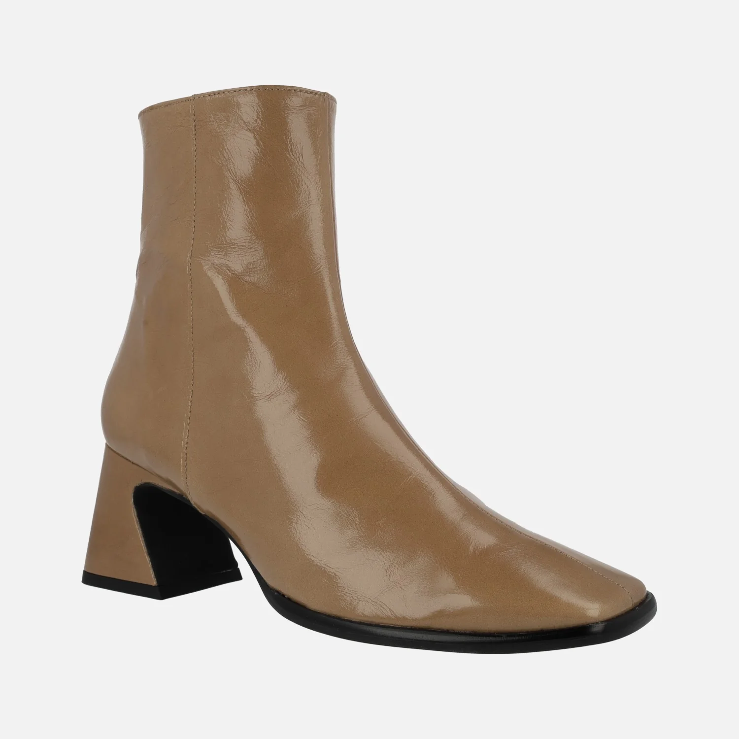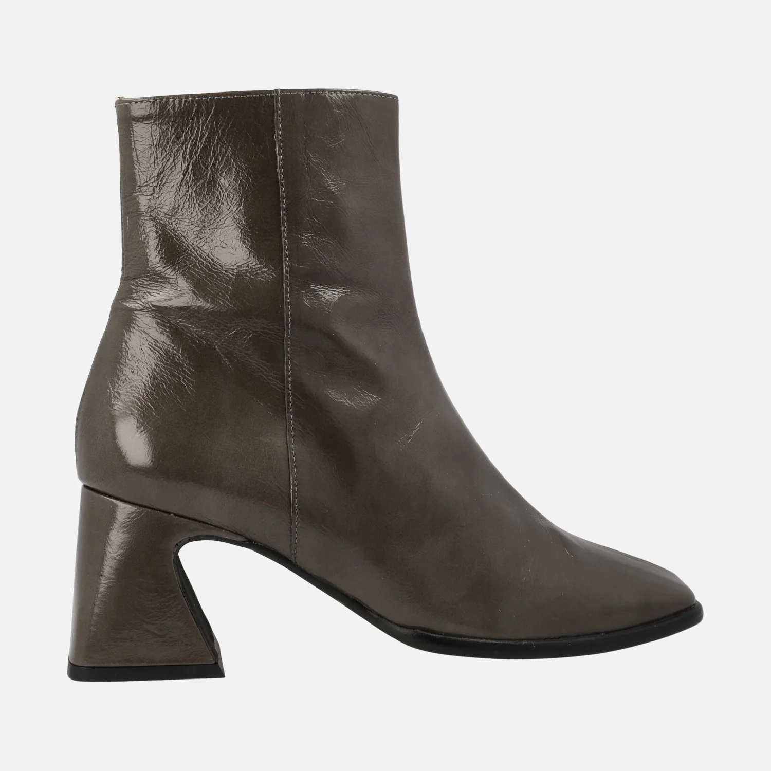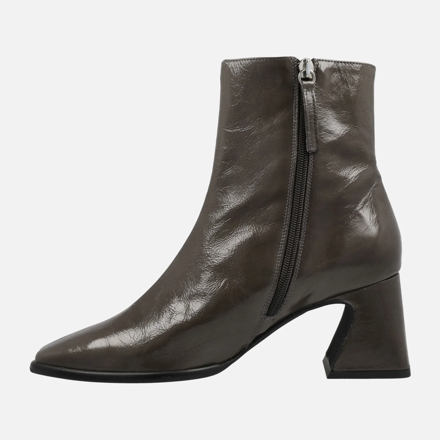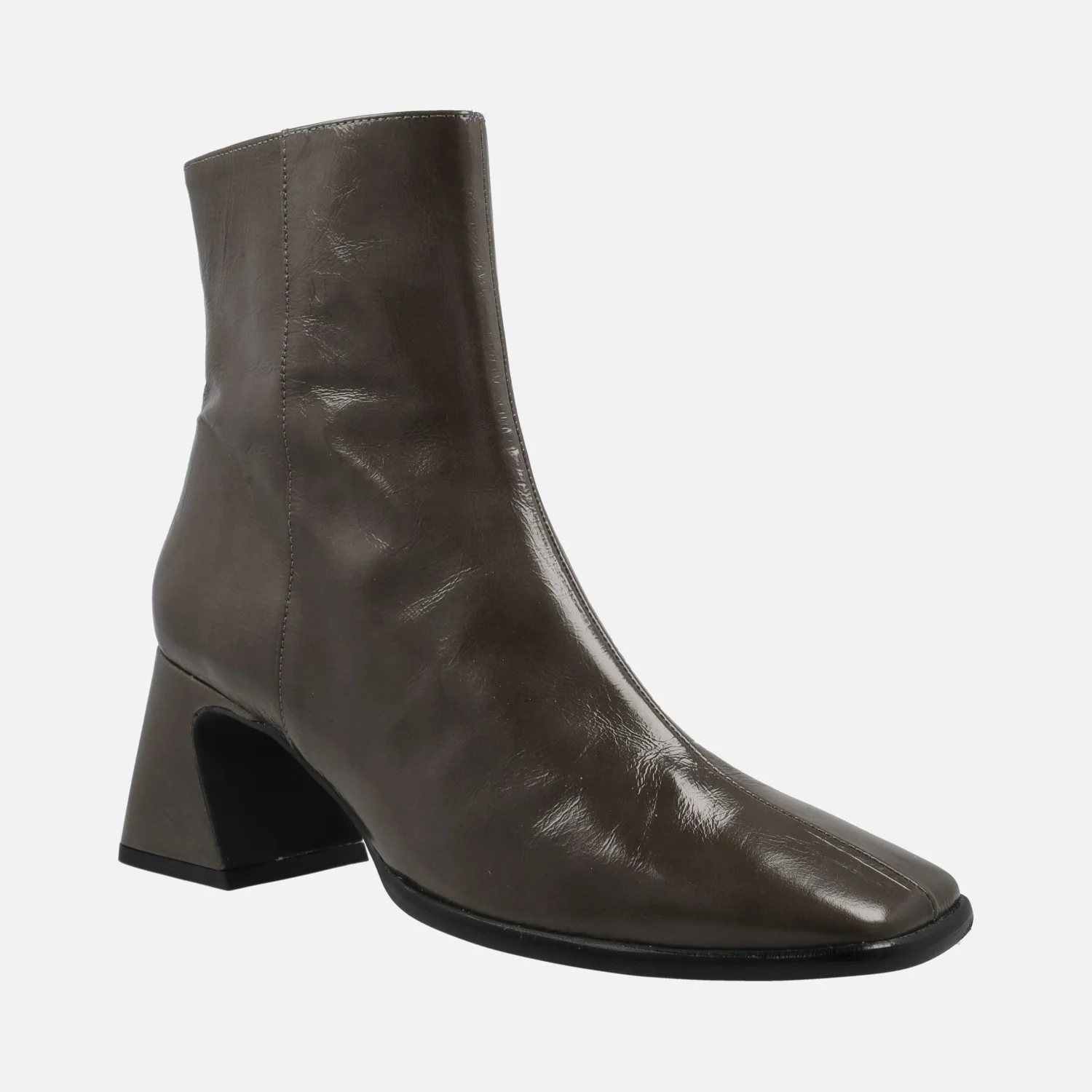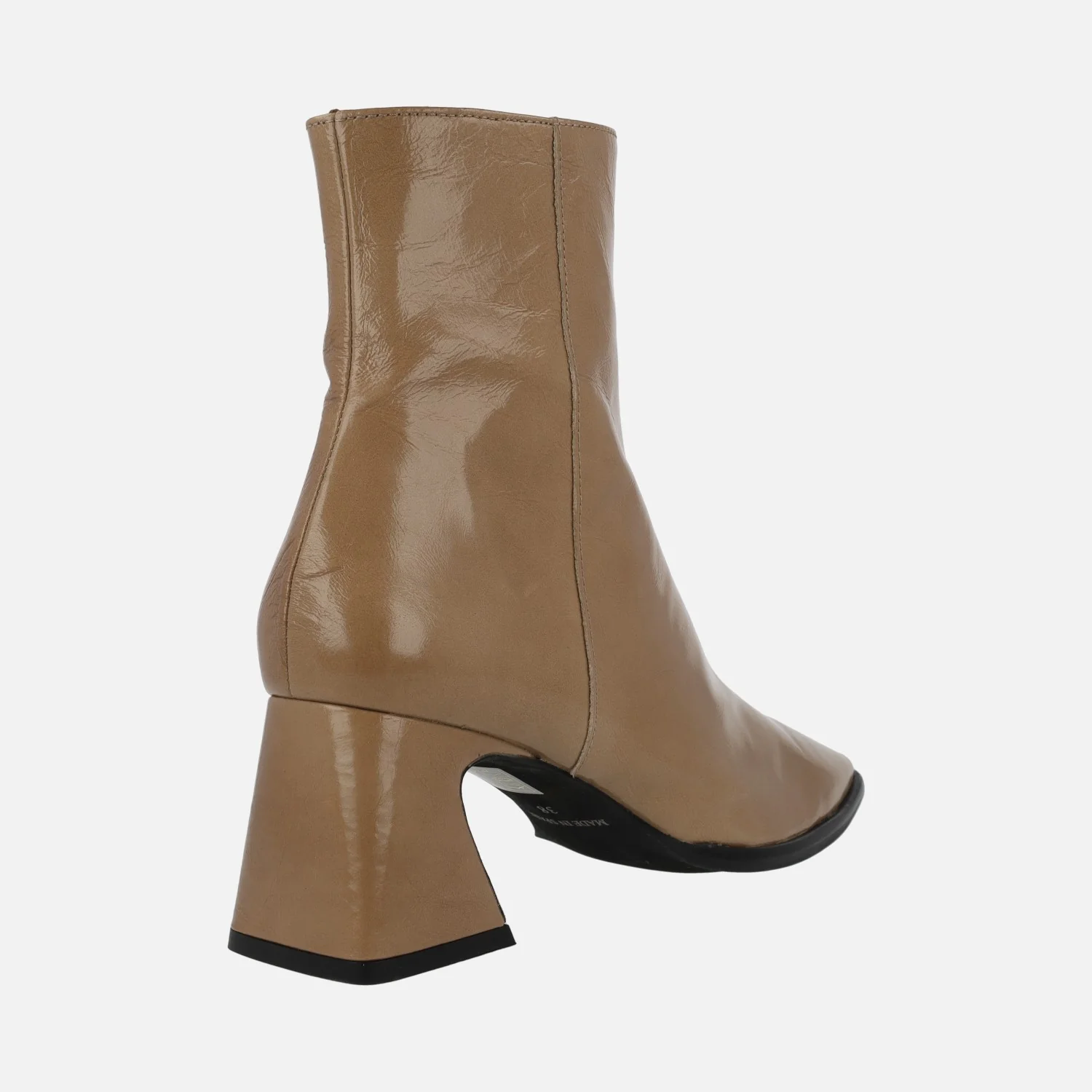Botines de piel acabado brillo para mujer de la marca española Angel Alarcón, modelo 23532, disponibles en camel y en color elefante (gris oscuro). Botines de tacón medio, muy cómodos, con cremallera en el lateral interior. Puntera ligeramente cuadrada. Forro y planta de piel. Tacones forrados, de 7 cms de altura. Caña de 16 cms de altura. Made in Spain.
