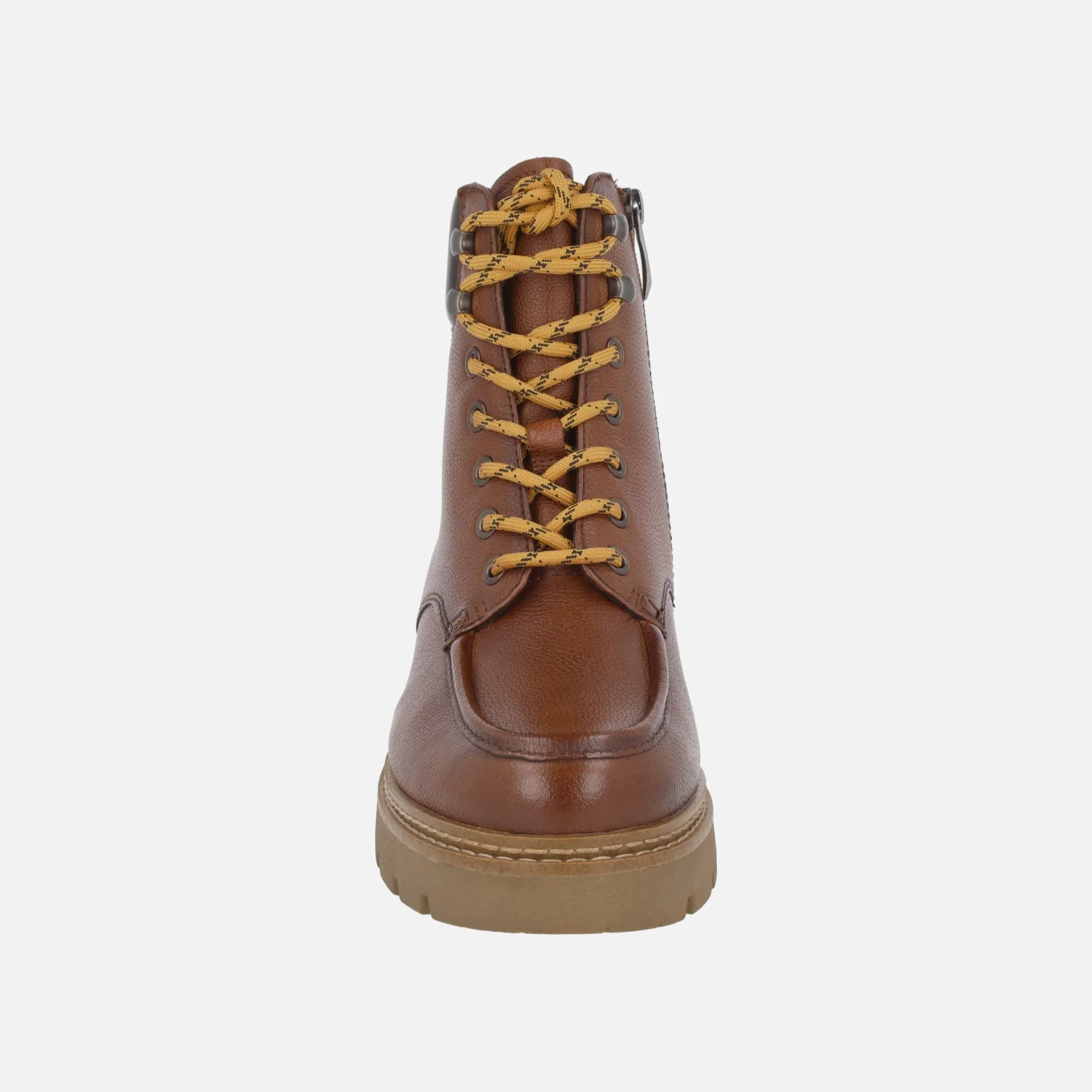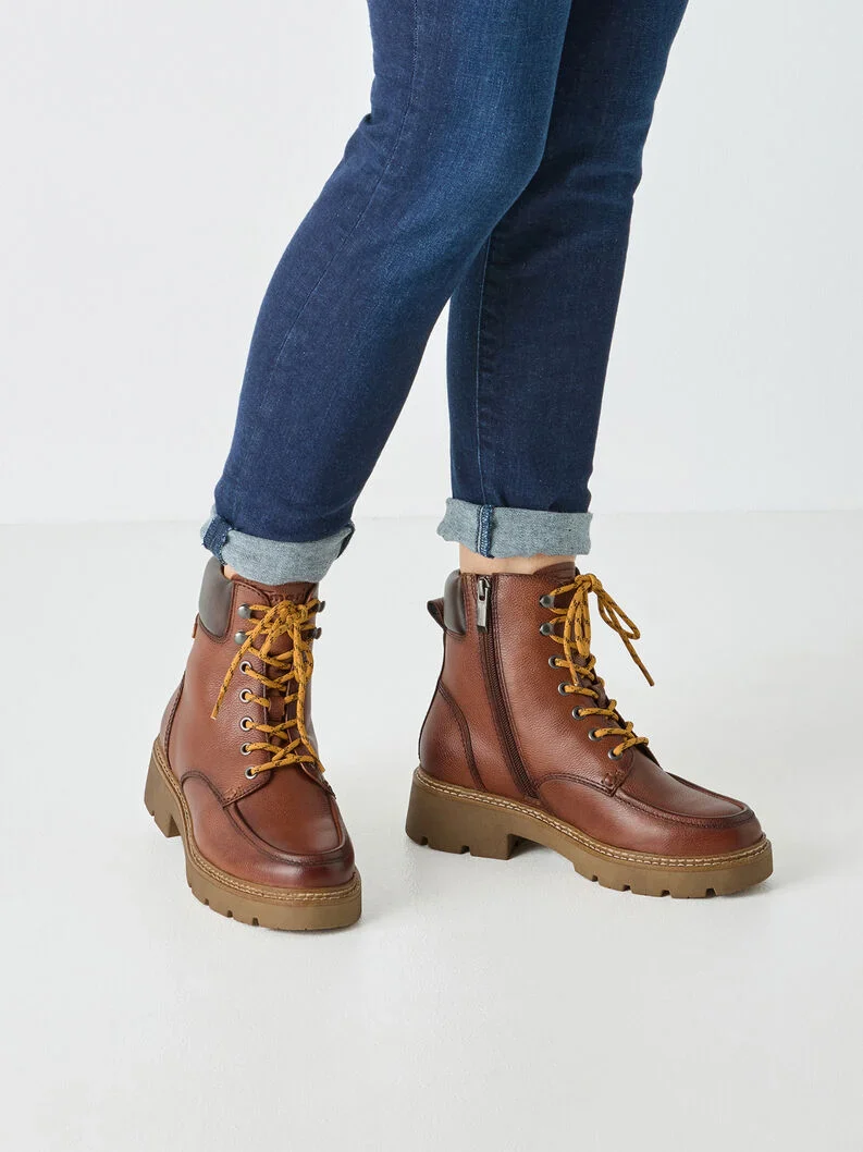Botines de piel para mujer de la marca Tamaris modelo 26903 disponibles en piel cognac o serraje marrón. Botines con exterior de piel combinado con materiales sintéticos. Cierre de cordones y además cremallera lateral. Interior en pelo, plantillas extraíbles forradas de pelo. Piso sintético, con 4 cm de altura de tacón (2 cm plataforma delantera). Caña de 13,5 cm.